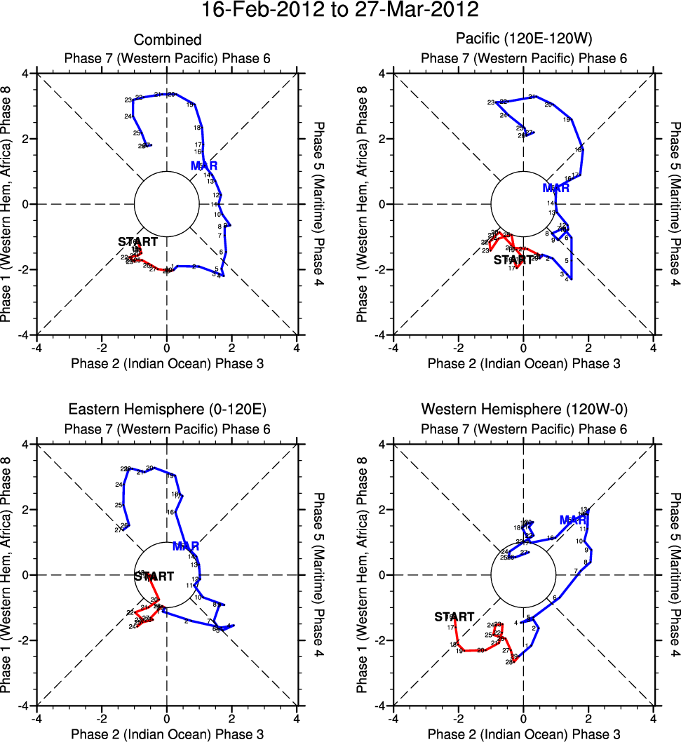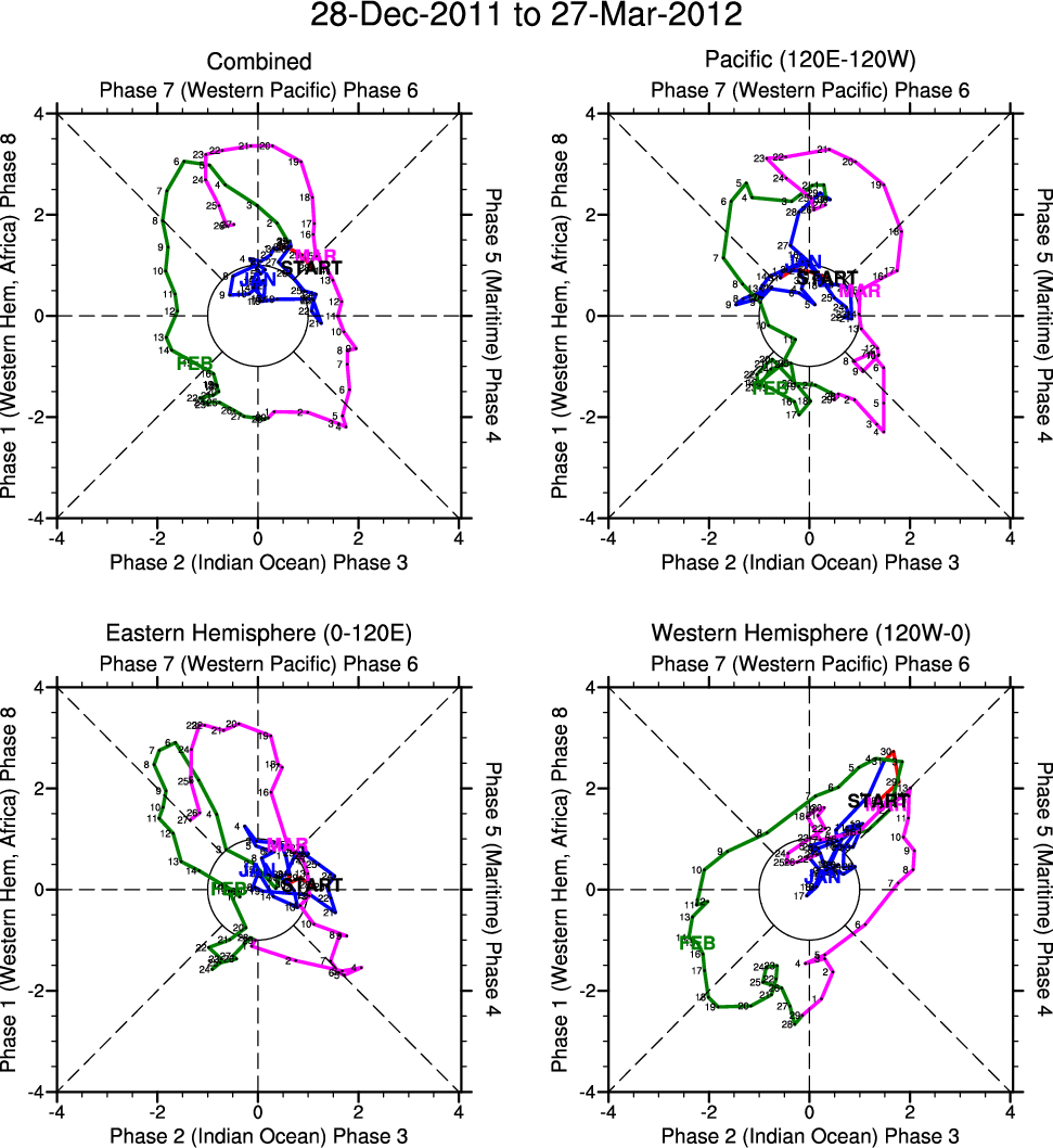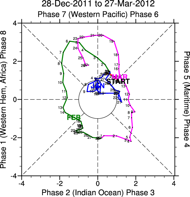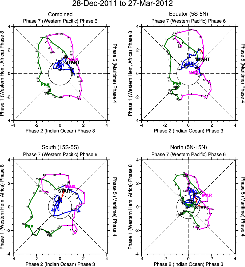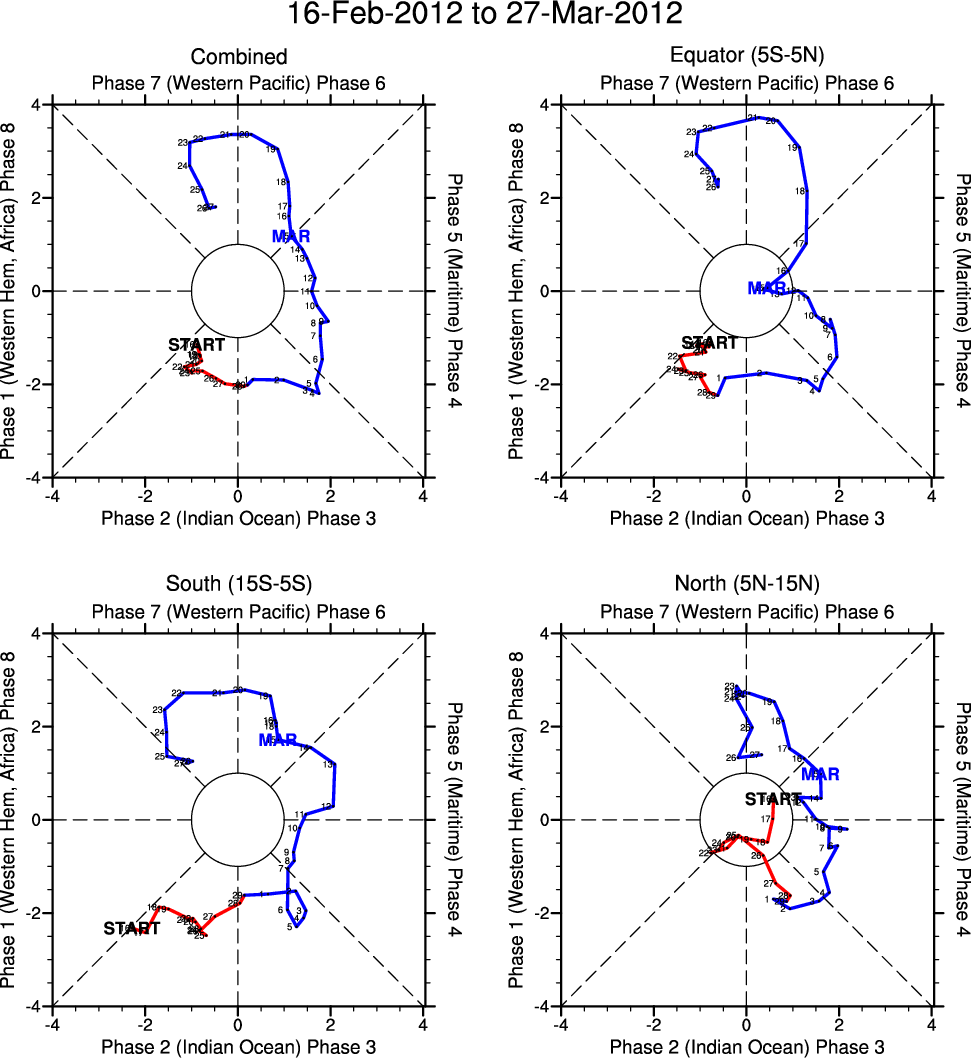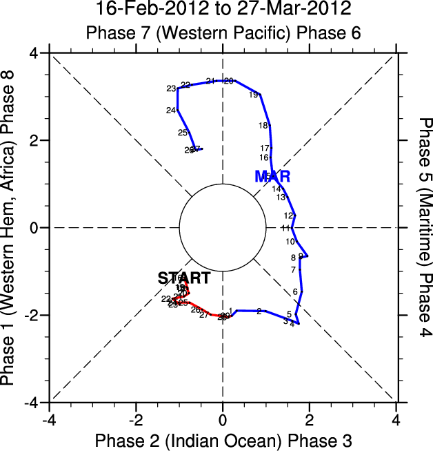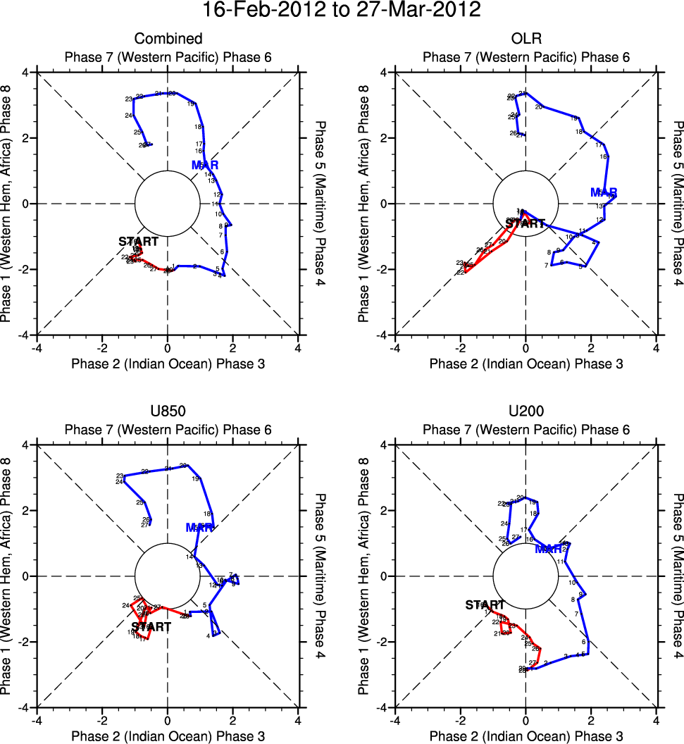 Wheeler and Hendon (2004) constructed the RMM index for monitoring the MJO. This index consists of the first two principal components (PCs) of OLR, 850-hPa zonal wind, and 200-hPa zonal wind averaged 15S-15N.