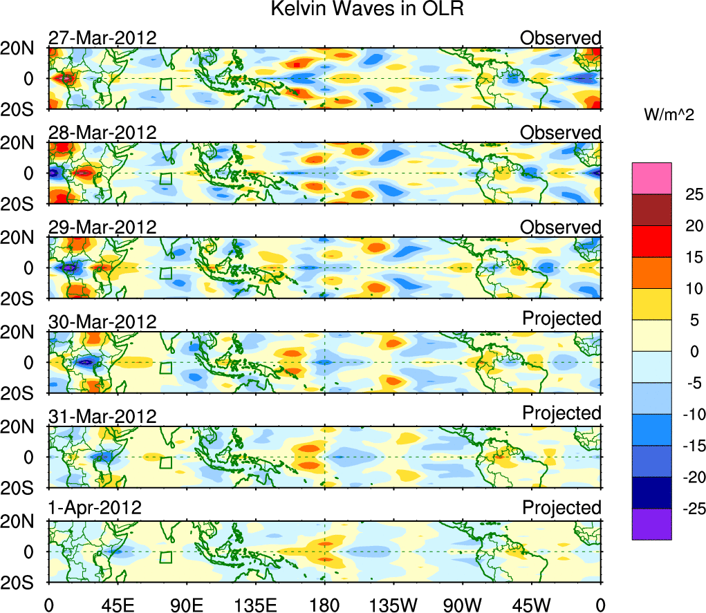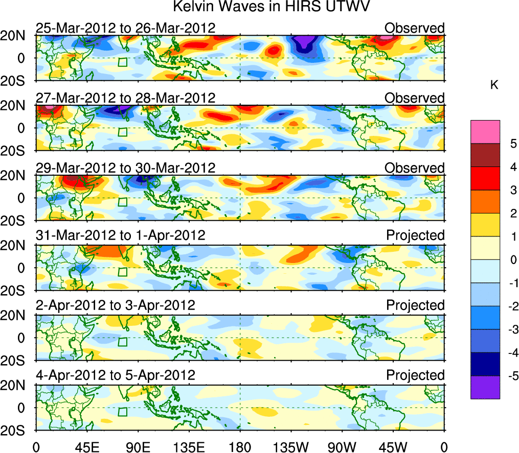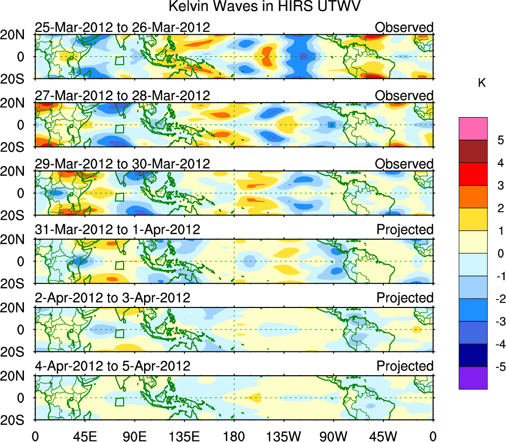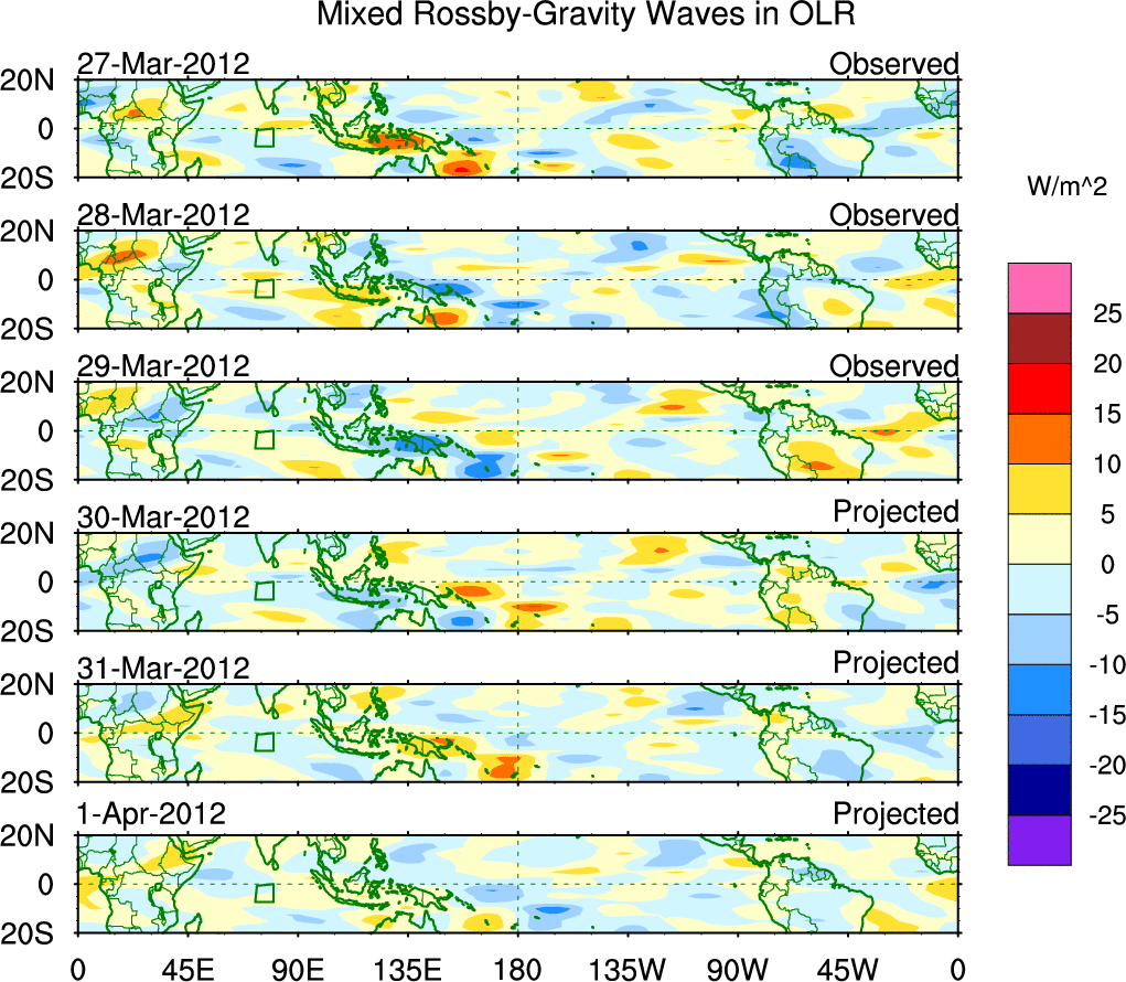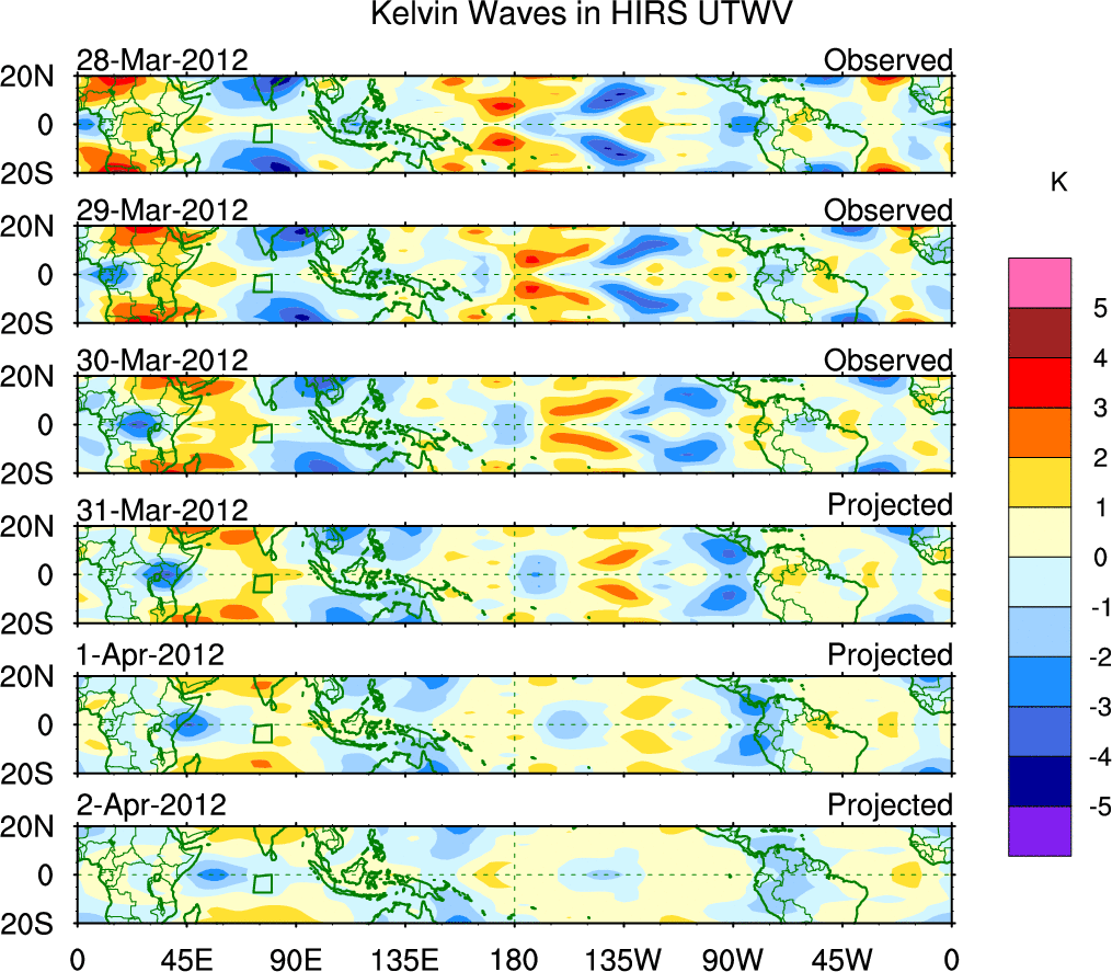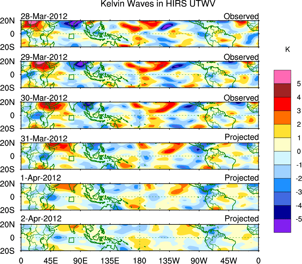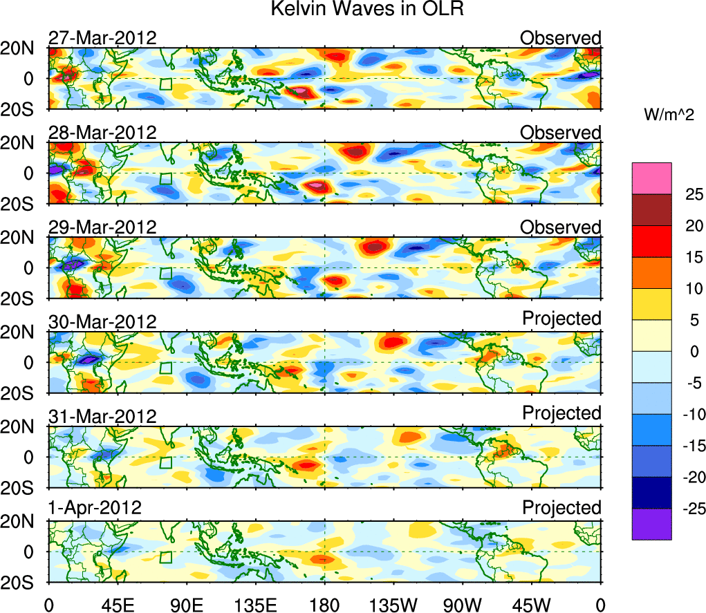 To identify tropical waves in near real-time, the OLR and UTWV data are filtered following Wheeler & Weickmann (2001 MWR). The daily anomalies are calculated using the first 3 harmonics of the seasonal cycle for 1979–2009. Missing values are then filled using linear interpolation in space and time. The most recent 365 days of anomalies are padded with 659 days of zeroes, and the result is filtered for each wave type.
