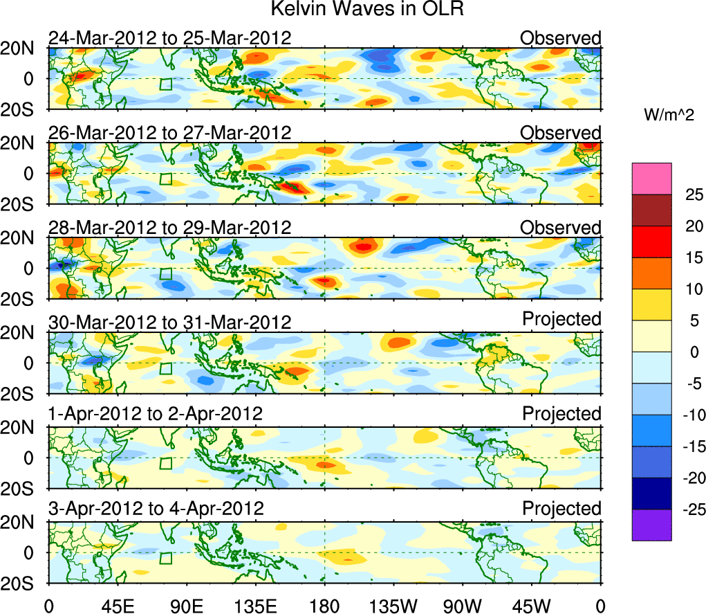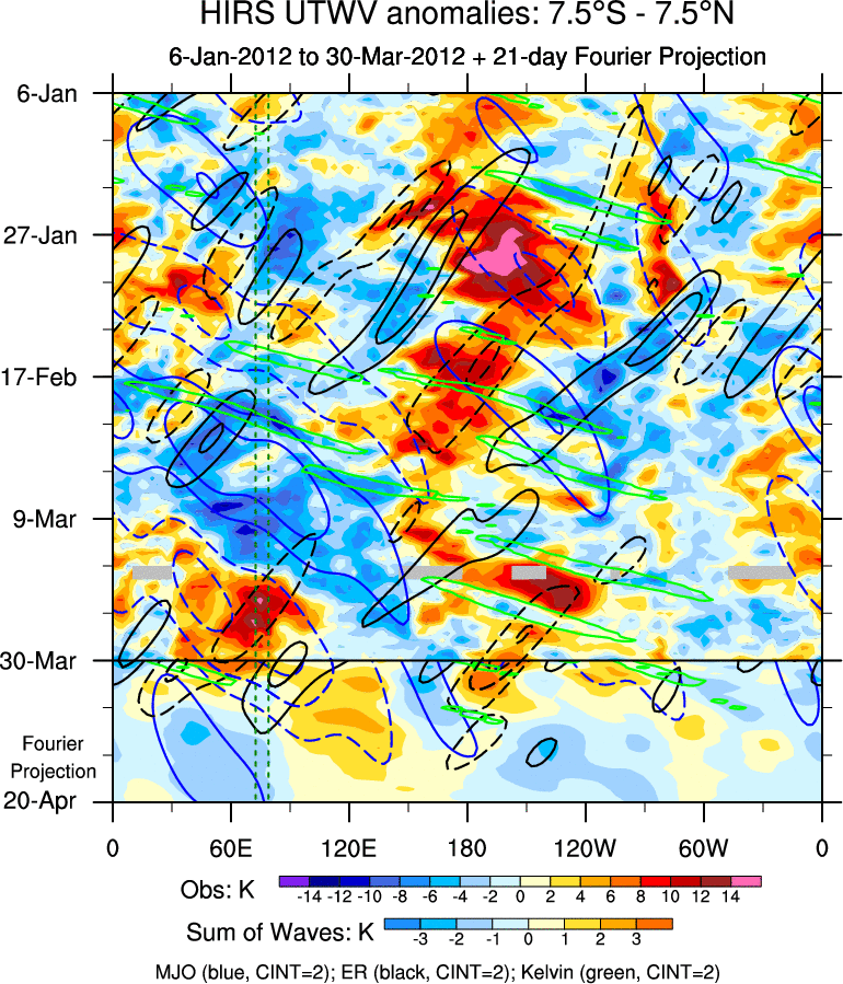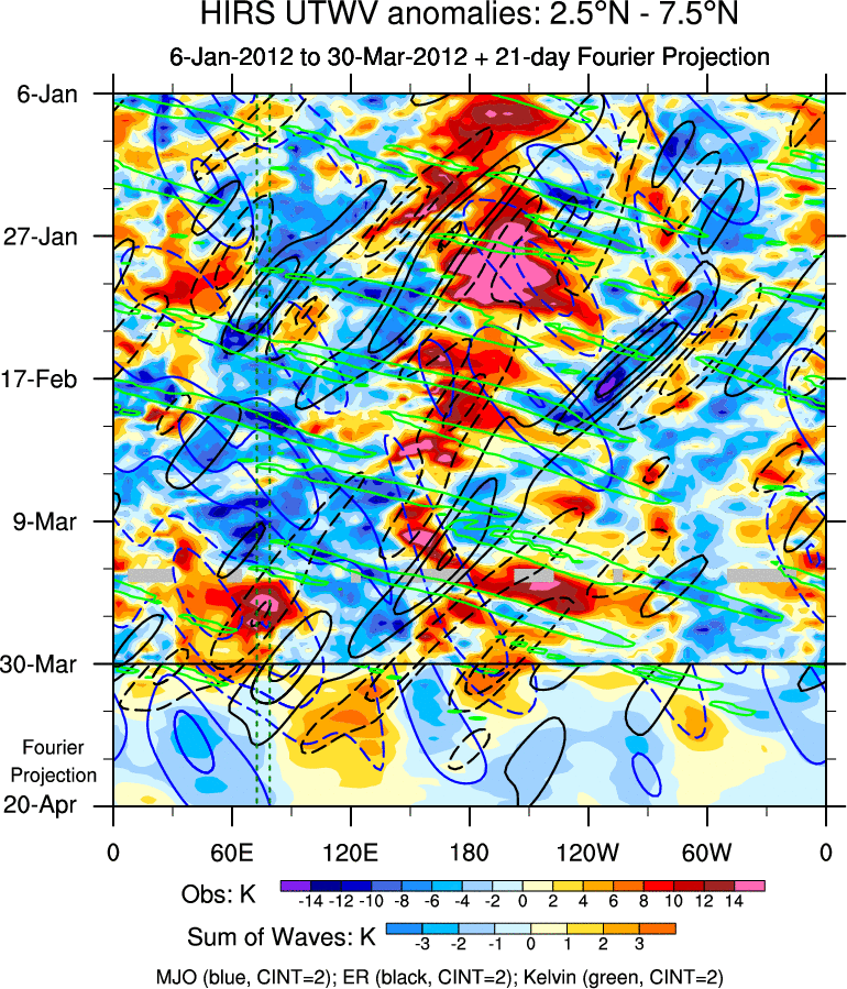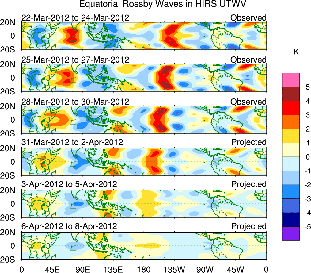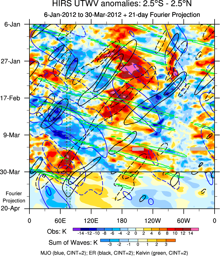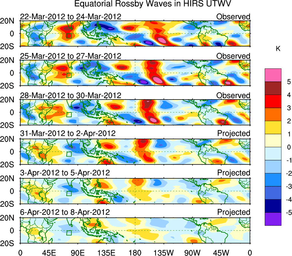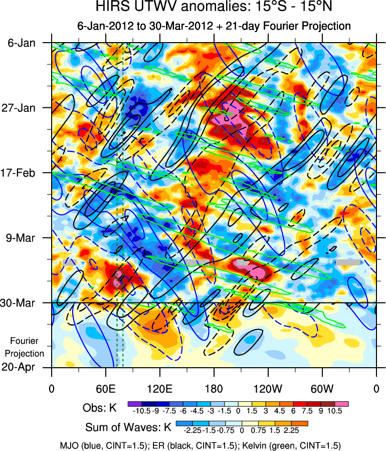 To identify tropical waves in near real-time, the OLR and UTWV data are filtered following Wheeler & Weickmann (2001 MWR). The daily anomalies are calculated using the first 3 harmonics of the seasonal cycle for 1979–2009. Missing values are then filled using linear interpolation in space and time. The most recent 365 days of anomalies are padded with 659 days of zeroes, and the result is filtered for each wave type.