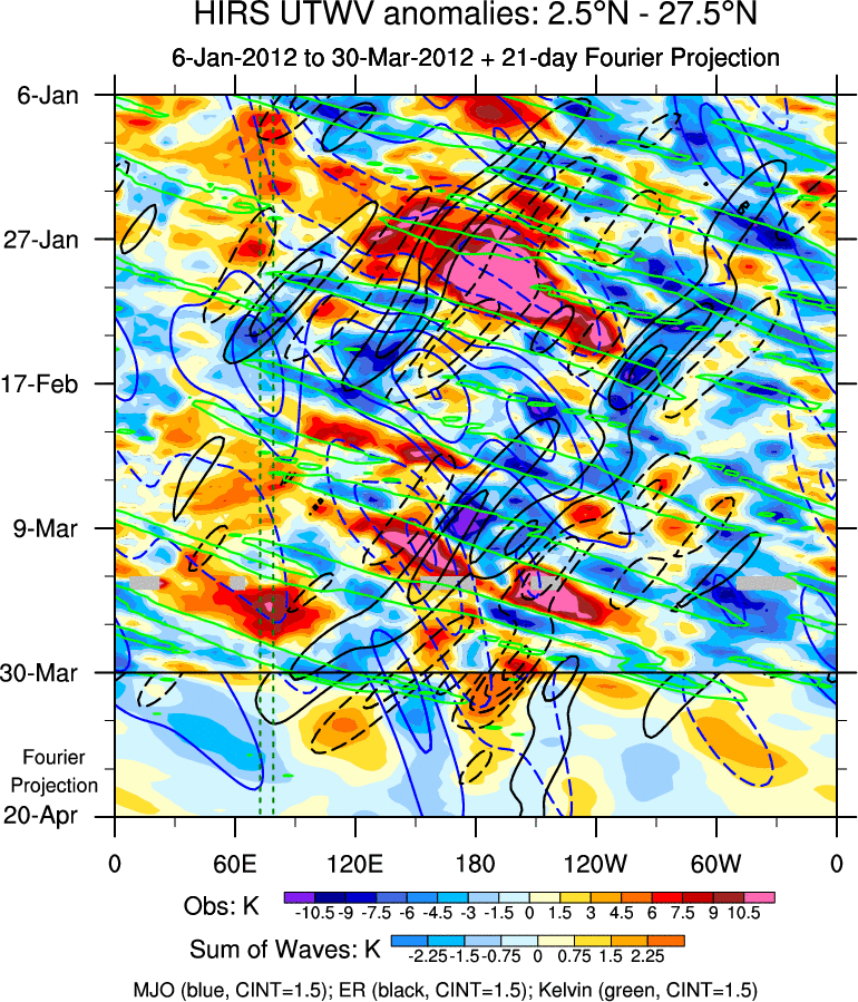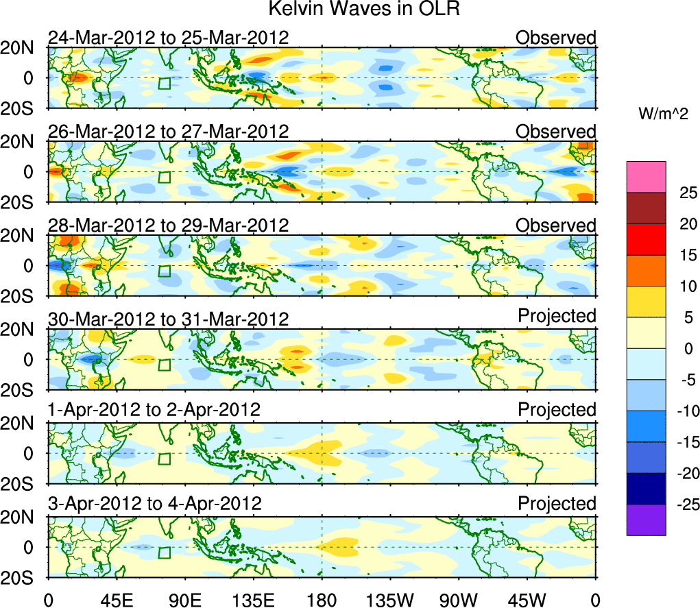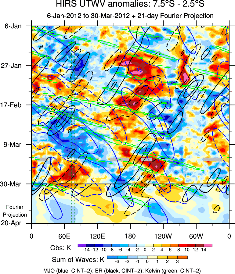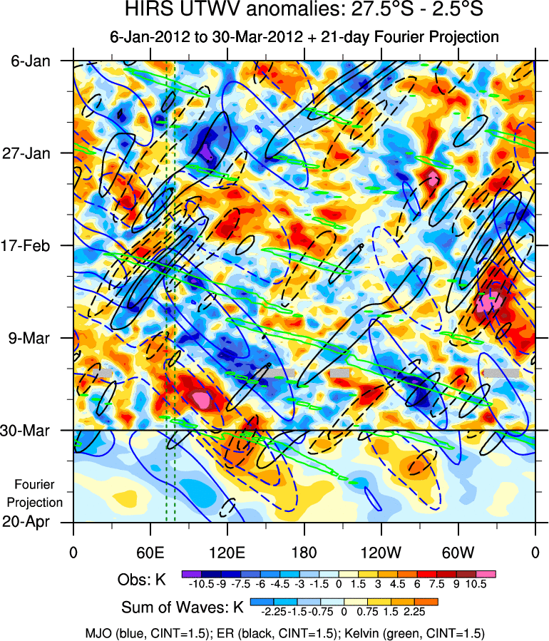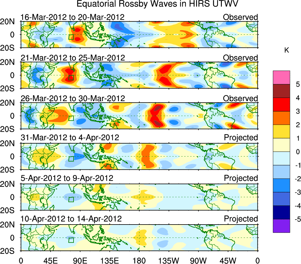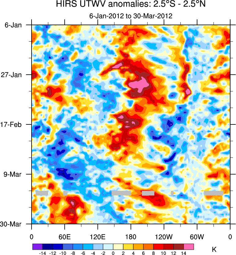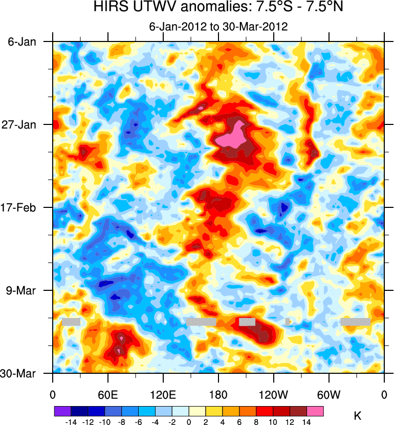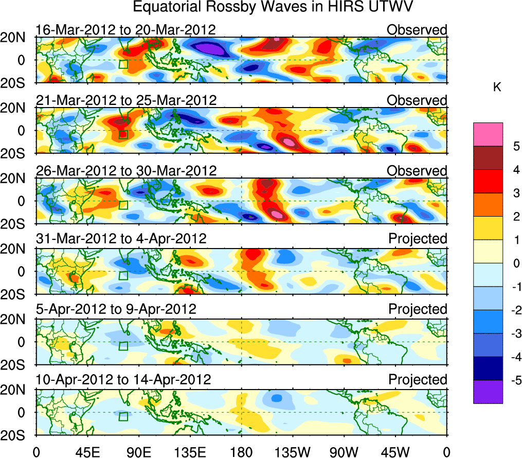 To identify tropical waves in near real-time, the OLR and UTWV data are filtered following Wheeler & Weickmann (2001 MWR). The daily anomalies are calculated using the first 3 harmonics of the seasonal cycle for 1979–2009. Missing values are then filled using linear interpolation in space and time. The most recent 365 days of anomalies are padded with 659 days of zeroes, and the result is filtered for each wave type.