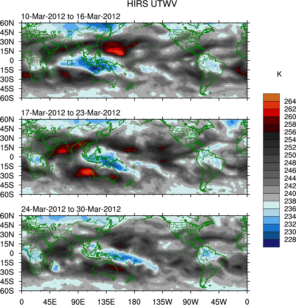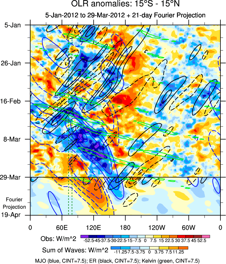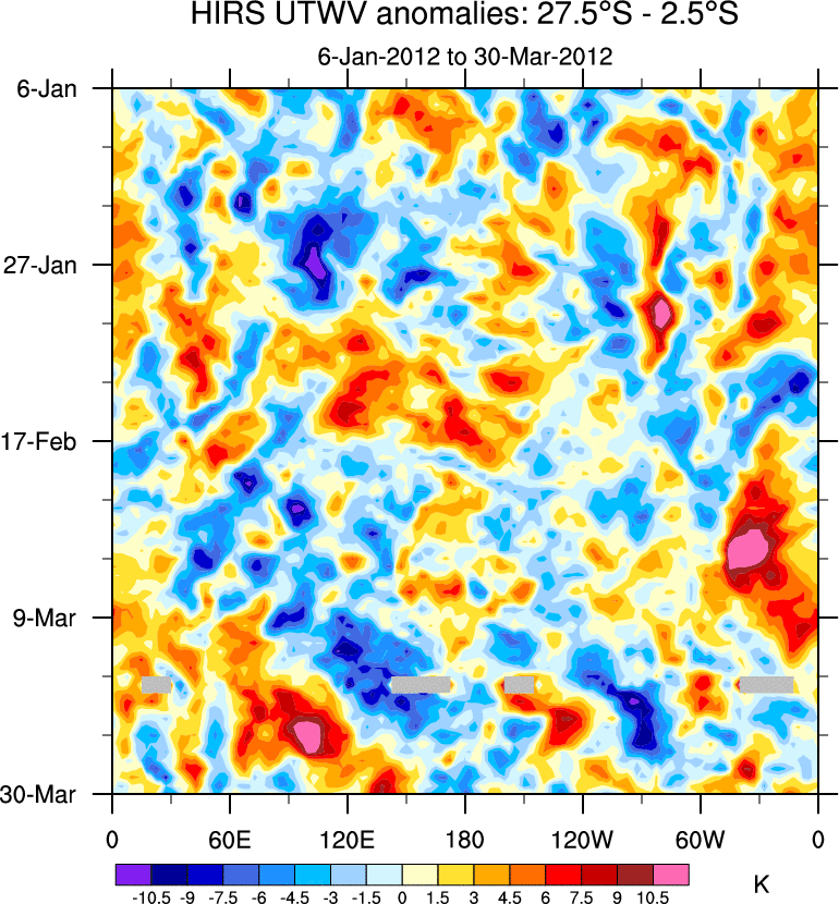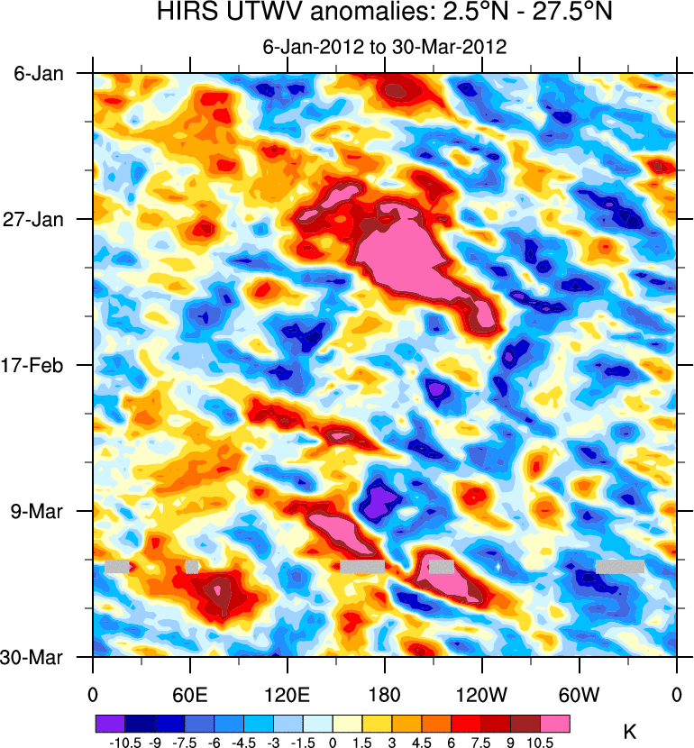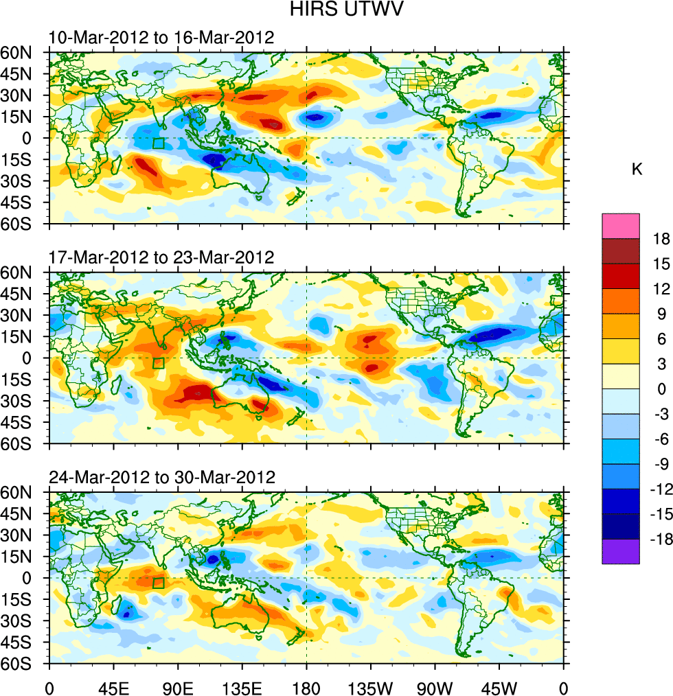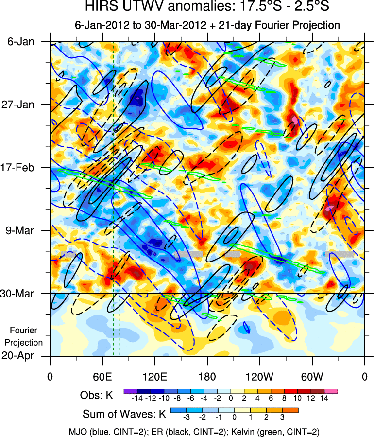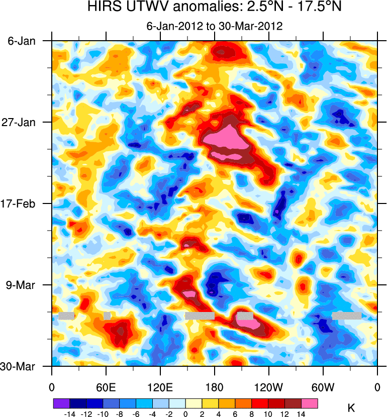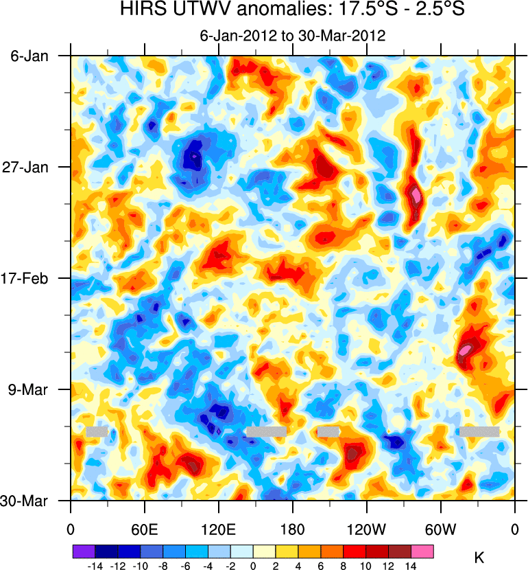To identify tropical waves in near real-time, the OLR and UTWV data are filtered following Wheeler & Weickmann (2001 MWR). The daily anomalies are calculated using the first 3 harmonics of the seasonal cycle for 1979–2009. Missing values are then filled using linear interpolation in space and time. The most recent 365 days of anomalies are padded with 659 days of zeroes, and the result is filtered for each wave type.