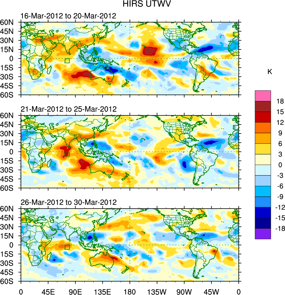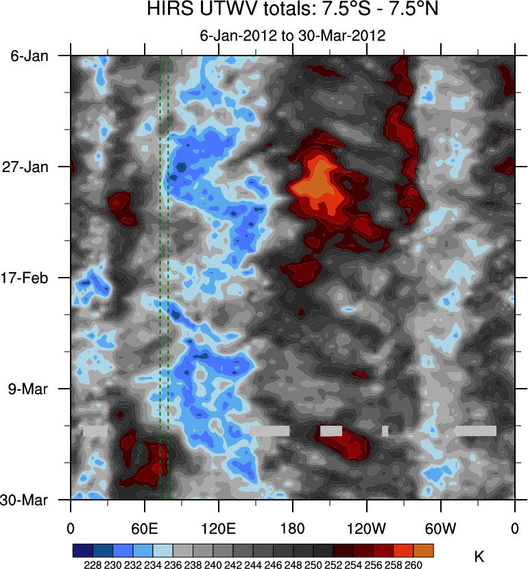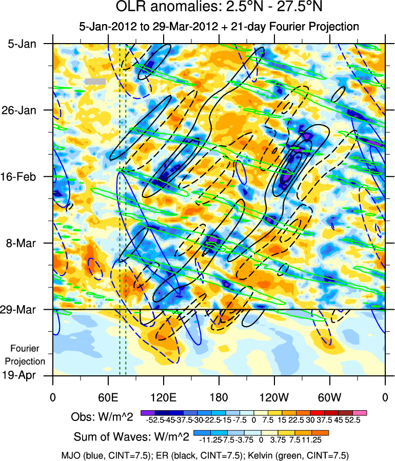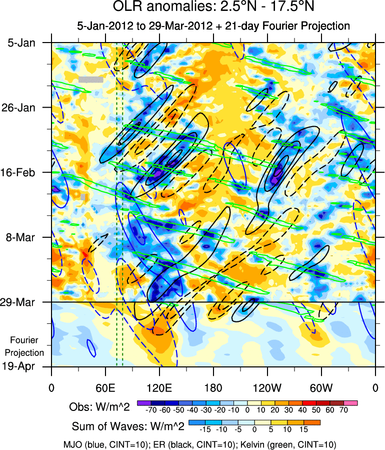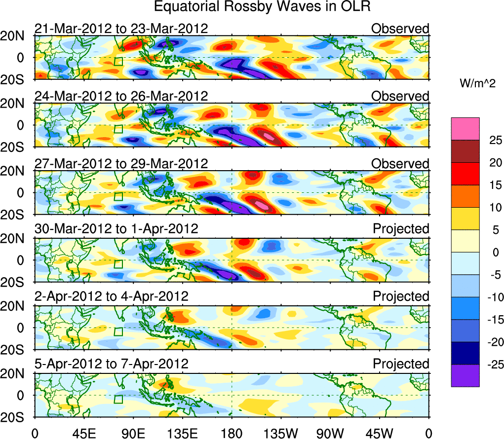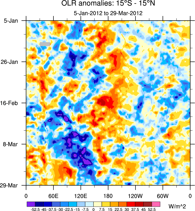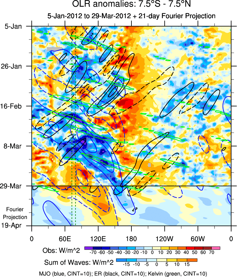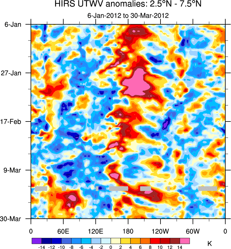 To identify tropical waves in near real-time, the OLR and UTWV data are filtered following Wheeler & Weickmann (2001 MWR). The daily anomalies are calculated using the first 3 harmonics of the seasonal cycle for 1979–2009. Missing values are then filled using linear interpolation in space and time. The most recent 365 days of anomalies are padded with 659 days of zeroes, and the result is filtered for each wave type.