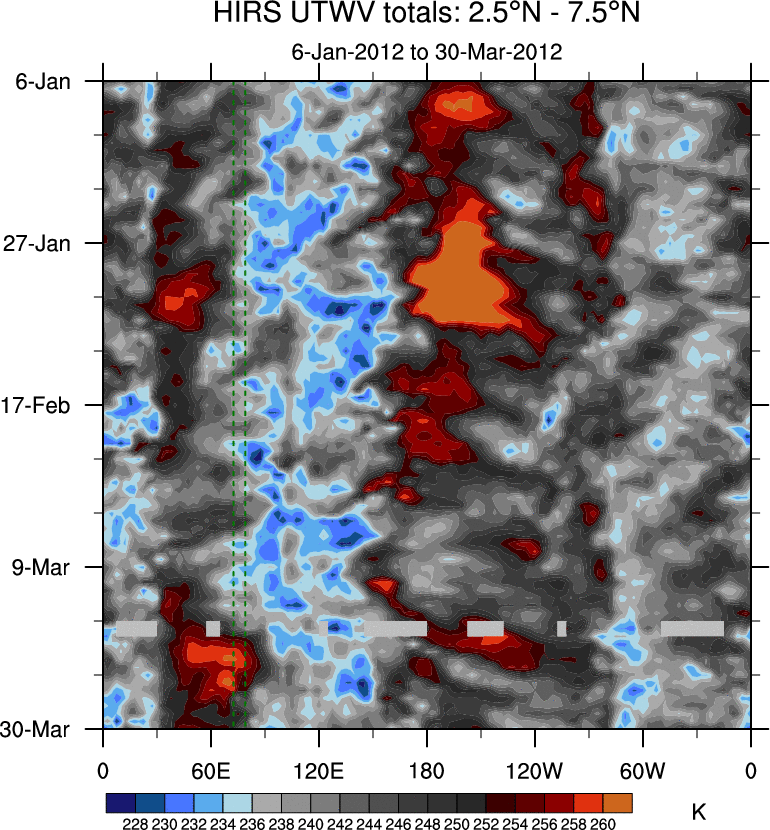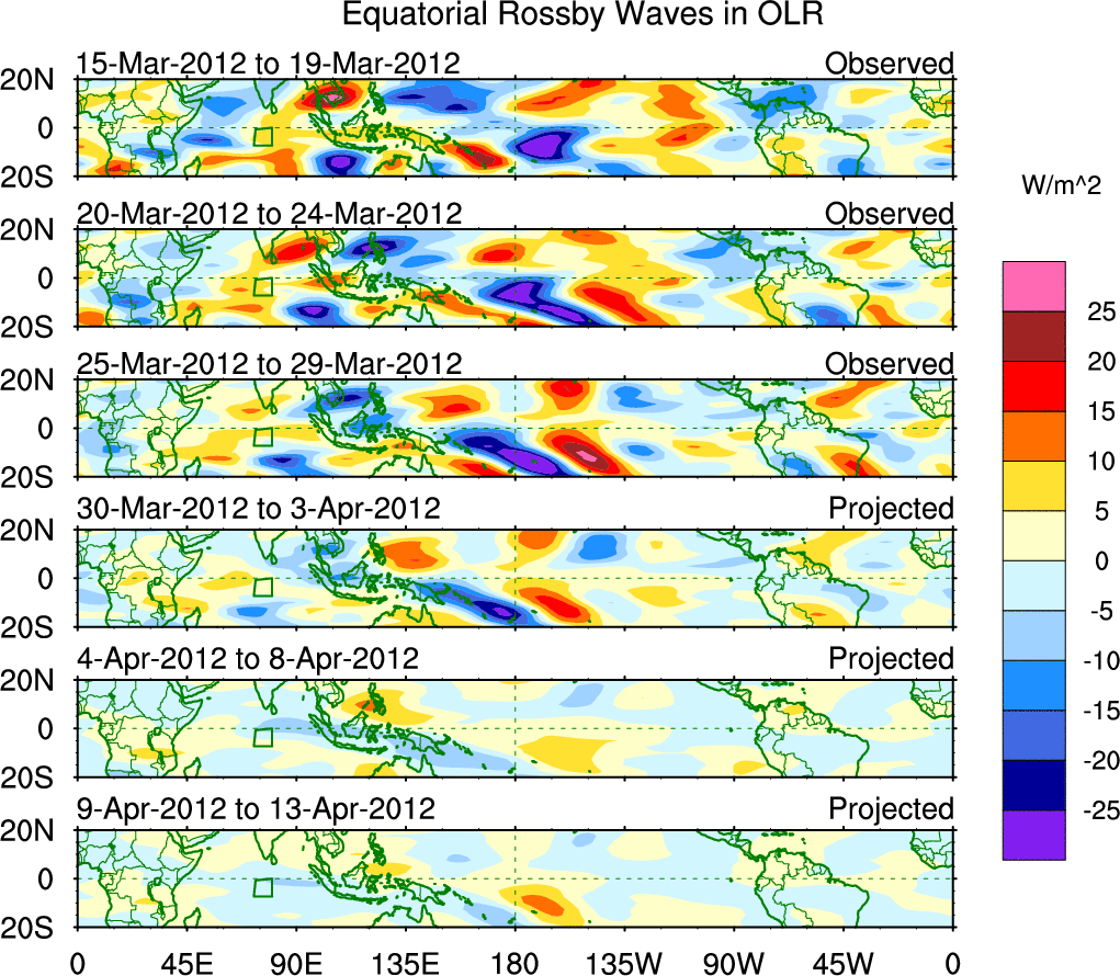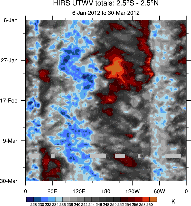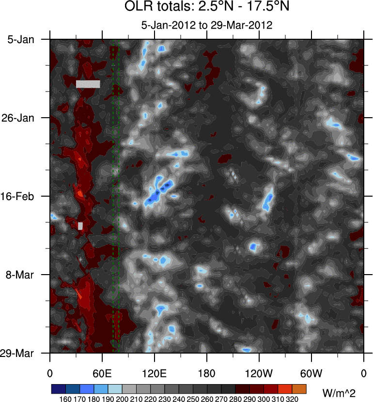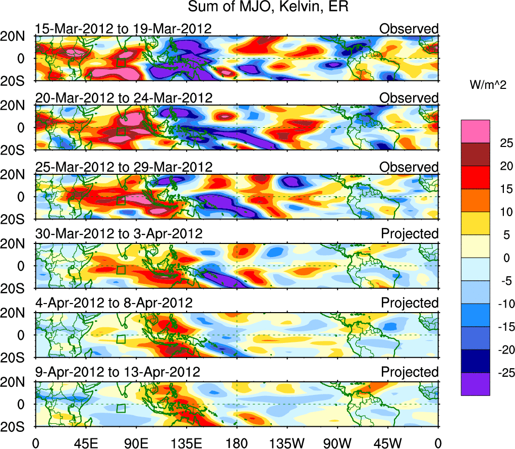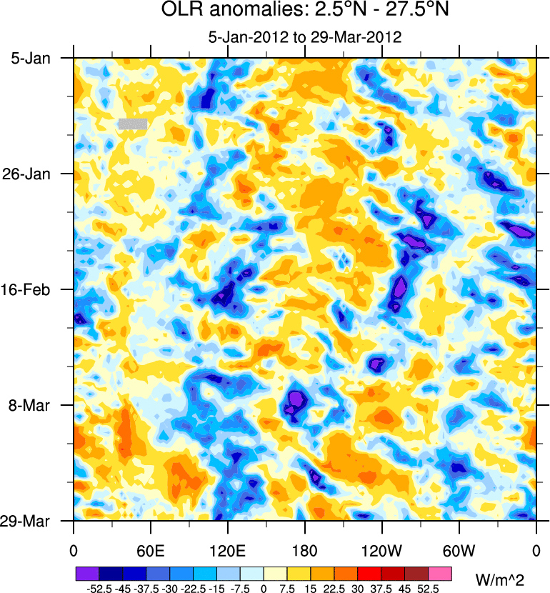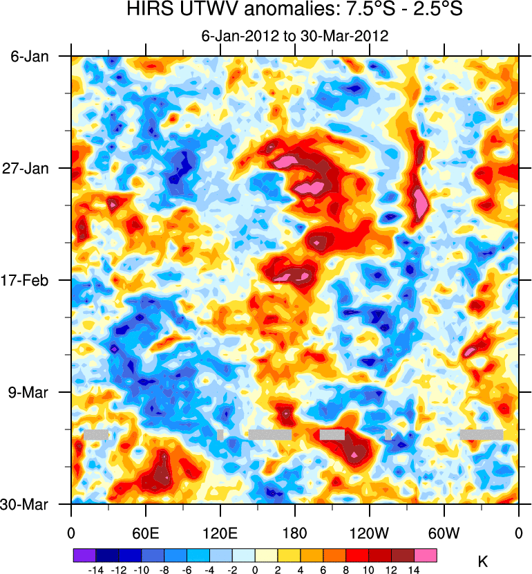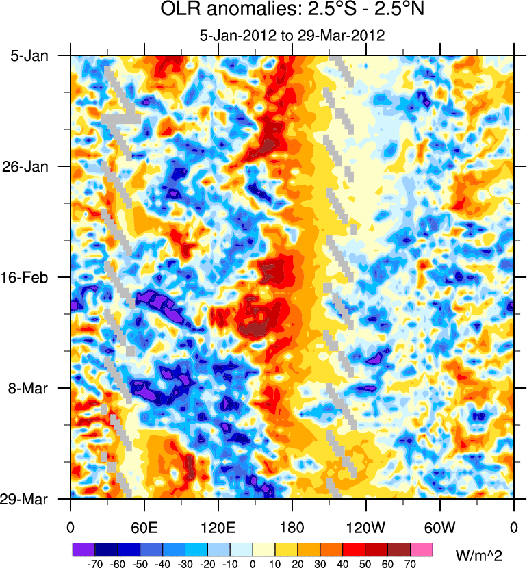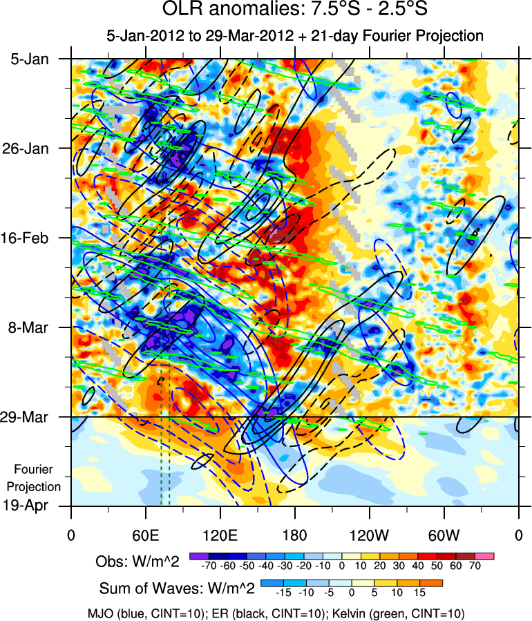 To identify tropical waves in near real-time, the OLR and UTWV data are filtered following Wheeler & Weickmann (2001 MWR). The daily anomalies are calculated using the first 3 harmonics of the seasonal cycle for 1979–2009. Missing values are then filled using linear interpolation in space and time. The most recent 365 days of anomalies are padded with 659 days of zeroes, and the result is filtered for each wave type.