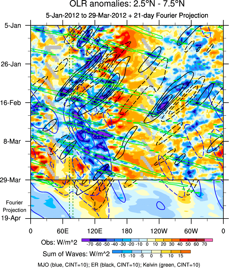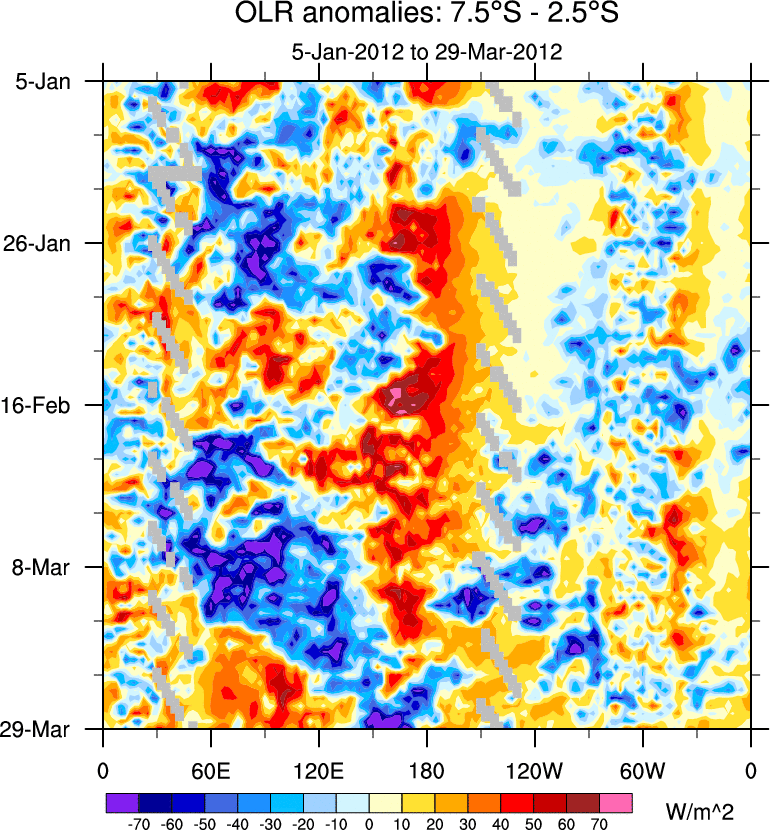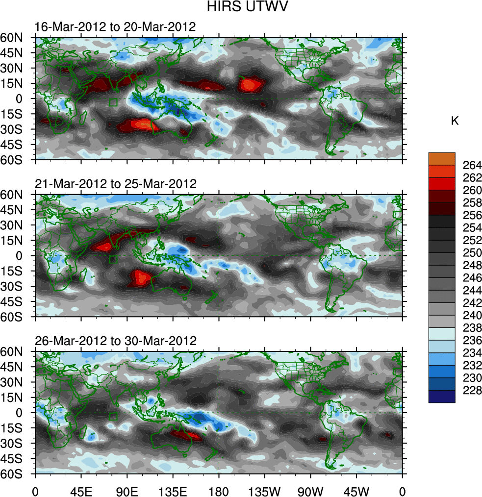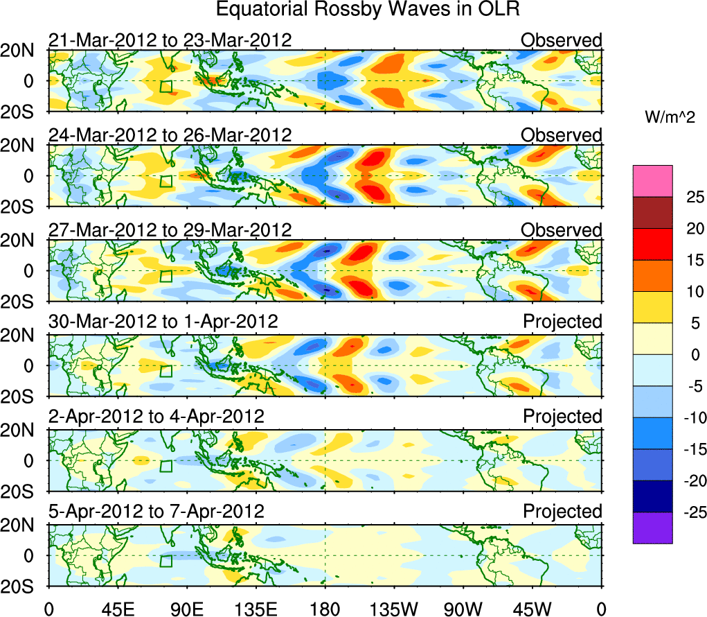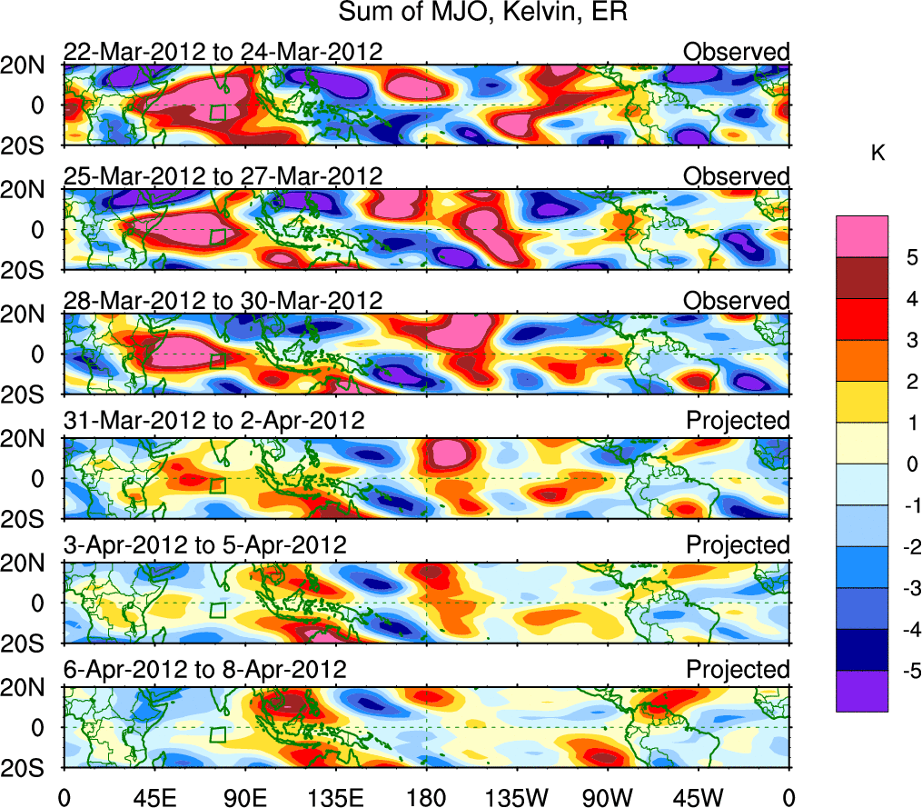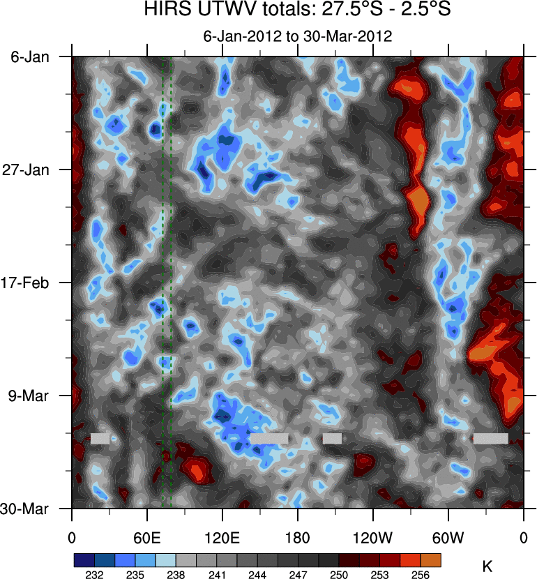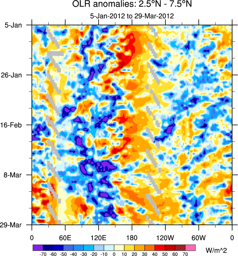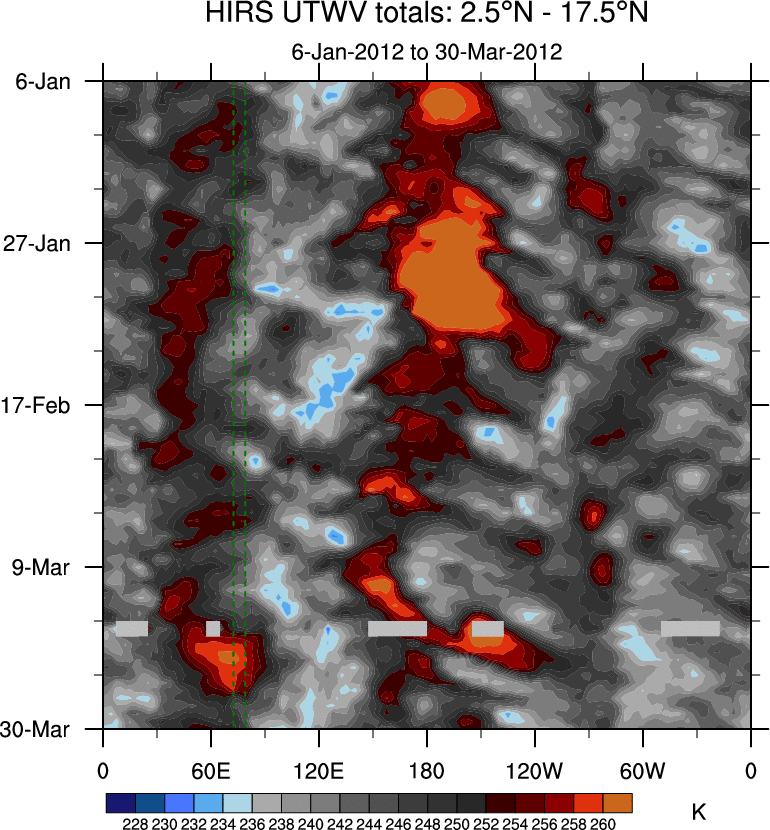 To identify tropical waves in near real-time, the OLR and UTWV data are filtered following Wheeler & Weickmann (2001 MWR). The daily anomalies are calculated using the first 3 harmonics of the seasonal cycle for 1979–2009. Missing values are then filled using linear interpolation in space and time. The most recent 365 days of anomalies are padded with 659 days of zeroes, and the result is filtered for each wave type.