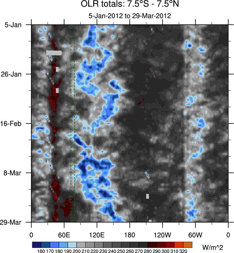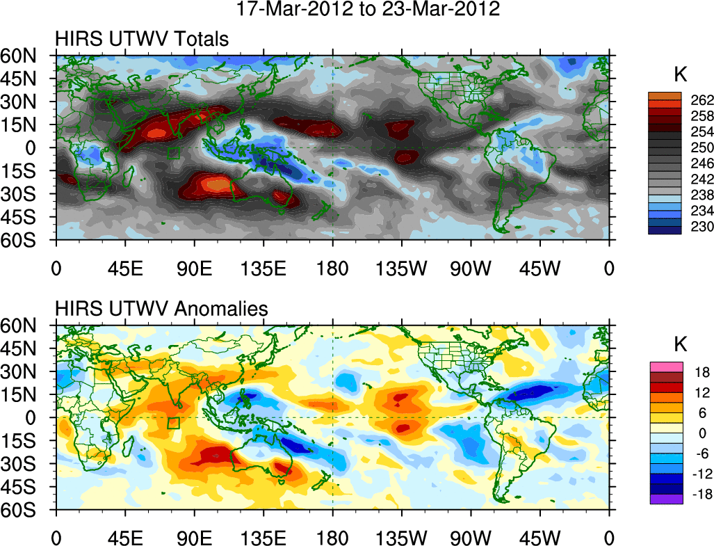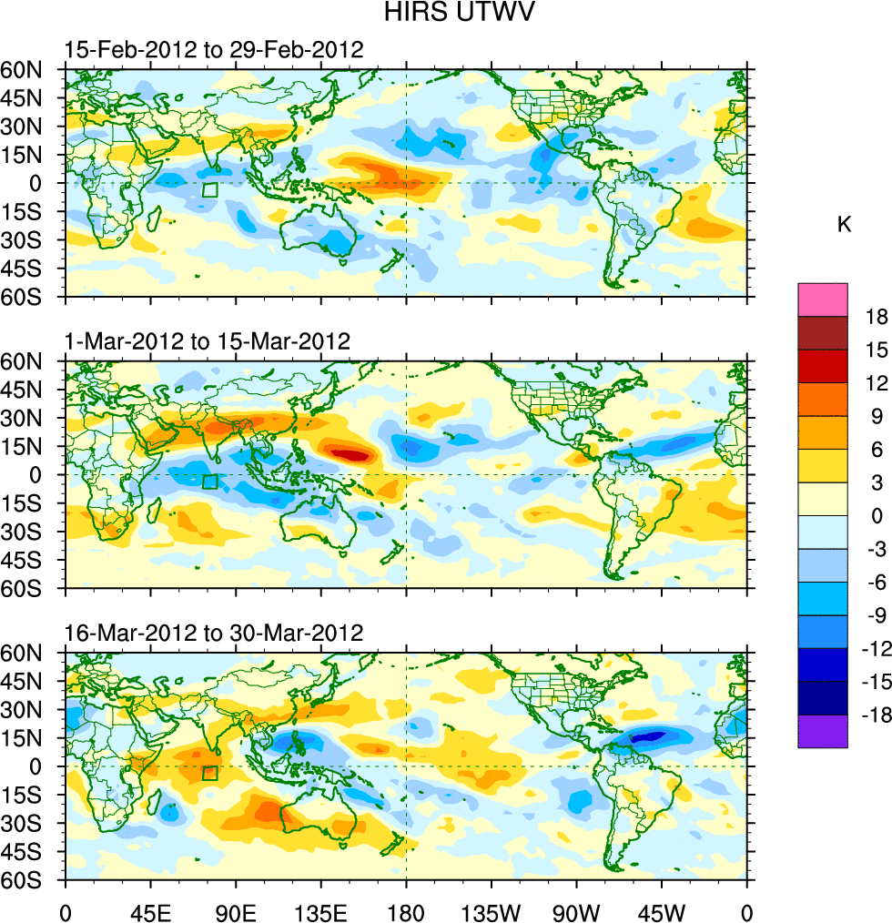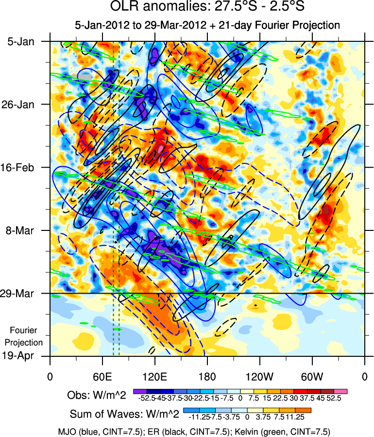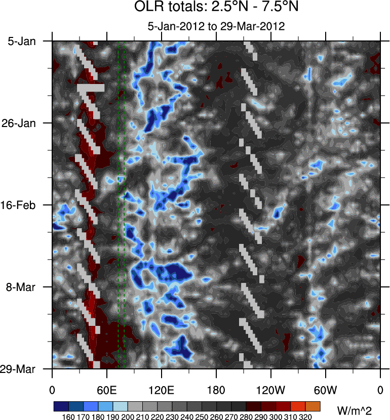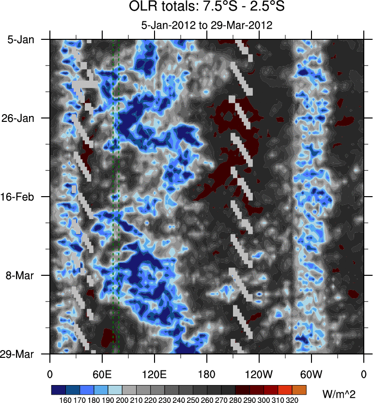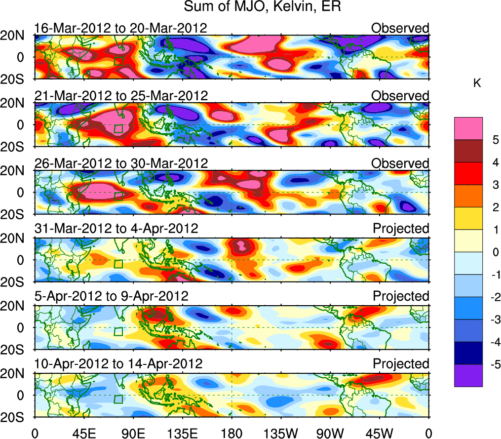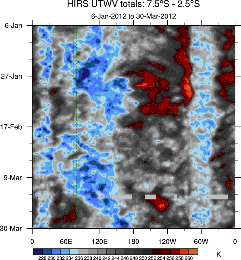 To identify tropical waves in near real-time, the OLR and UTWV data are filtered following Wheeler & Weickmann (2001 MWR). The daily anomalies are calculated using the first 3 harmonics of the seasonal cycle for 1979–2009. Missing values are then filled using linear interpolation in space and time. The most recent 365 days of anomalies are padded with 659 days of zeroes, and the result is filtered for each wave type.