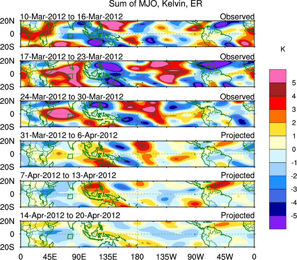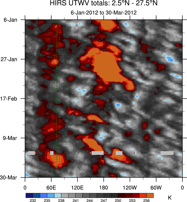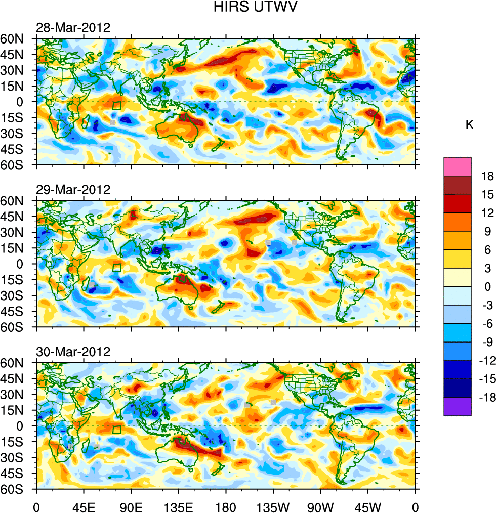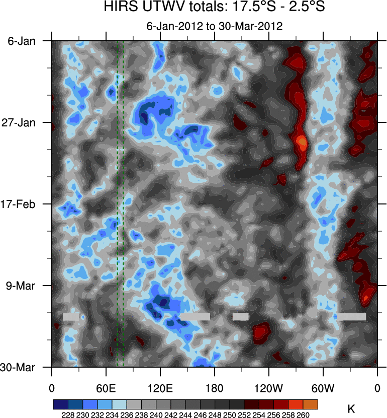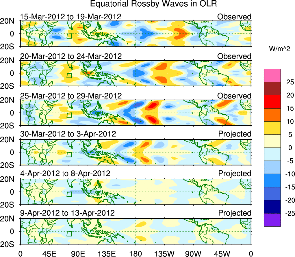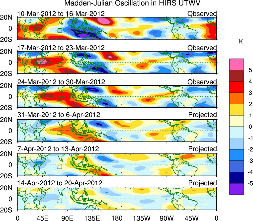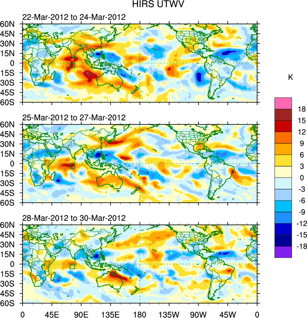 To identify tropical waves in near real-time, the OLR and UTWV data are filtered following Wheeler & Weickmann (2001 MWR). The daily anomalies are calculated using the first 3 harmonics of the seasonal cycle for 1979–2009. Missing values are then filled using linear interpolation in space and time. The most recent 365 days of anomalies are padded with 659 days of zeroes, and the result is filtered for each wave type.