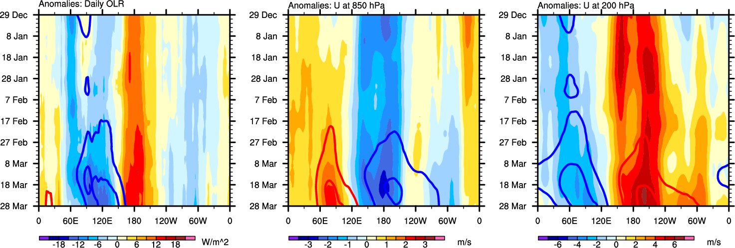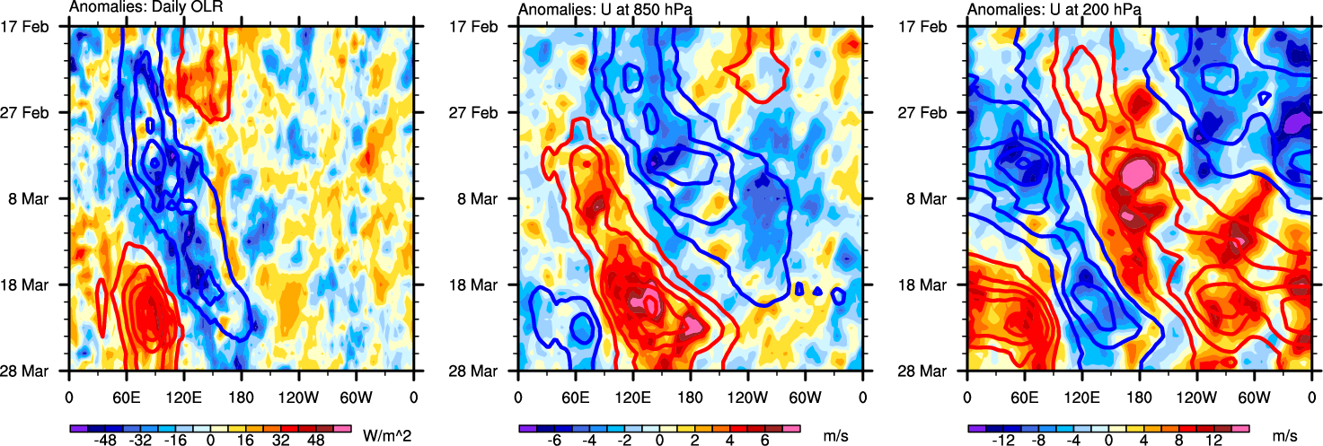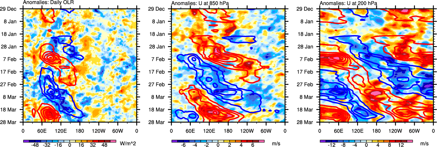 The Hovmollers show longitude-time plots for OLR, U-850, and U-200. The shading indicates the observed anomalies, while the contours are the projection of those anomalies onto the RMM EOFs.