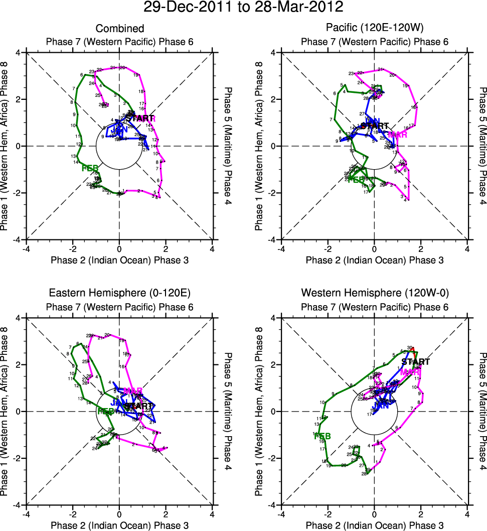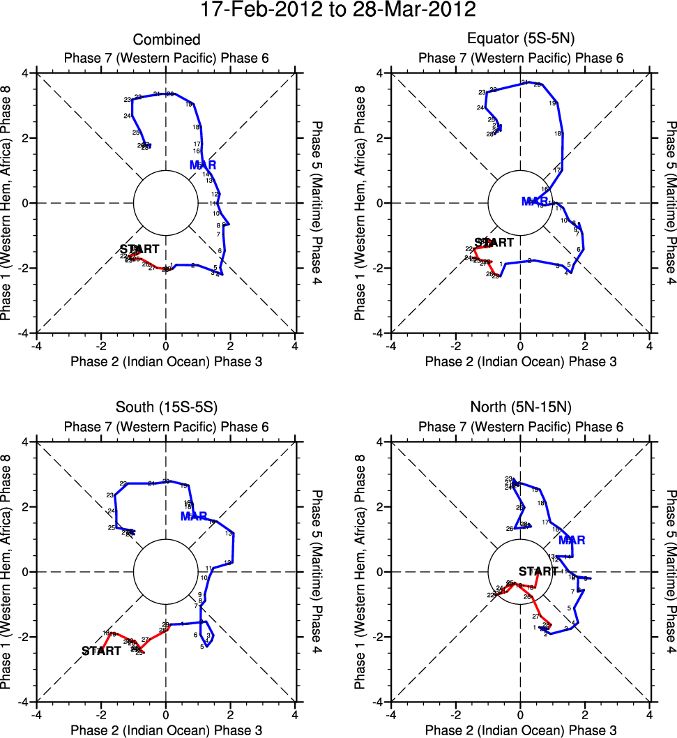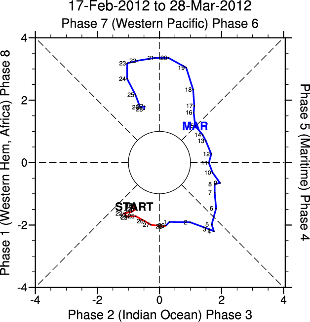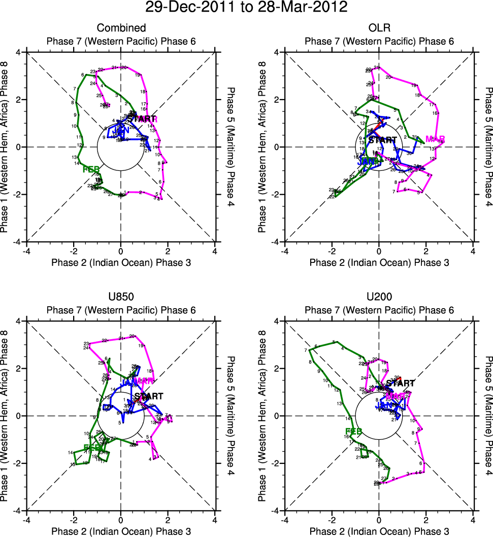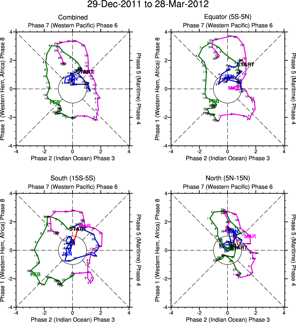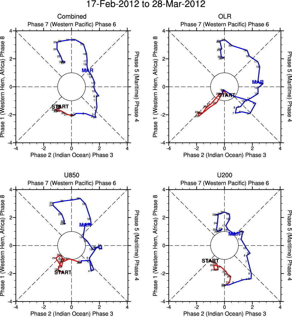 Wheeler and Hendon (2004) constructed the RMM index for monitoring the MJO. This index consists of the first two principal components (PCs) of OLR, 850-hPa zonal wind, and 200-hPa zonal wind averaged 15S-15N.