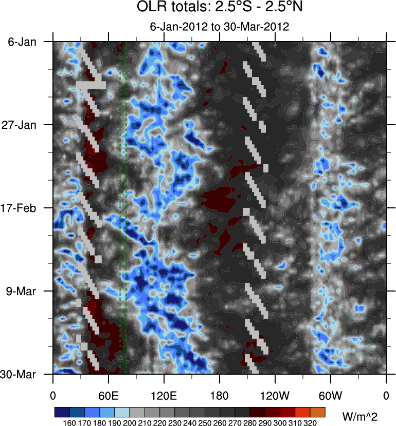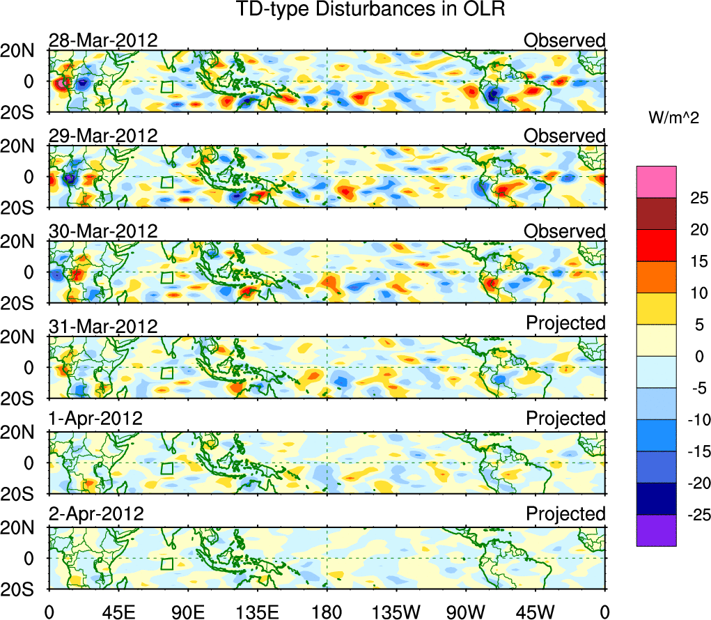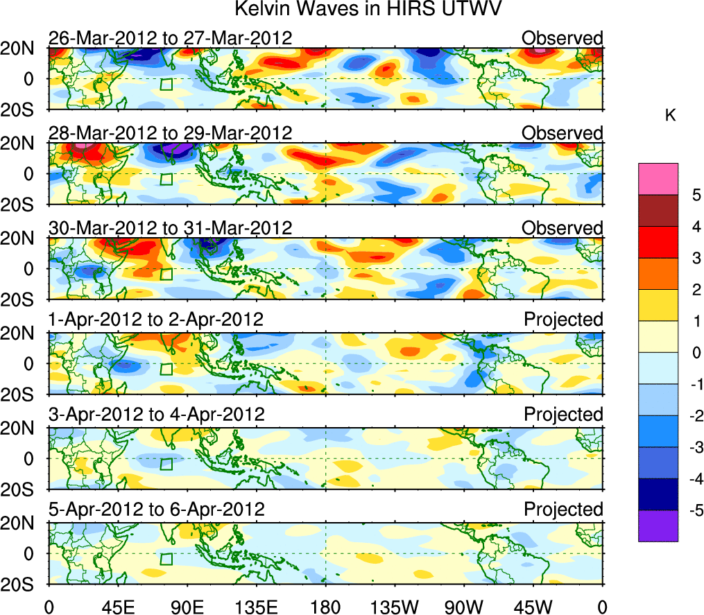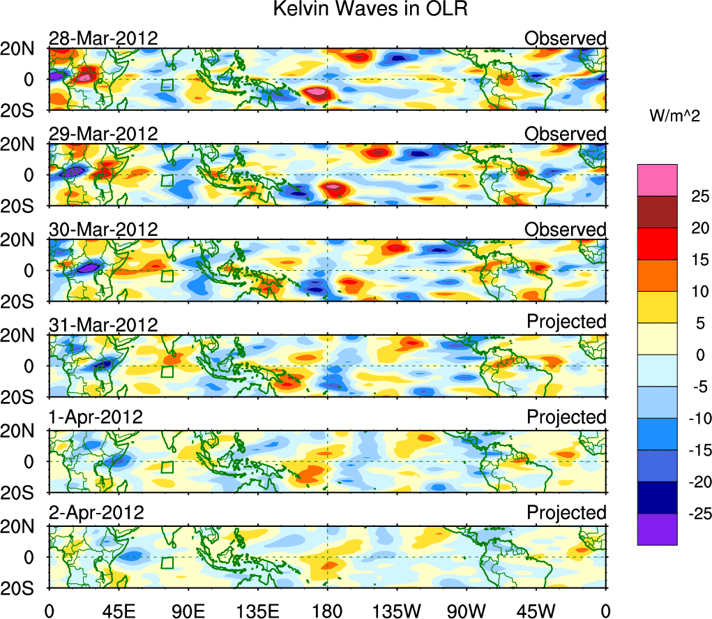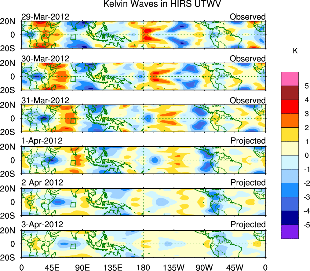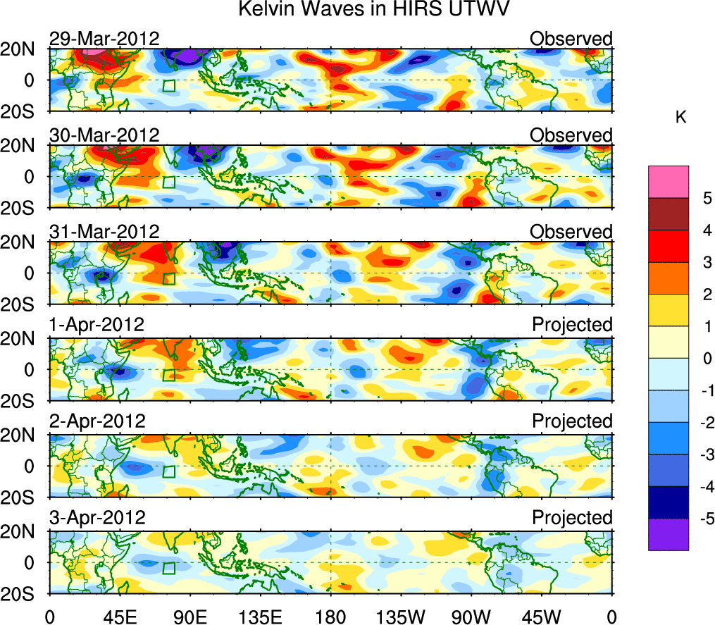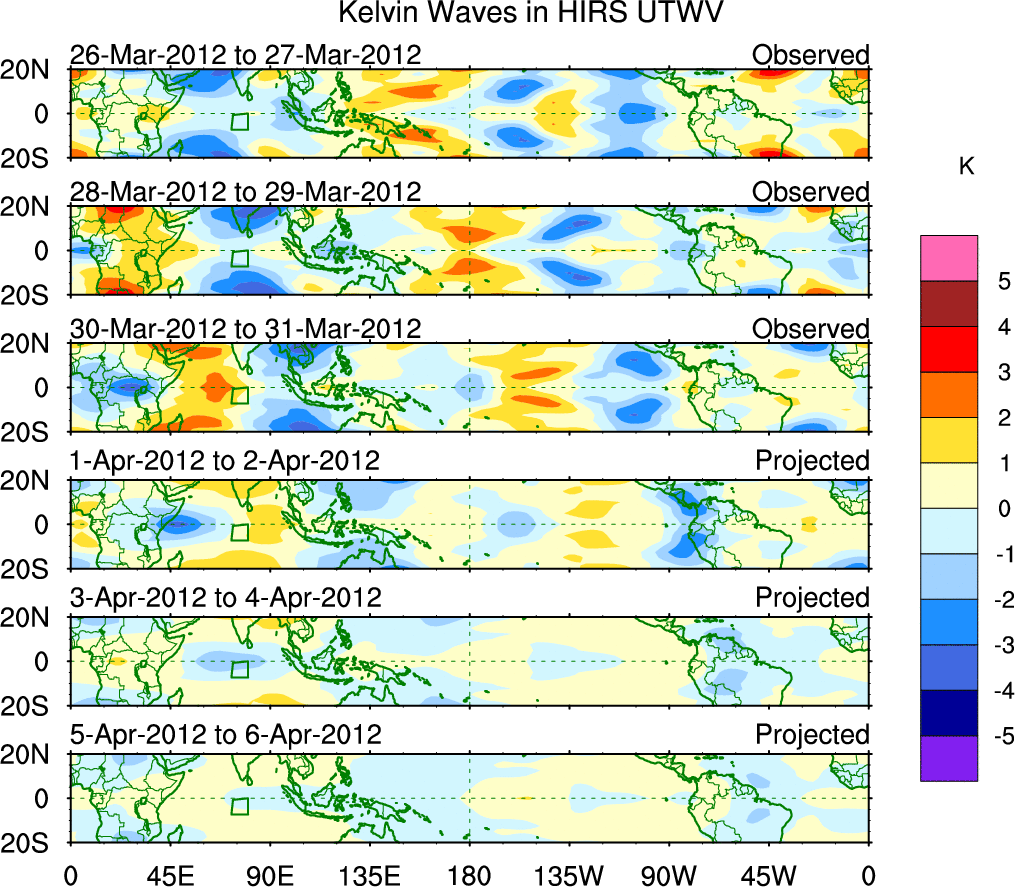 To identify tropical waves in near real-time, the OLR and UTWV data are filtered following Wheeler & Weickmann (2001 MWR). The daily anomalies are calculated using the first 3 harmonics of the seasonal cycle for 1979–2009. Missing values are then filled using linear interpolation in space and time. The most recent 365 days of anomalies are padded with 659 days of zeroes, and the result is filtered for each wave type.