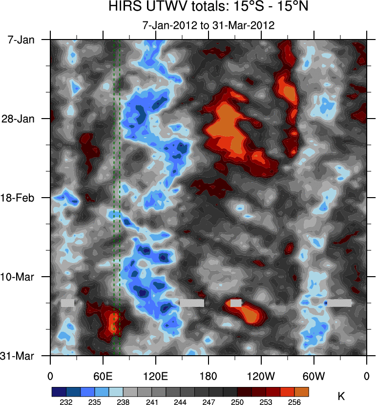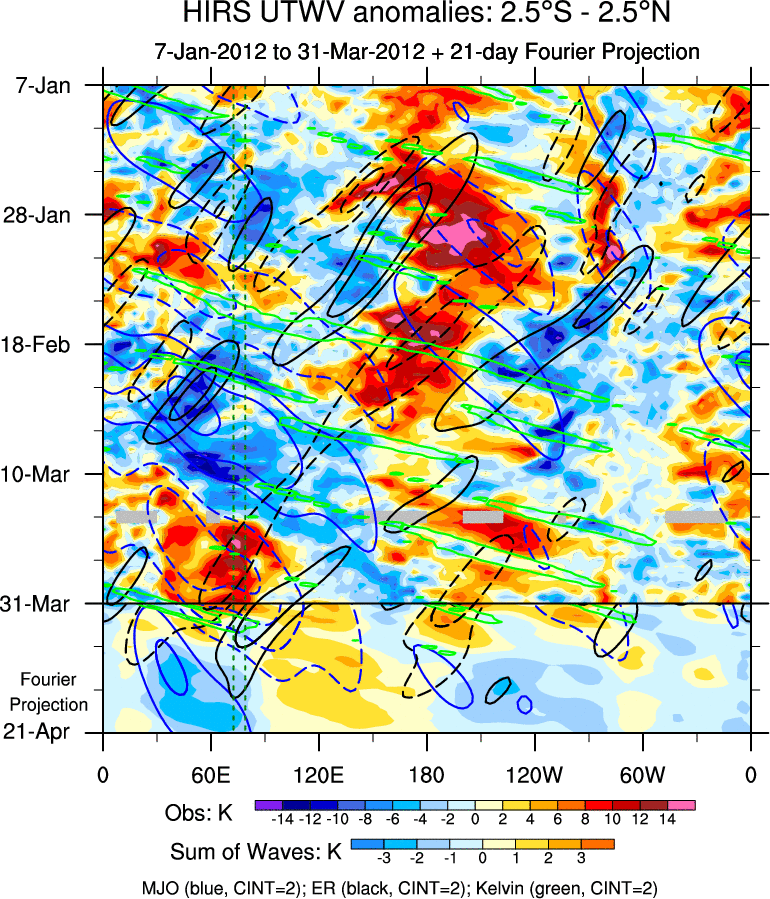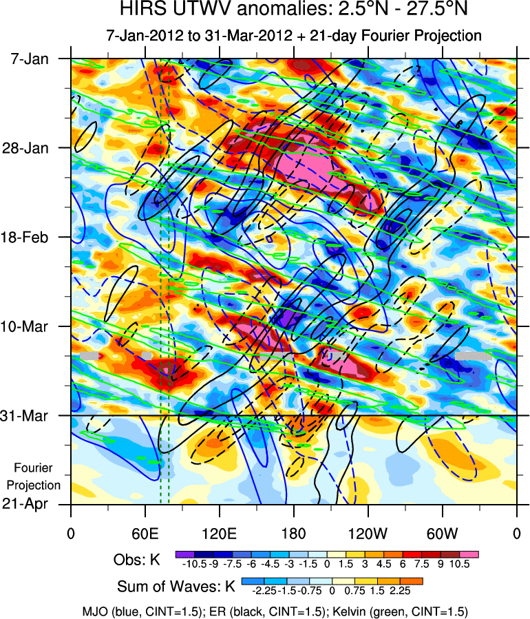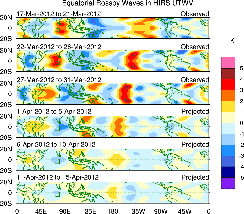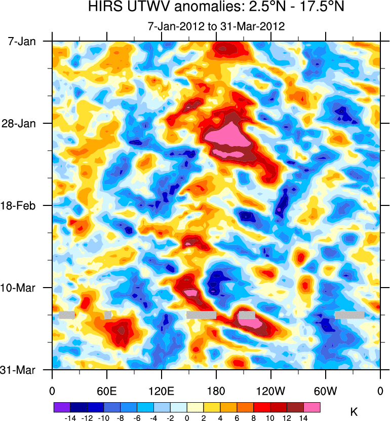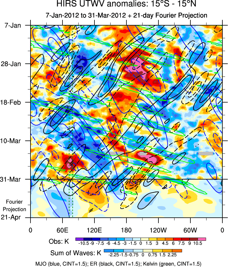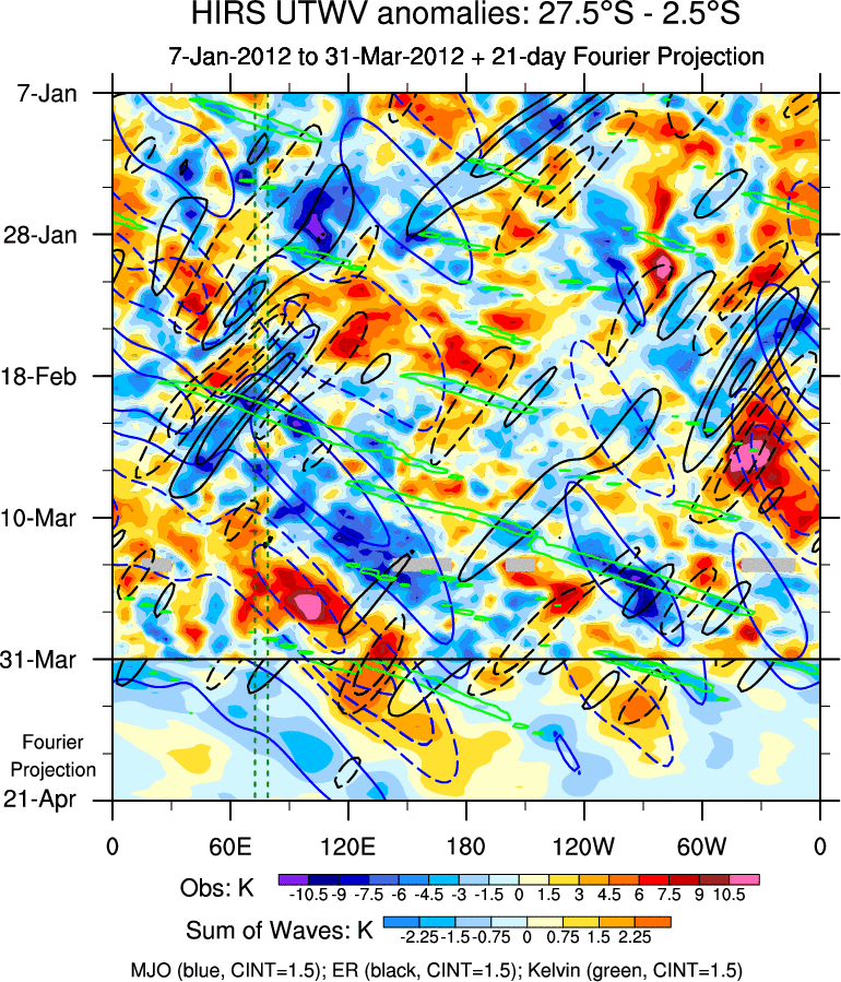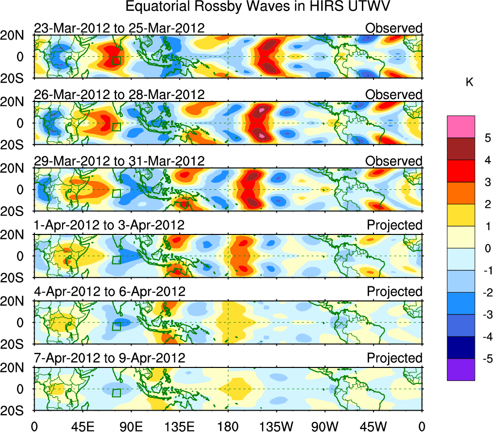 To identify tropical waves in near real-time, the OLR and UTWV data are filtered following Wheeler & Weickmann (2001 MWR). The daily anomalies are calculated using the first 3 harmonics of the seasonal cycle for 1979–2009. Missing values are then filled using linear interpolation in space and time. The most recent 365 days of anomalies are padded with 659 days of zeroes, and the result is filtered for each wave type.
