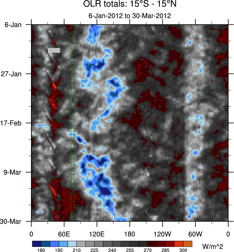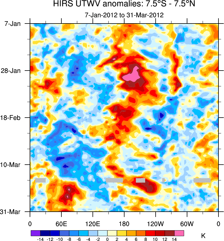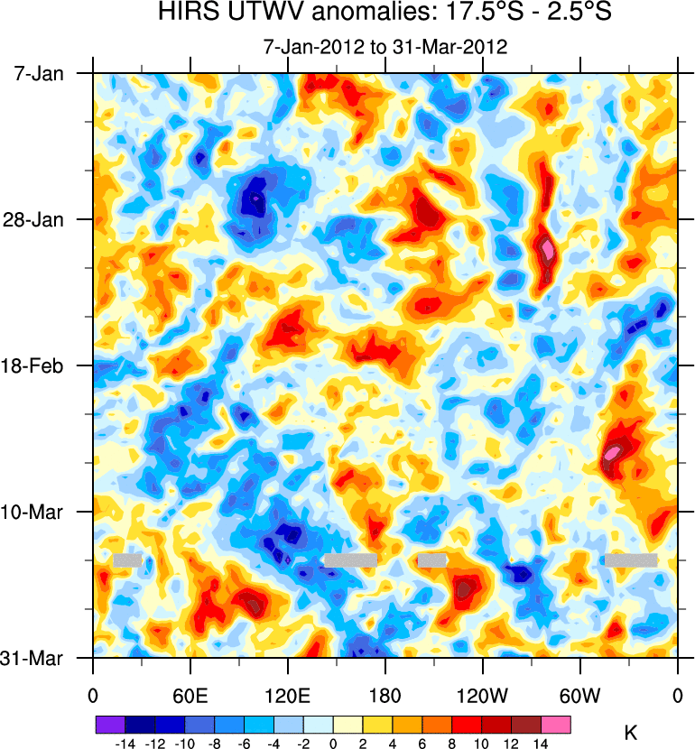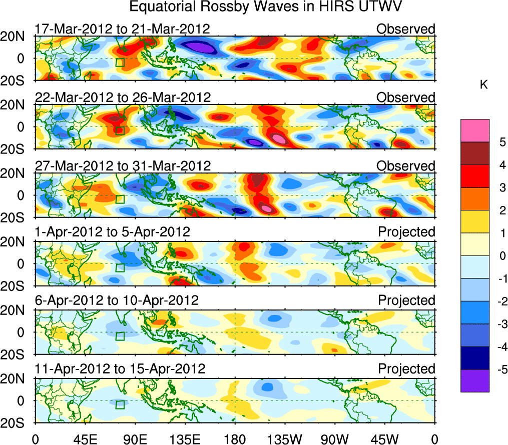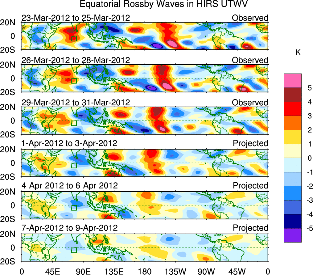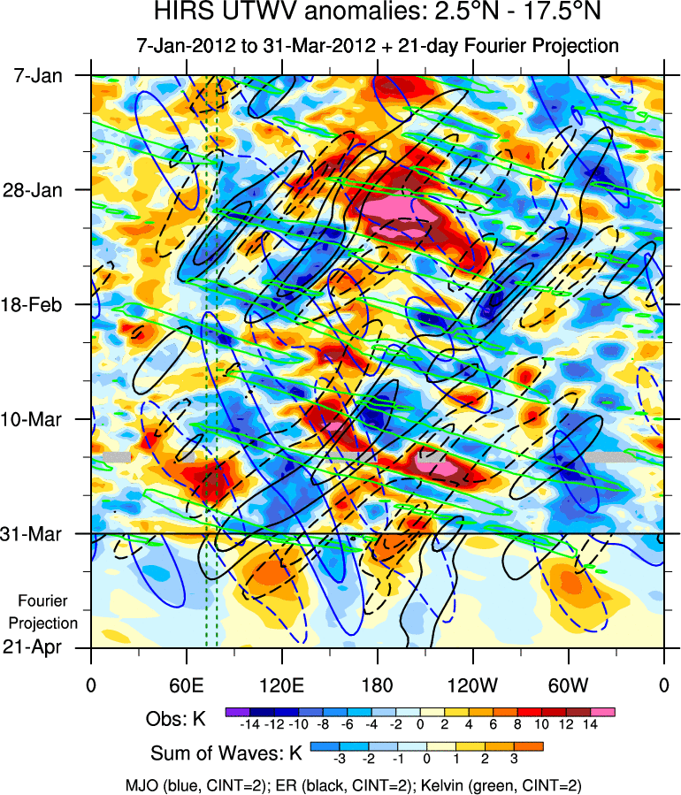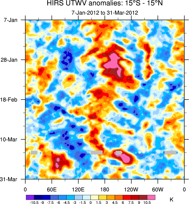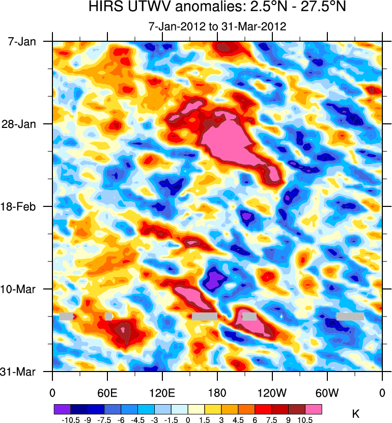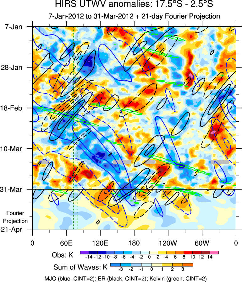 To identify tropical waves in near real-time, the OLR and UTWV data are filtered following Wheeler & Weickmann (2001 MWR). The daily anomalies are calculated using the first 3 harmonics of the seasonal cycle for 1979–2009. Missing values are then filled using linear interpolation in space and time. The most recent 365 days of anomalies are padded with 659 days of zeroes, and the result is filtered for each wave type.