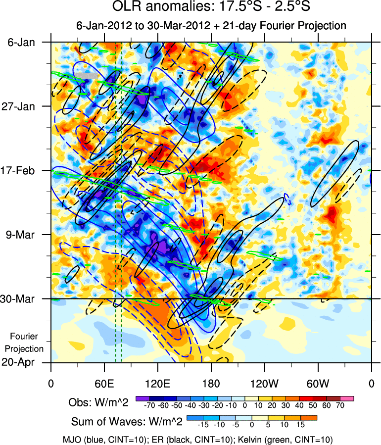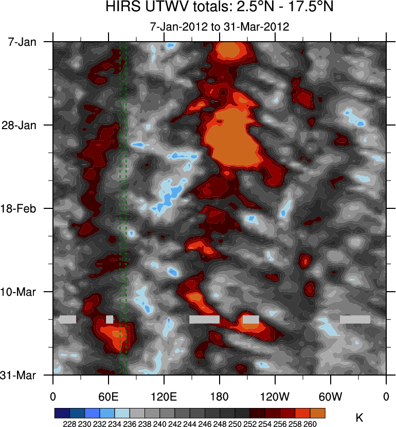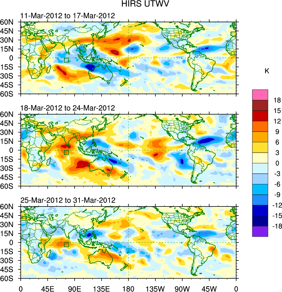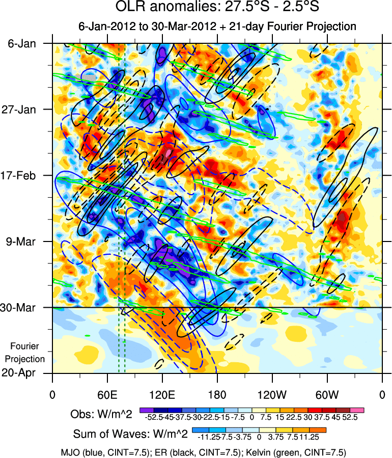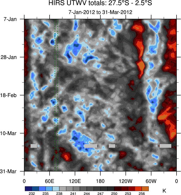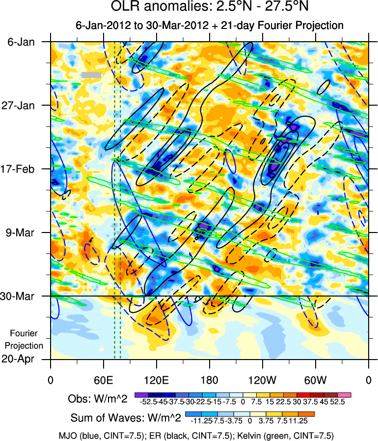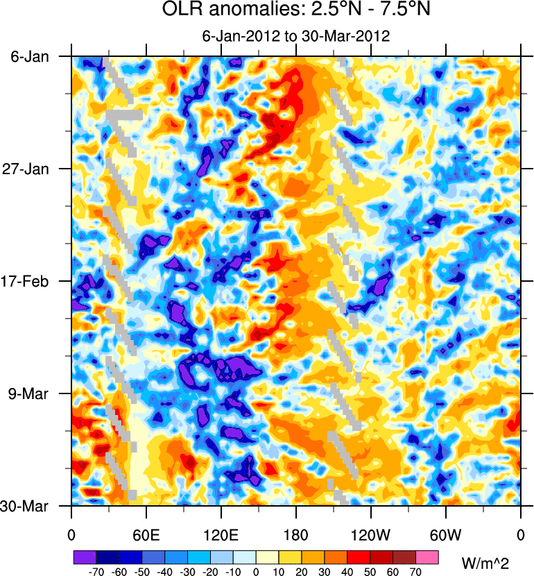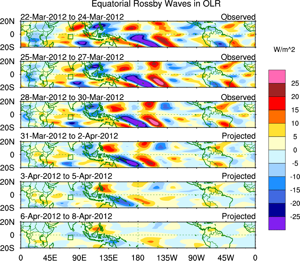 To identify tropical waves in near real-time, the OLR and UTWV data are filtered following Wheeler & Weickmann (2001 MWR). The daily anomalies are calculated using the first 3 harmonics of the seasonal cycle for 1979–2009. Missing values are then filled using linear interpolation in space and time. The most recent 365 days of anomalies are padded with 659 days of zeroes, and the result is filtered for each wave type.