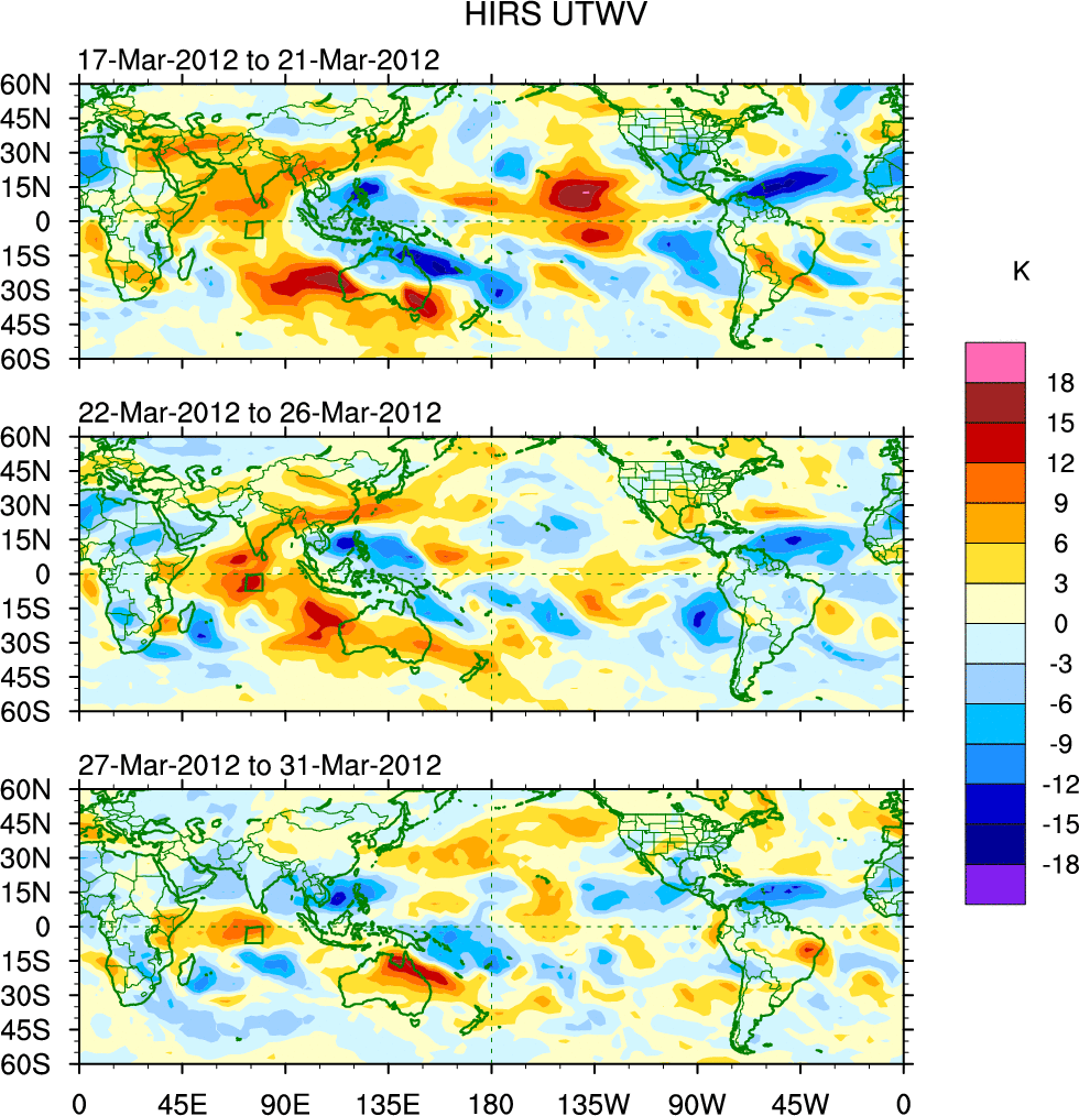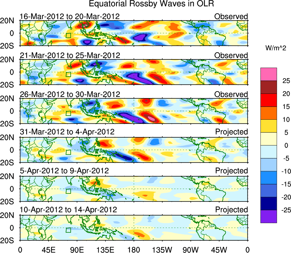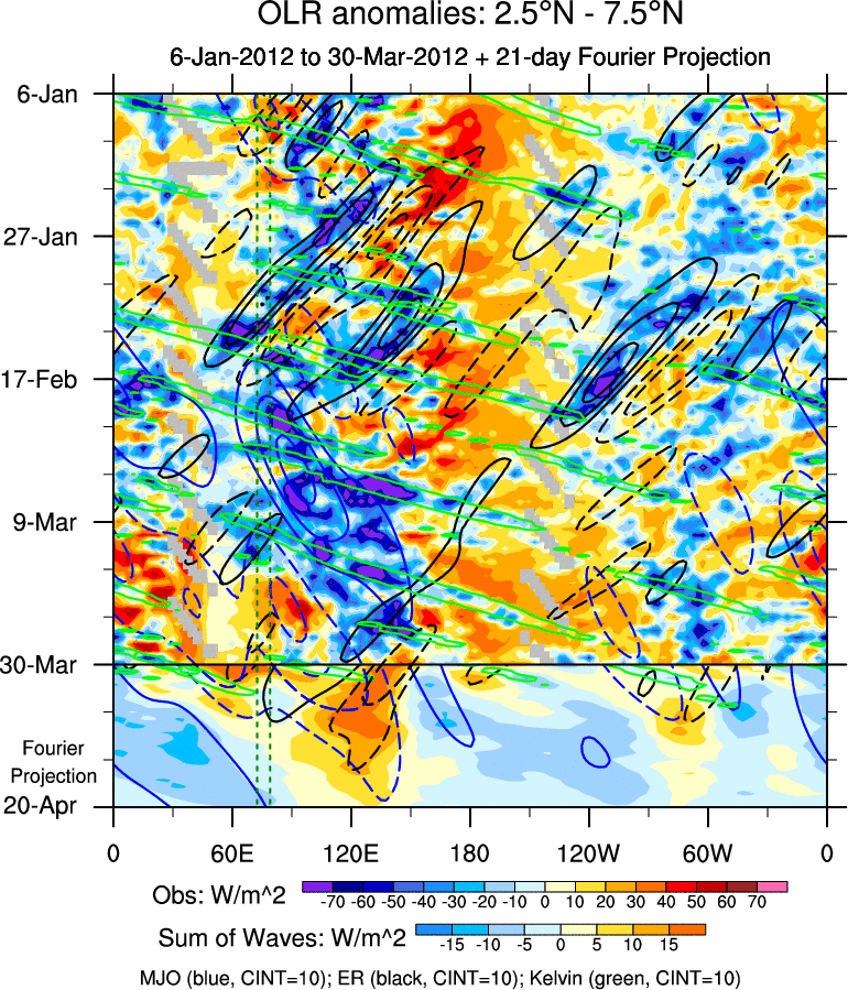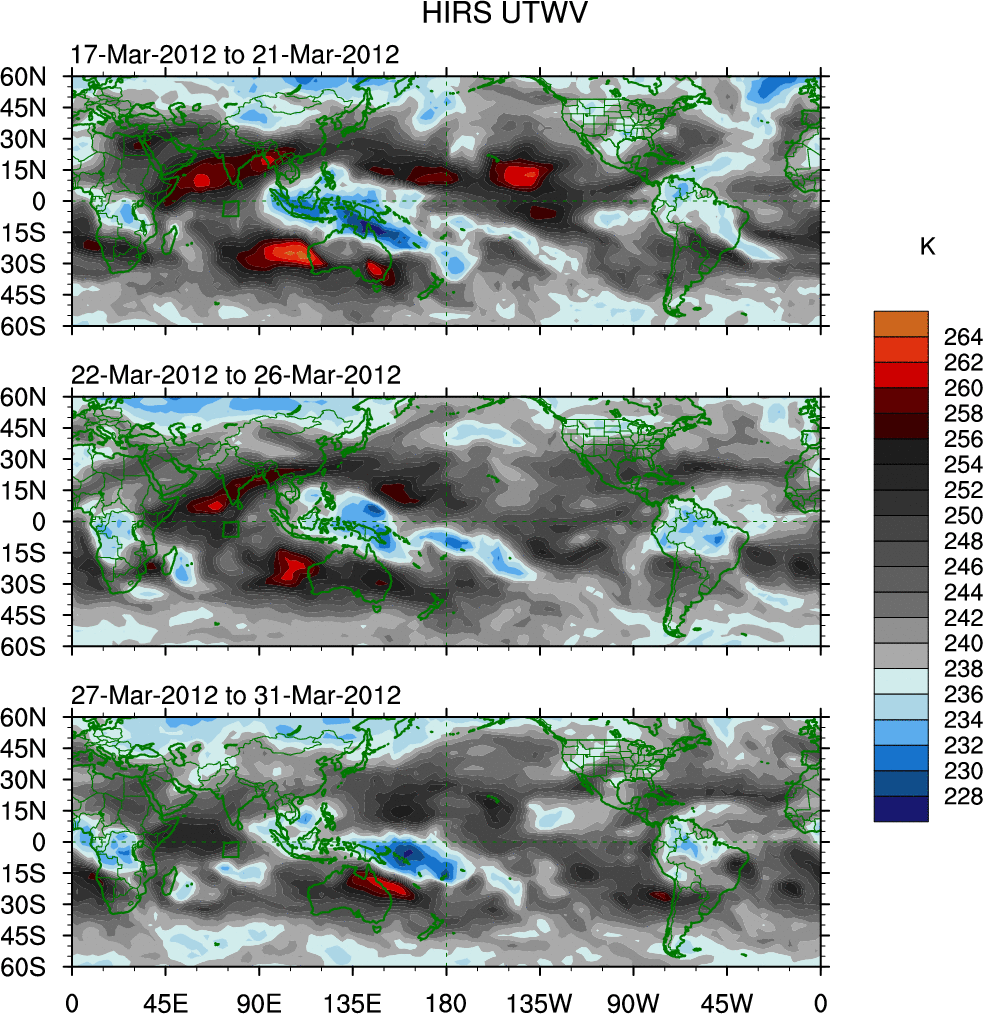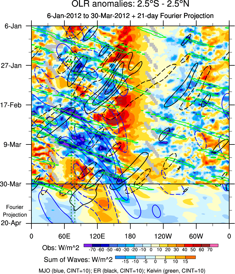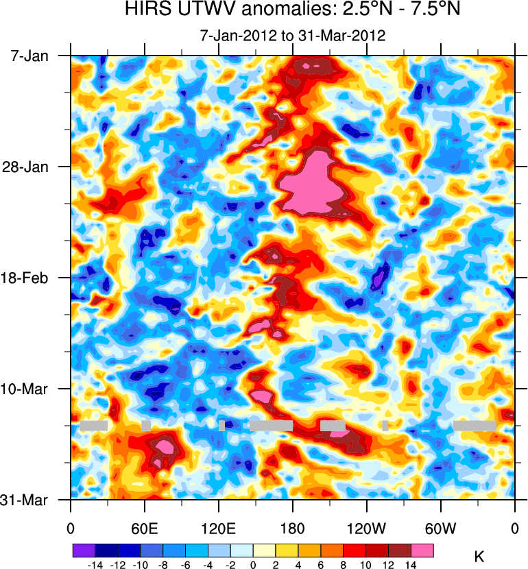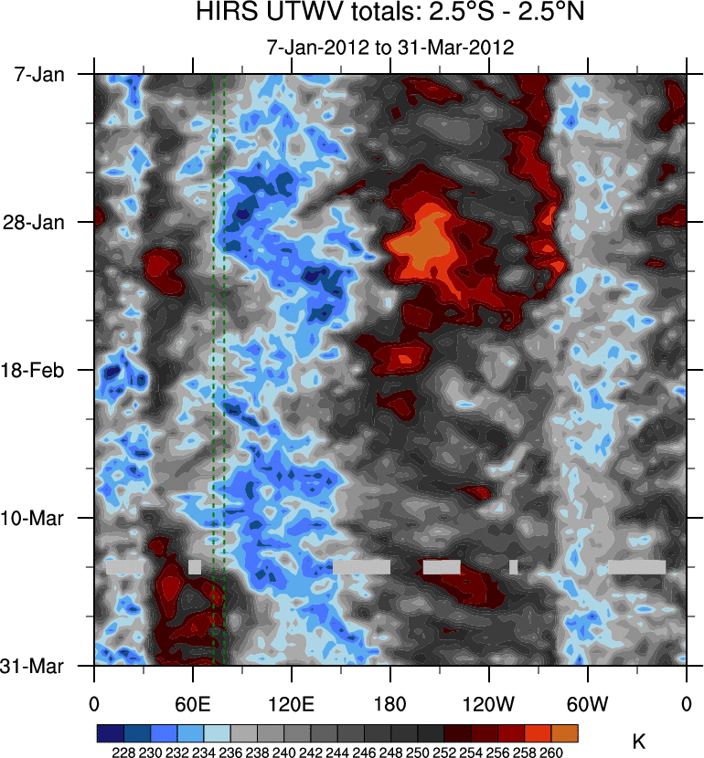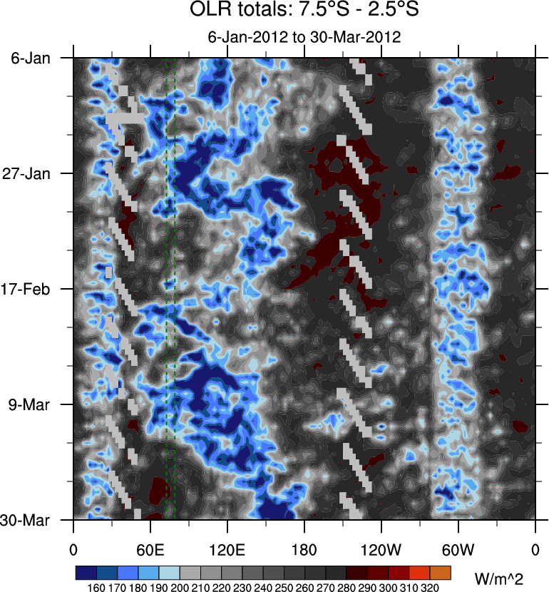 To identify tropical waves in near real-time, the OLR and UTWV data are filtered following Wheeler & Weickmann (2001 MWR). The daily anomalies are calculated using the first 3 harmonics of the seasonal cycle for 1979–2009. Missing values are then filled using linear interpolation in space and time. The most recent 365 days of anomalies are padded with 659 days of zeroes, and the result is filtered for each wave type.
