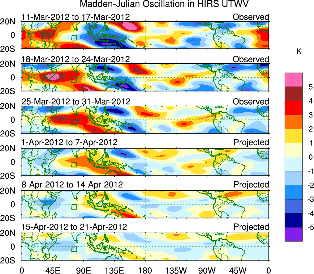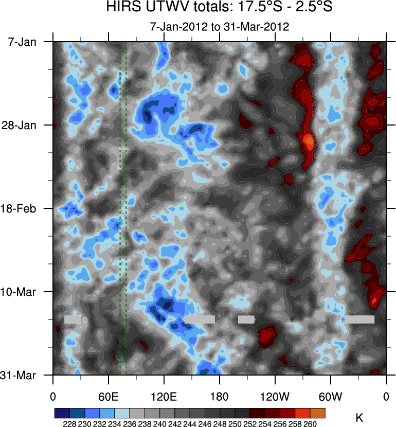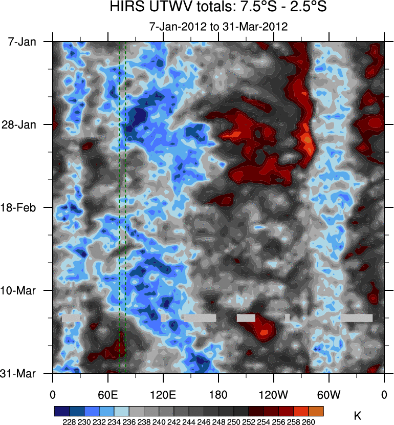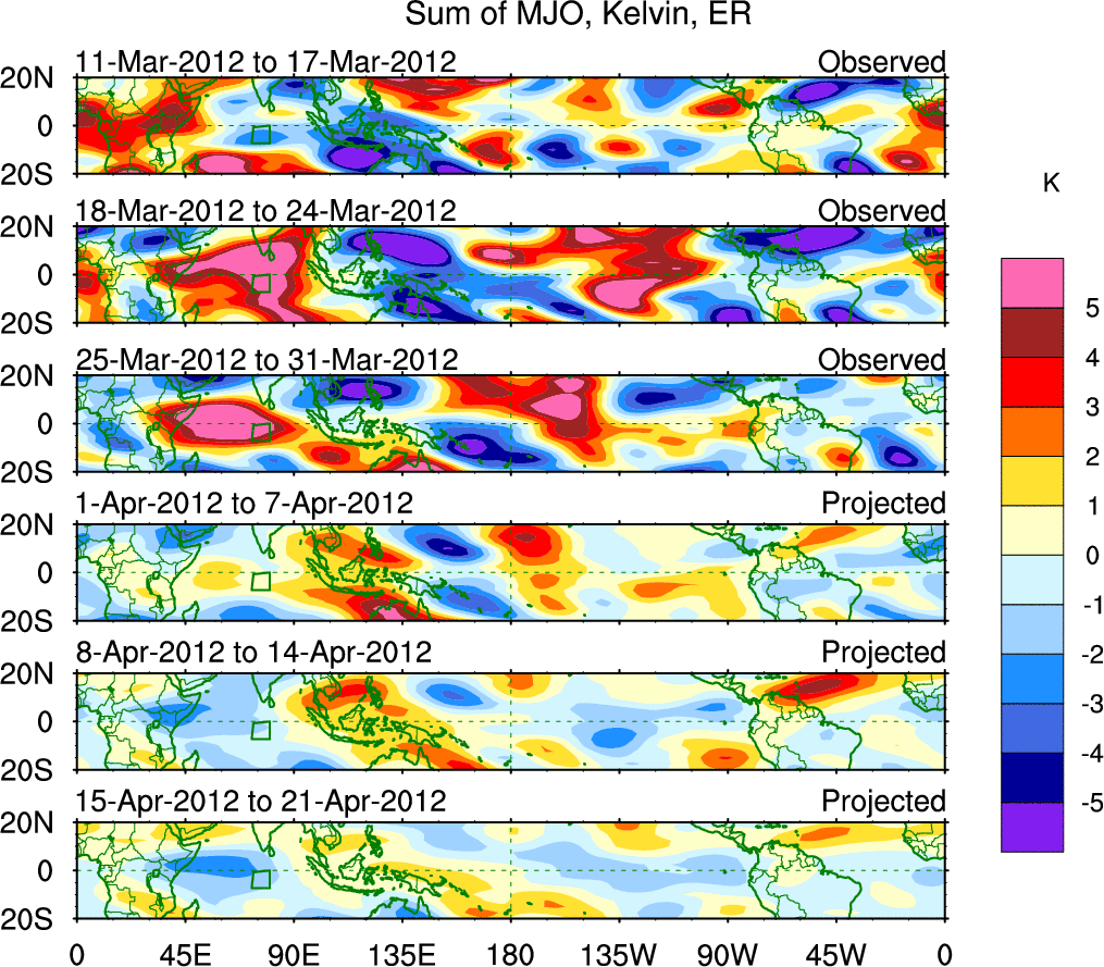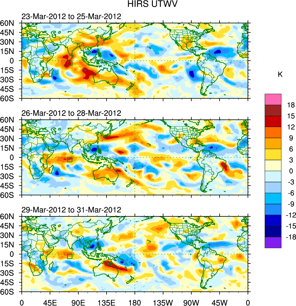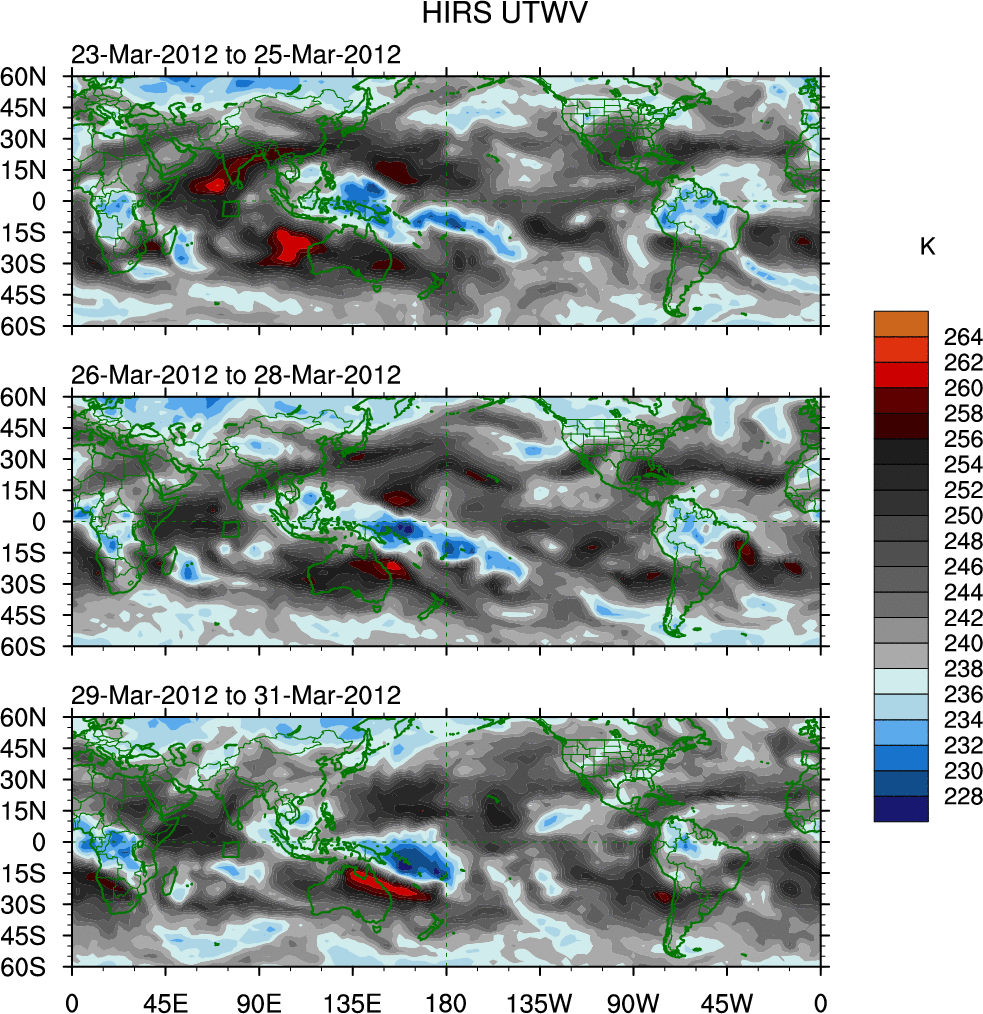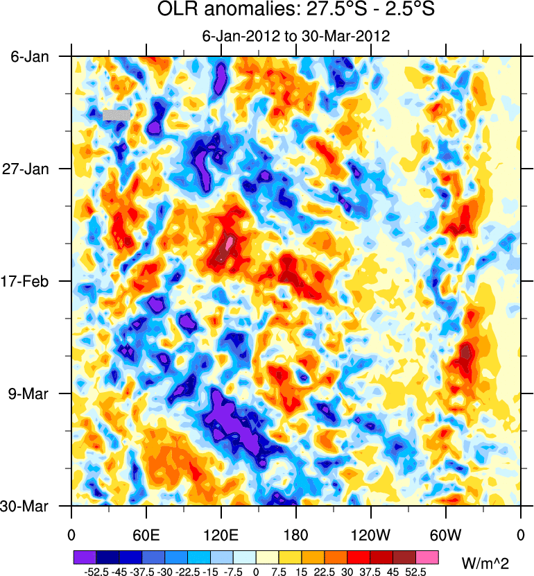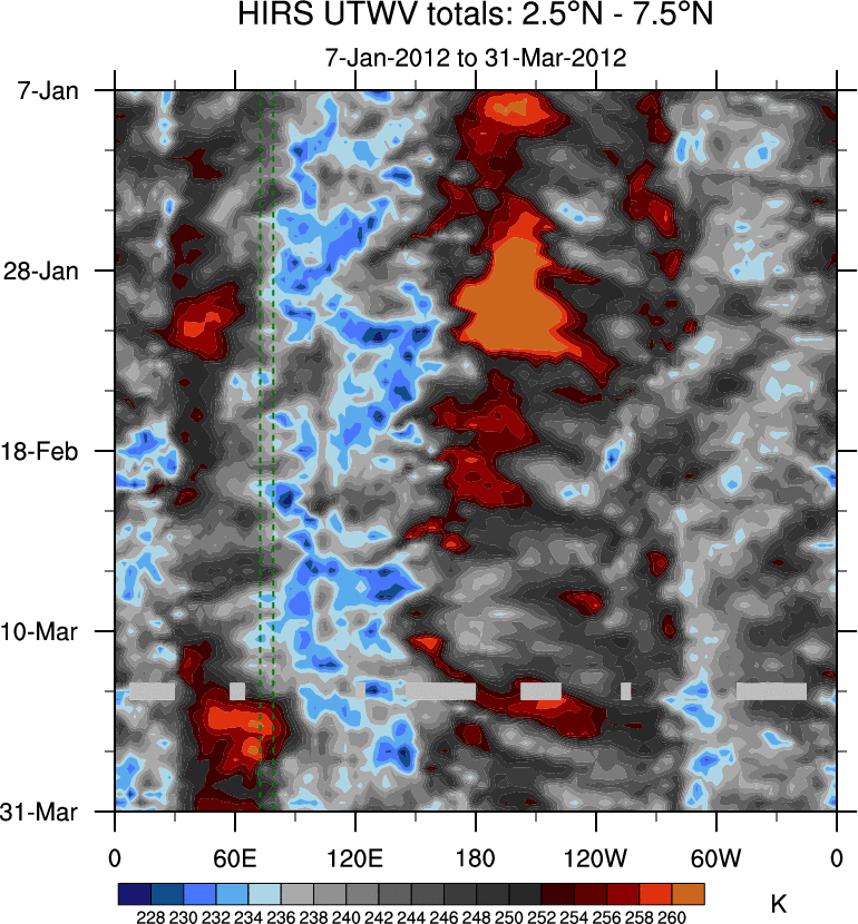 To identify tropical waves in near real-time, the OLR and UTWV data are filtered following Wheeler & Weickmann (2001 MWR). The daily anomalies are calculated using the first 3 harmonics of the seasonal cycle for 1979–2009. Missing values are then filled using linear interpolation in space and time. The most recent 365 days of anomalies are padded with 659 days of zeroes, and the result is filtered for each wave type.