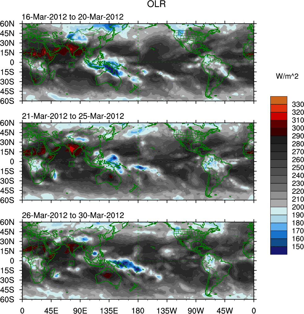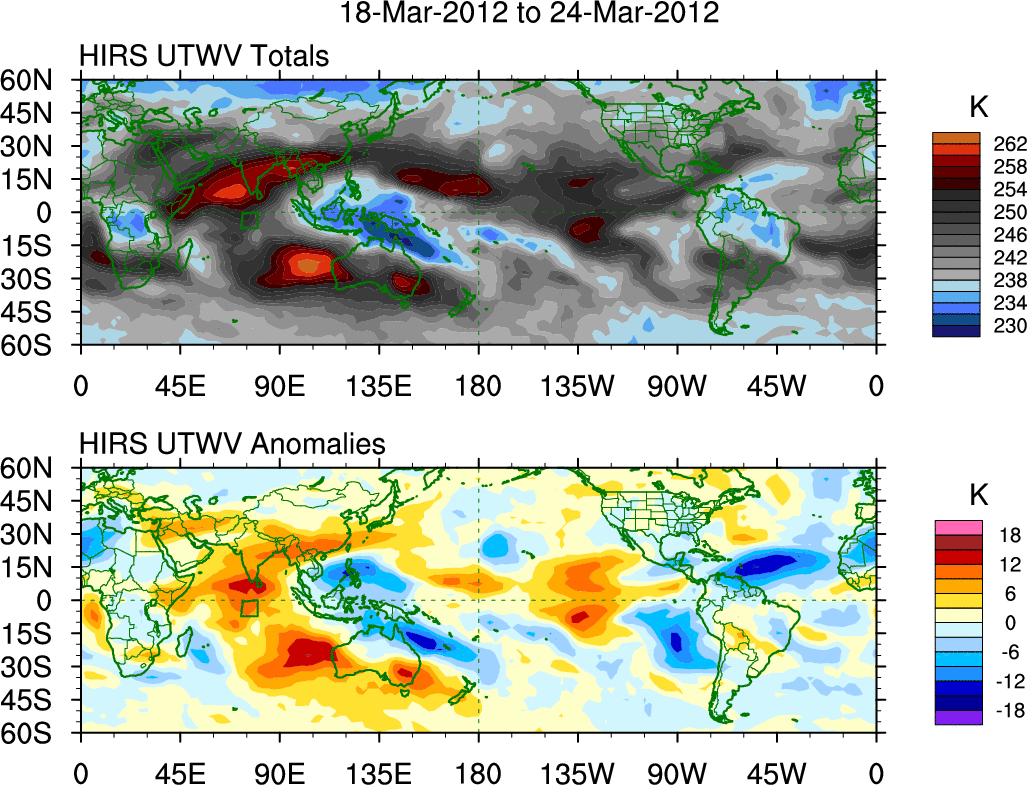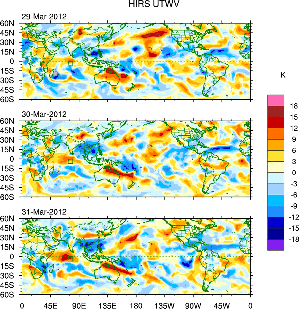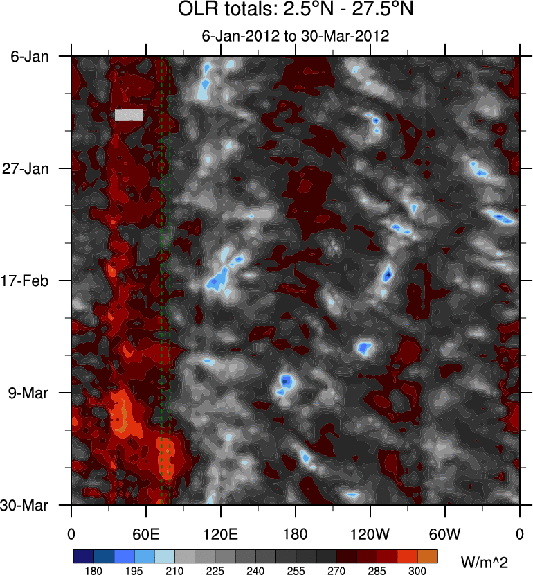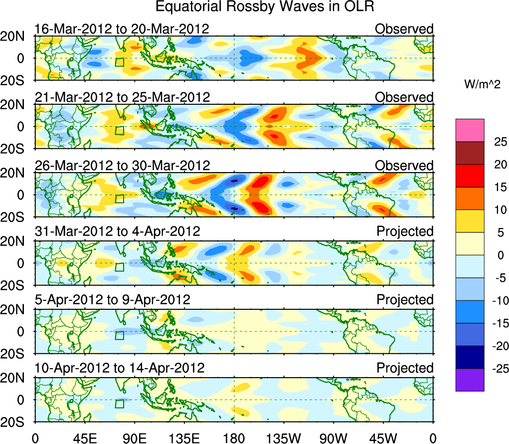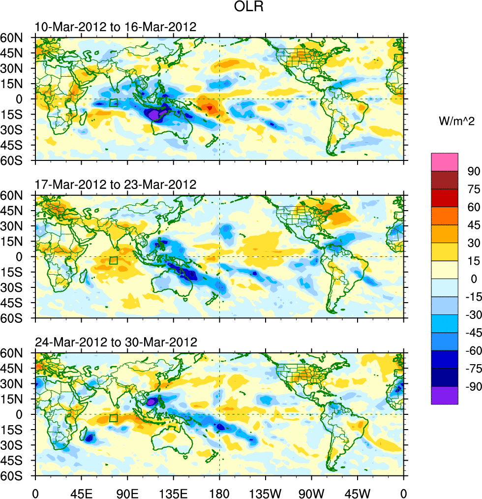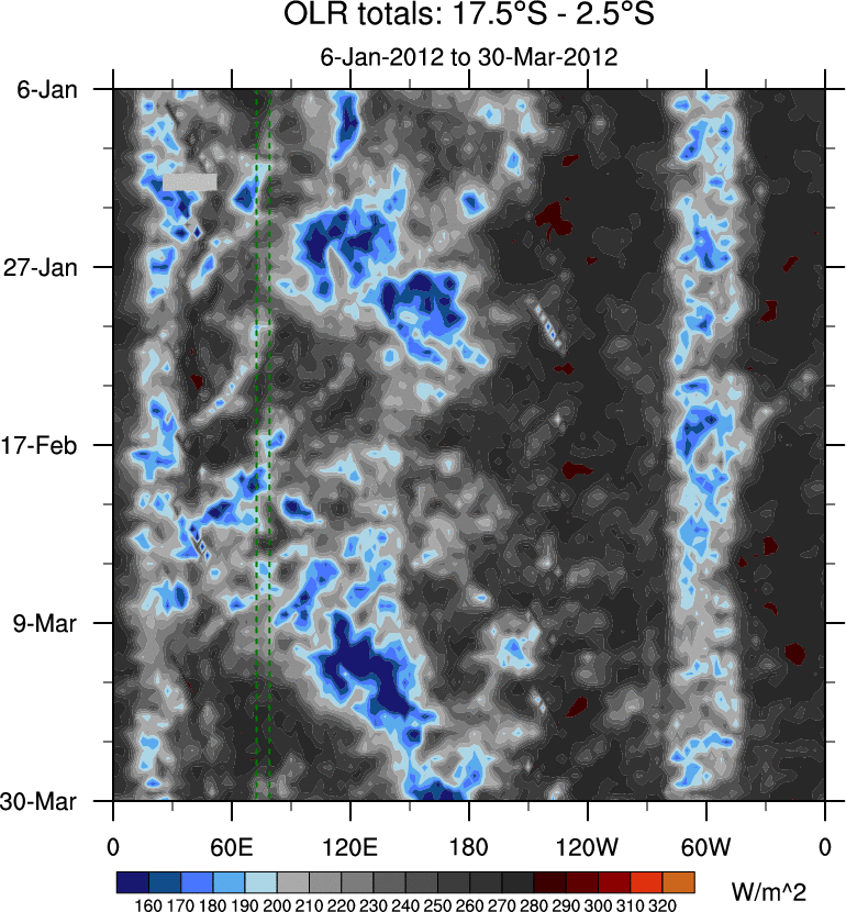 To identify tropical waves in near real-time, the OLR and UTWV data are filtered following Wheeler & Weickmann (2001 MWR). The daily anomalies are calculated using the first 3 harmonics of the seasonal cycle for 1979–2009. Missing values are then filled using linear interpolation in space and time. The most recent 365 days of anomalies are padded with 659 days of zeroes, and the result is filtered for each wave type.