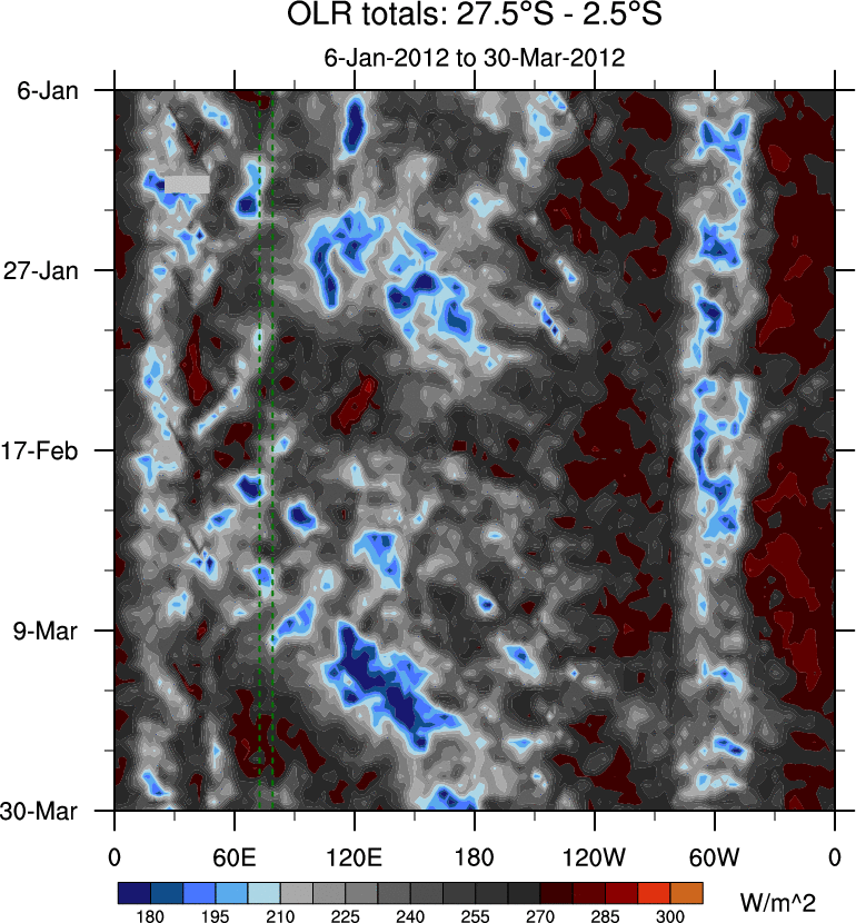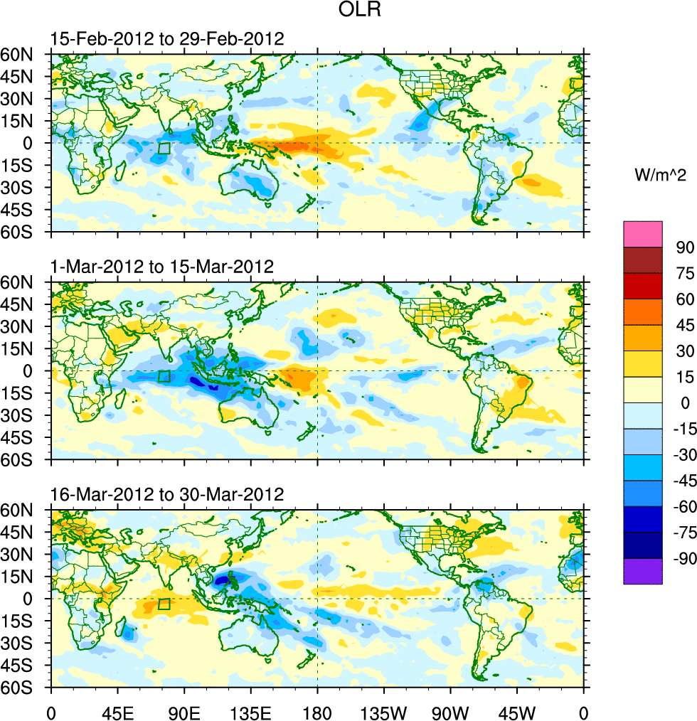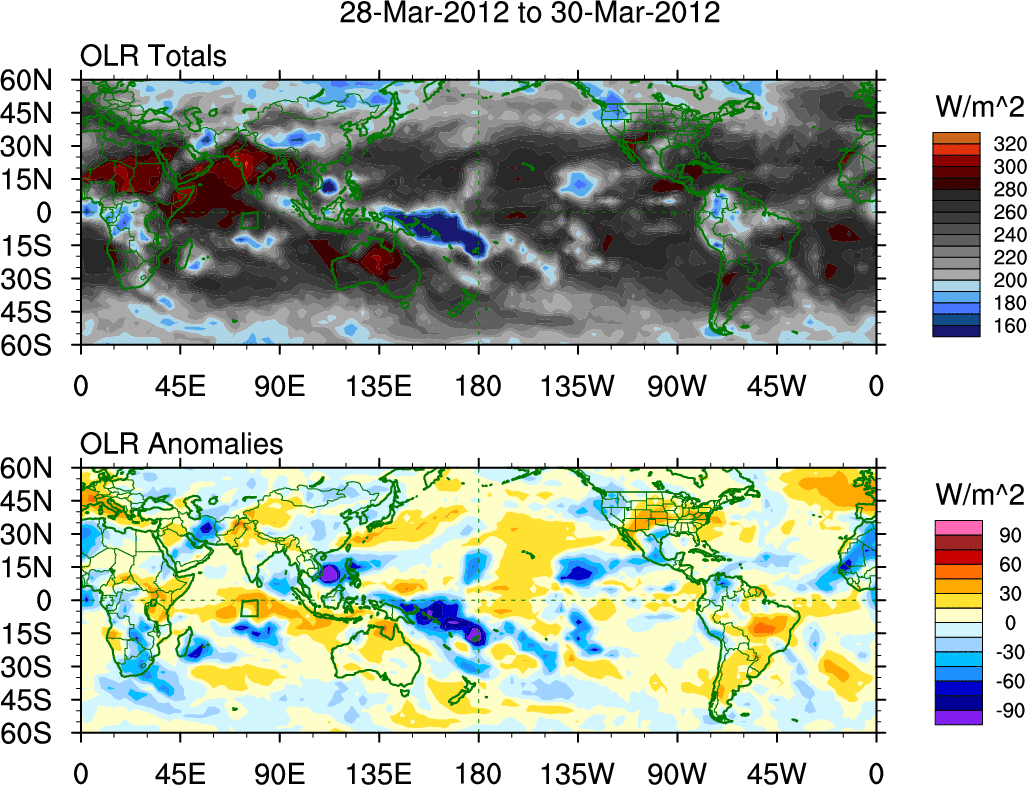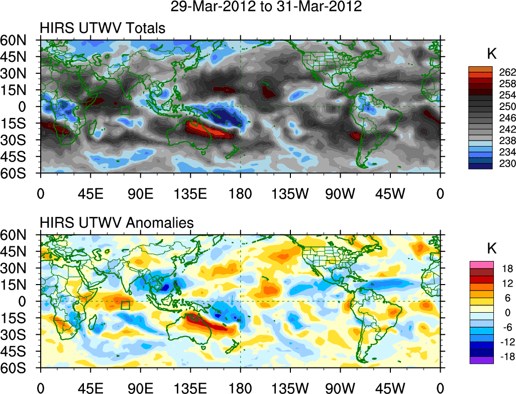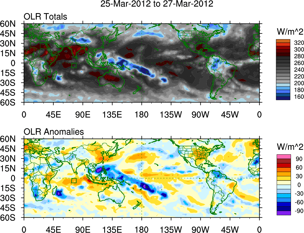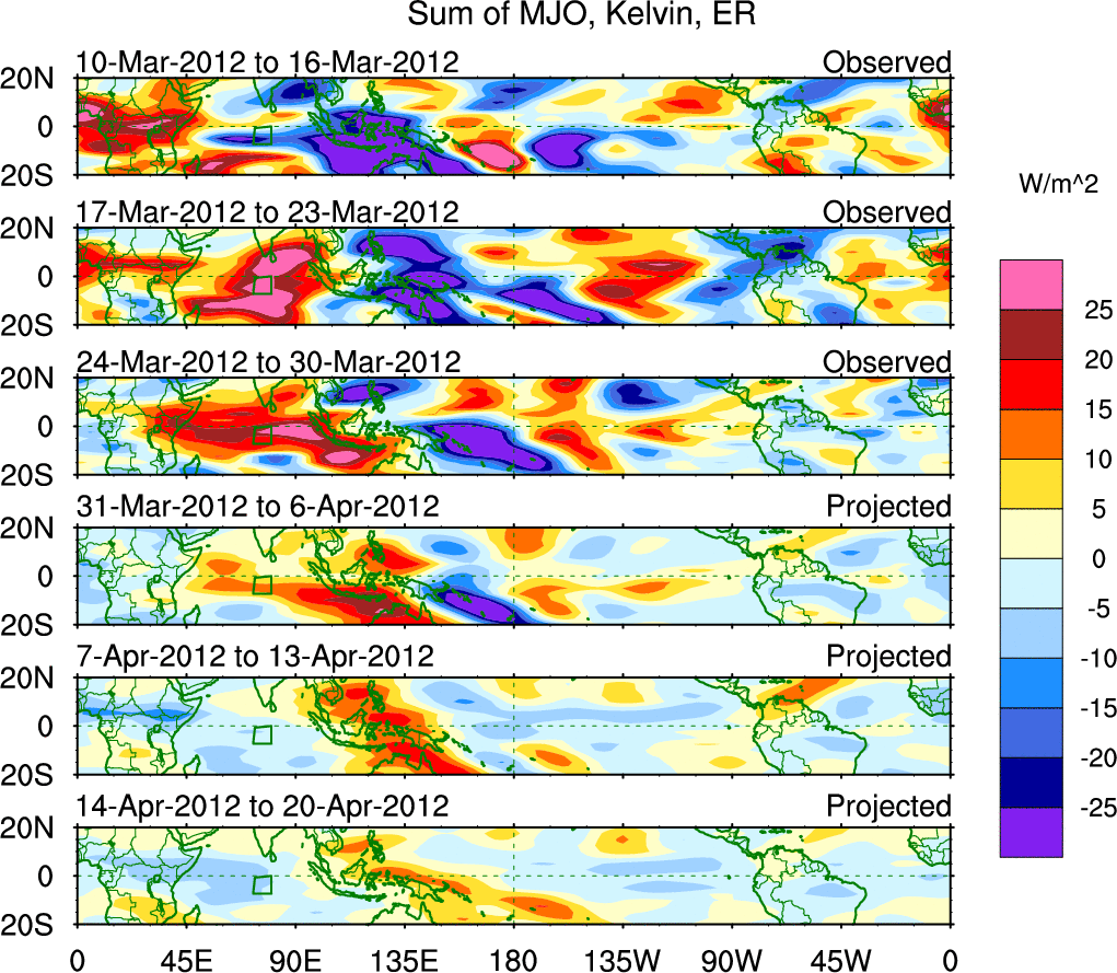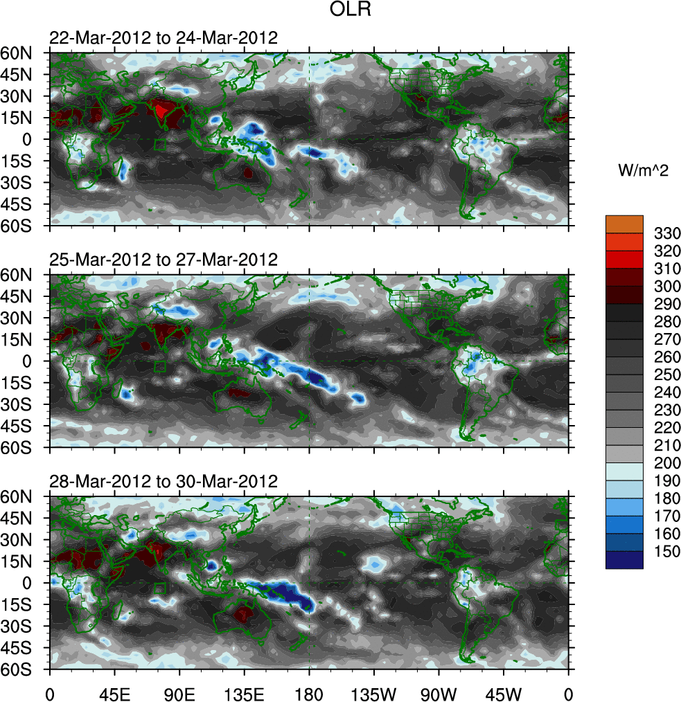 To identify tropical waves in near real-time, the OLR and UTWV data are filtered following Wheeler & Weickmann (2001 MWR). The daily anomalies are calculated using the first 3 harmonics of the seasonal cycle for 1979–2009. Missing values are then filled using linear interpolation in space and time. The most recent 365 days of anomalies are padded with 659 days of zeroes, and the result is filtered for each wave type.