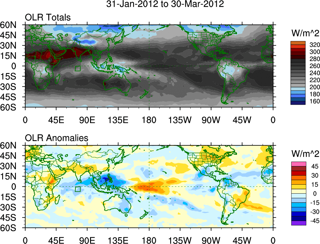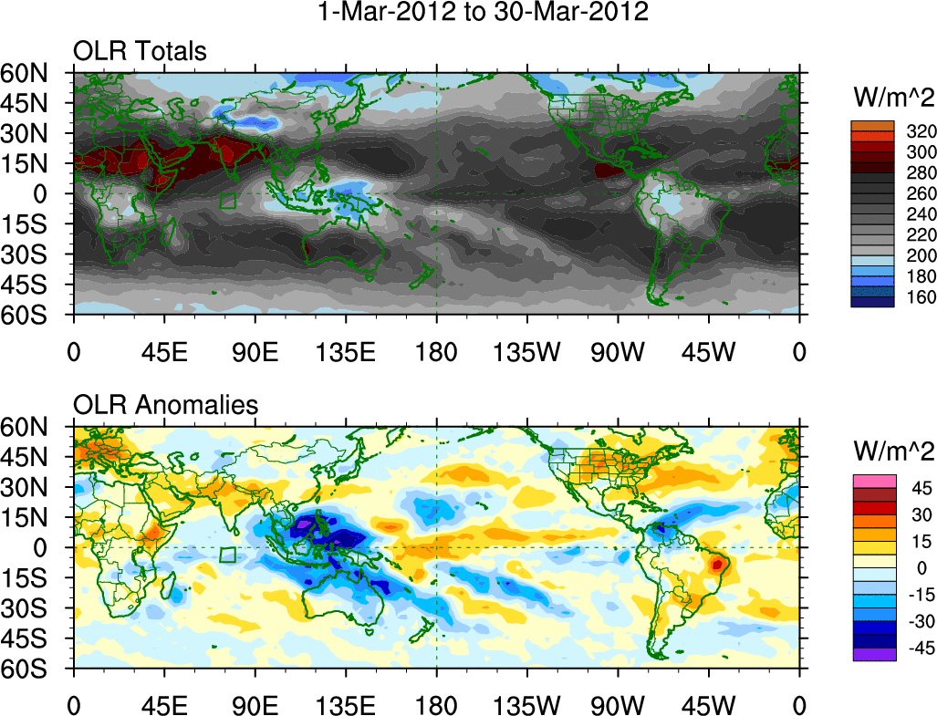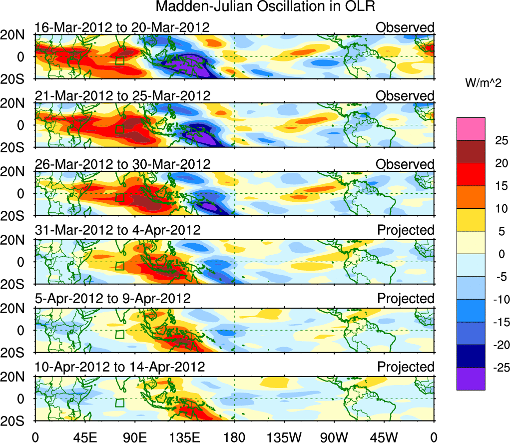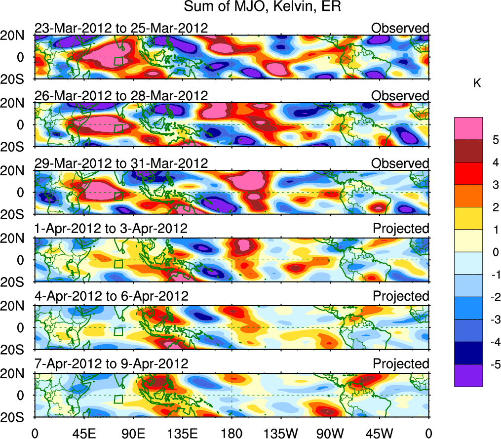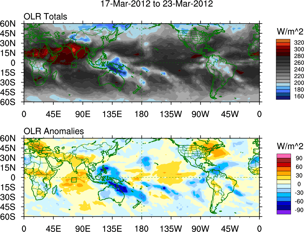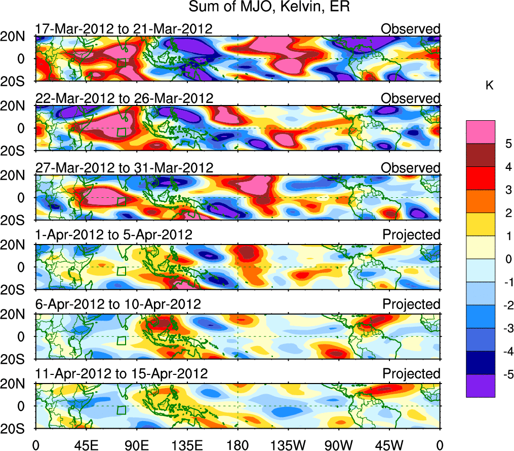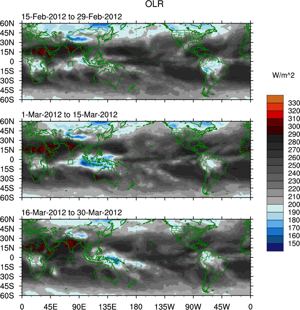 To identify tropical waves in near real-time, the OLR and UTWV data are filtered following Wheeler & Weickmann (2001 MWR). The daily anomalies are calculated using the first 3 harmonics of the seasonal cycle for 1979–2009. Missing values are then filled using linear interpolation in space and time. The most recent 365 days of anomalies are padded with 659 days of zeroes, and the result is filtered for each wave type.