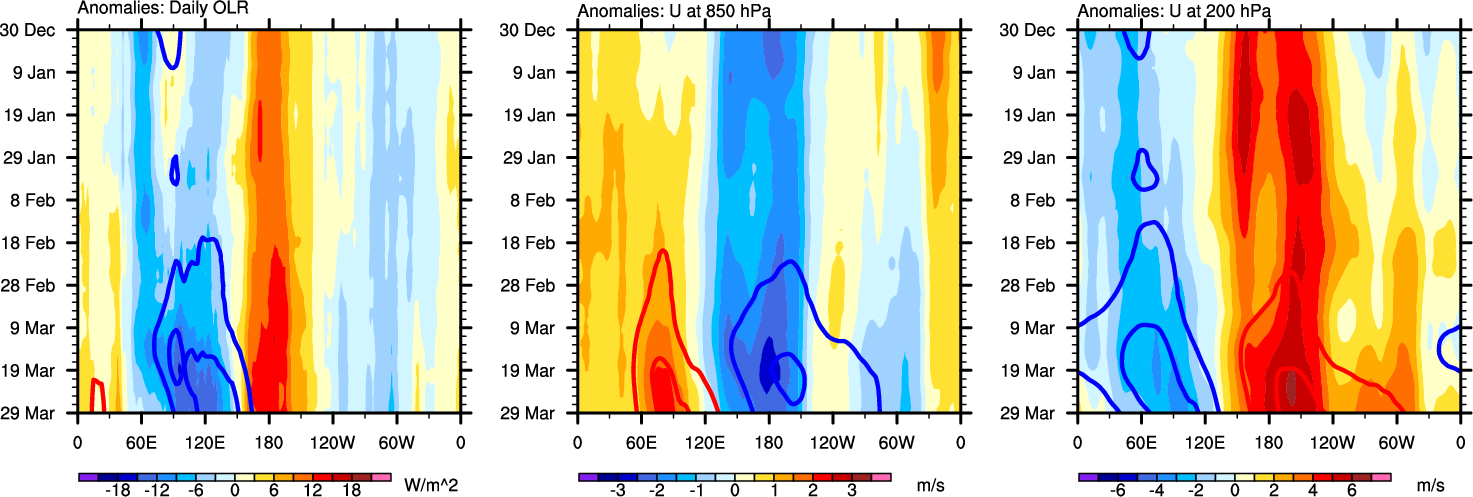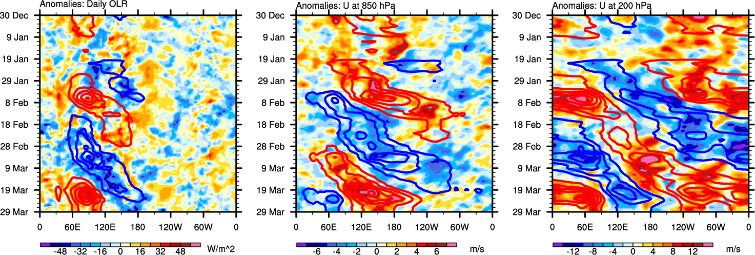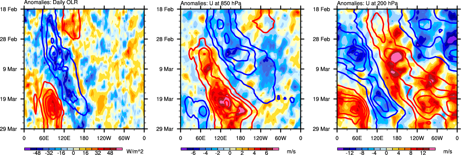 The Hovmollers show longitude-time plots for OLR, U-850, and U-200. The shading indicates the observed anomalies, while the contours are the projection of those anomalies onto the RMM EOFs.