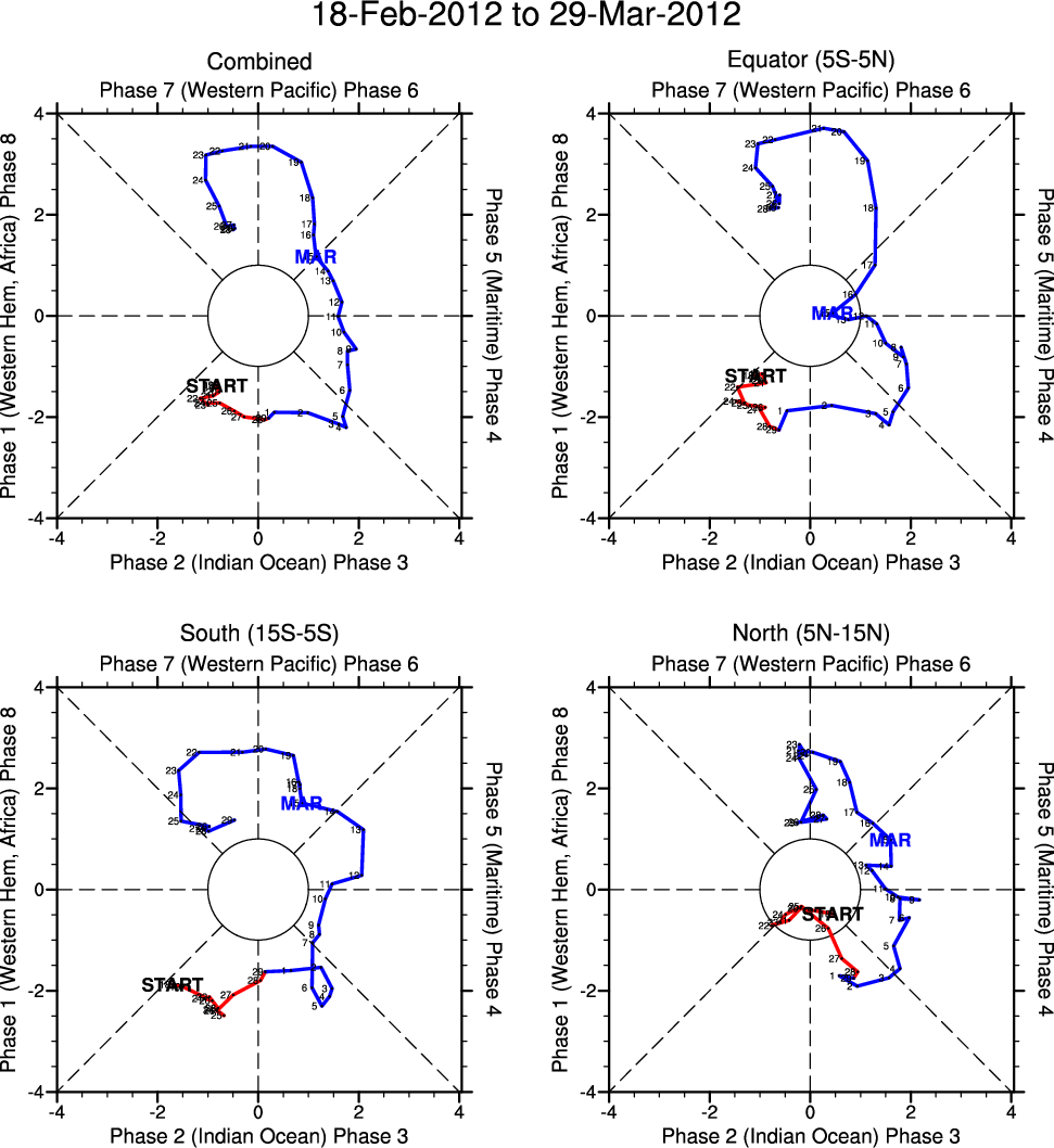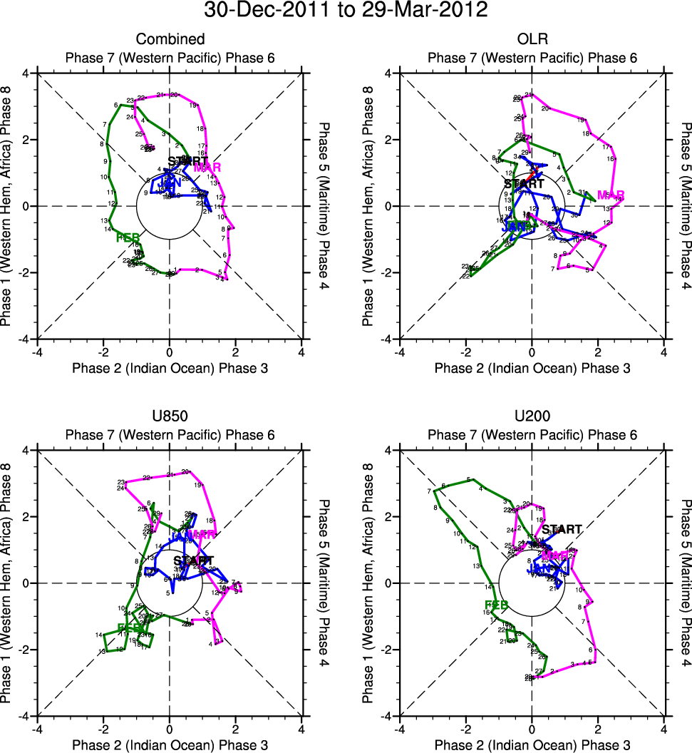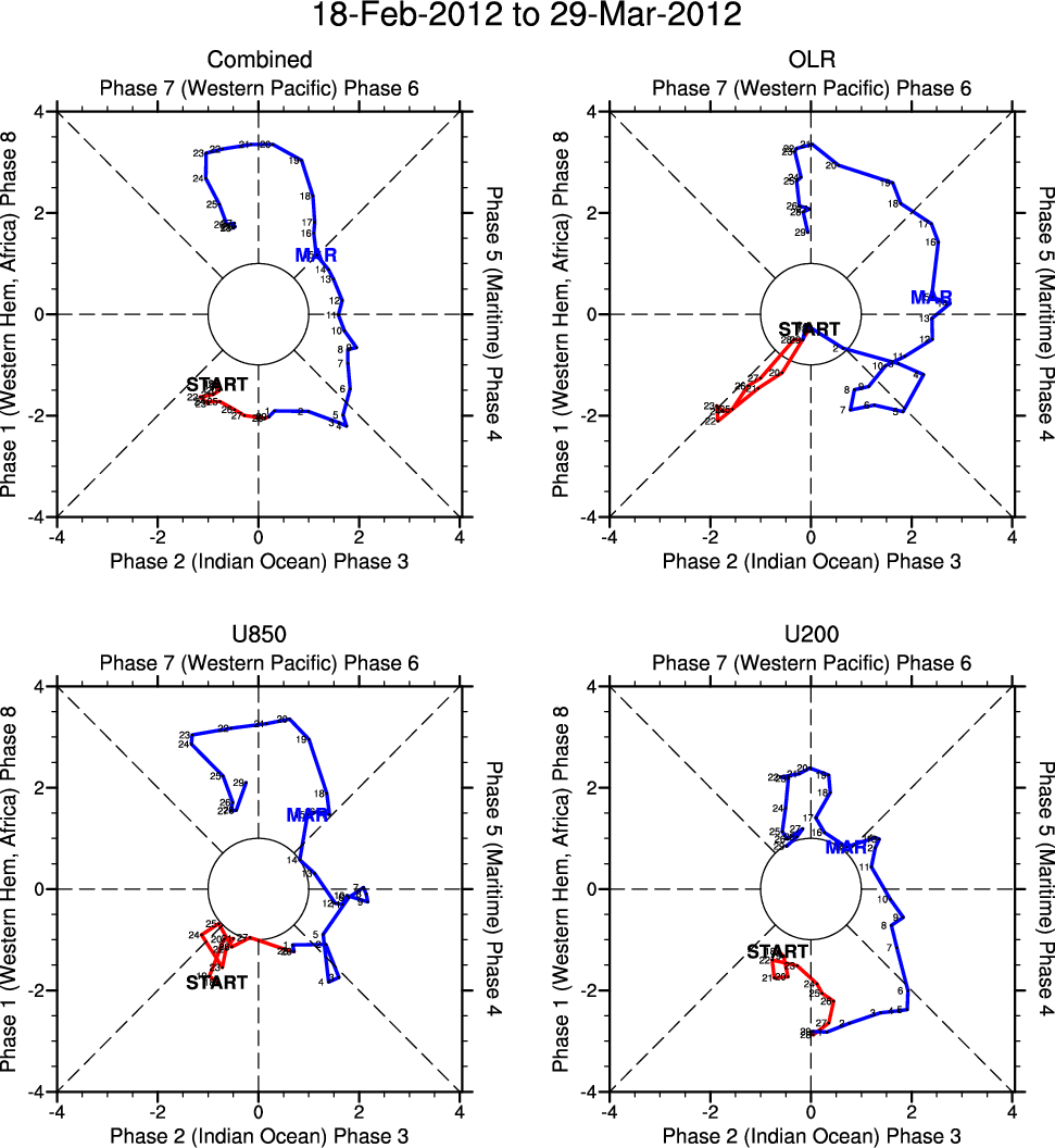 Wheeler and Hendon (2004) constructed the RMM index for monitoring the MJO. This index consists of the first two principal components (PCs) of OLR, 850-hPa zonal wind, and 200-hPa zonal wind averaged 15S-15N.