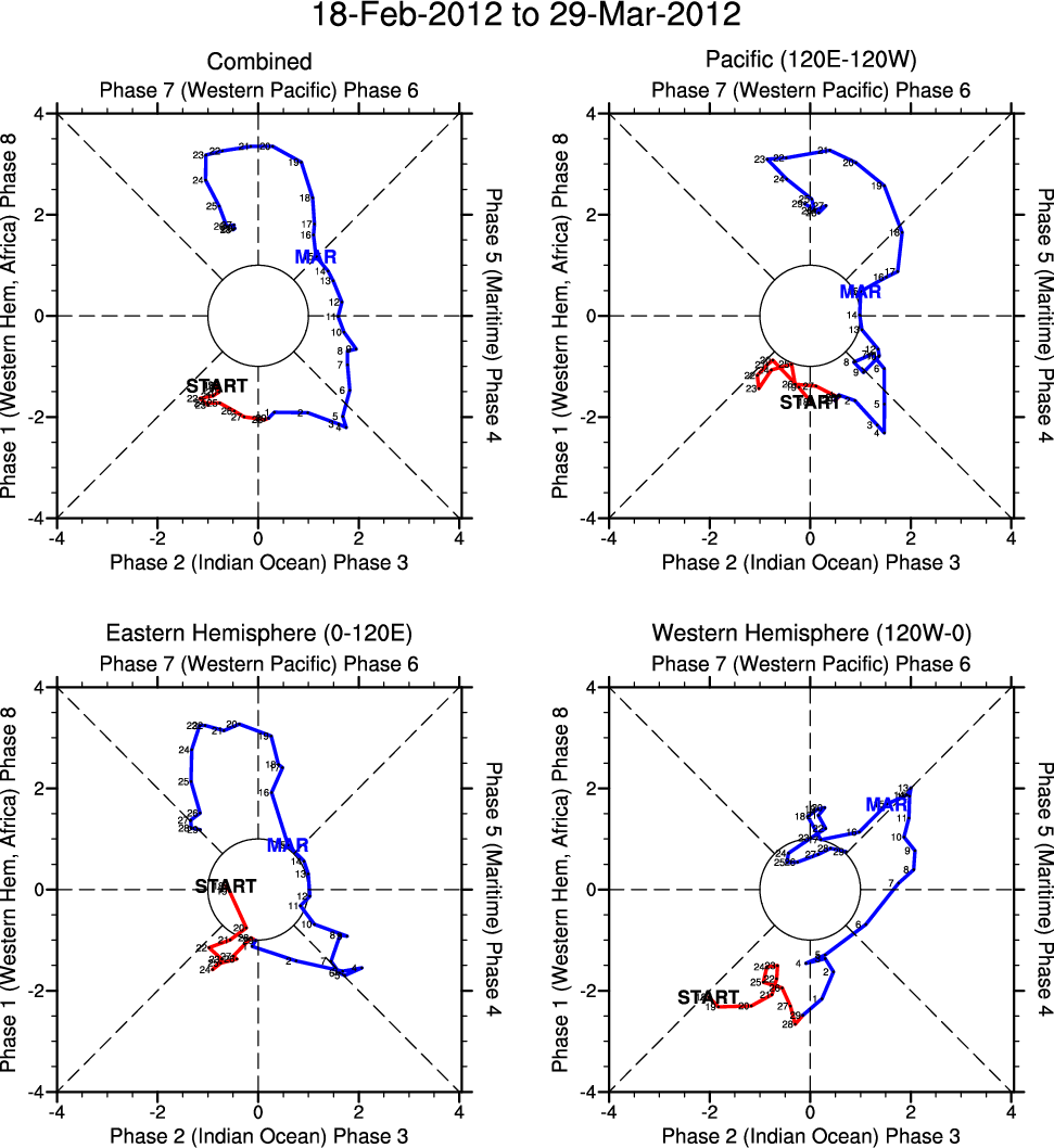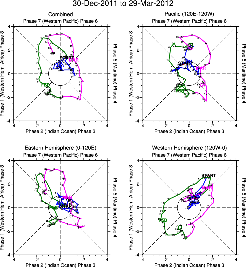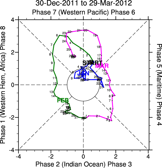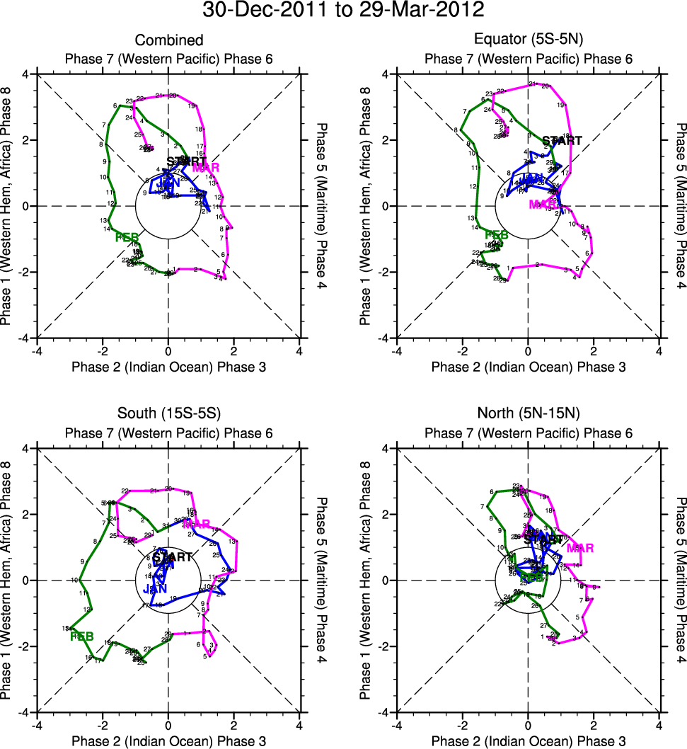 Wheeler and Hendon (2004) constructed the RMM index for monitoring the MJO. This index consists of the first two principal components (PCs) of OLR, 850-hPa zonal wind, and 200-hPa zonal wind averaged 15S-15N.