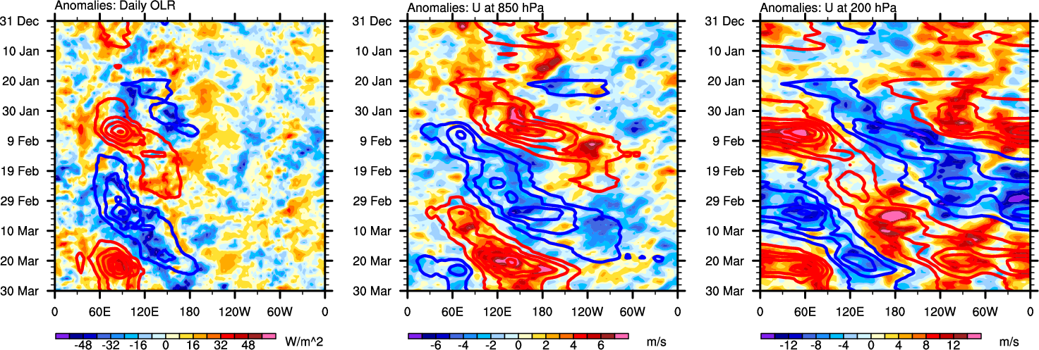 The Hovmollers show longitude-time plots for OLR, U-850, and U-200. The shading indicates the observed anomalies, while the contours are the projection of those anomalies onto the RMM EOFs.