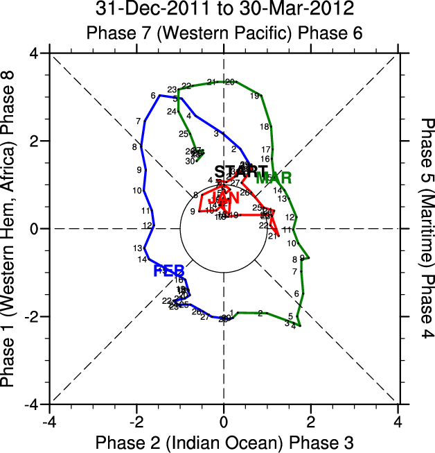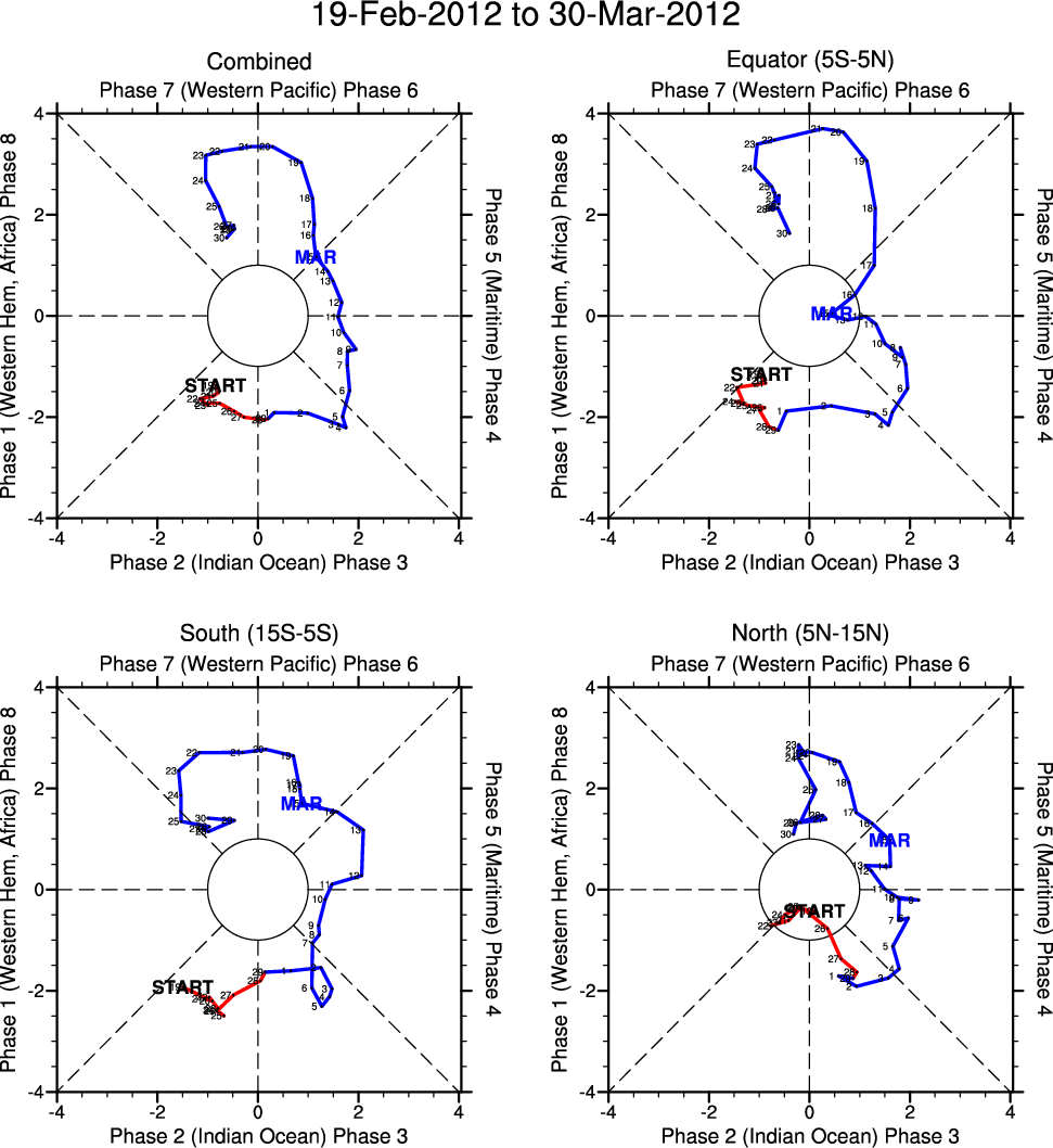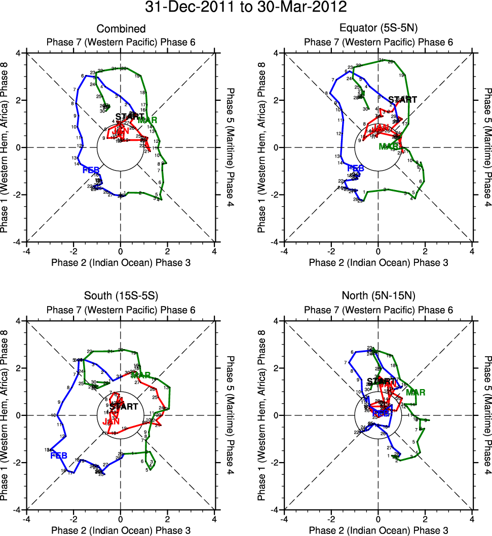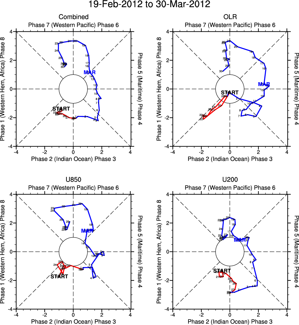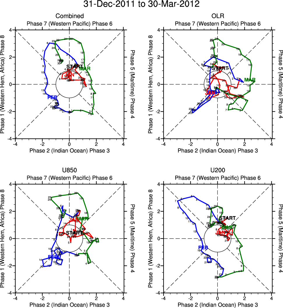 Wheeler and Hendon (2004) constructed the RMM index for monitoring the MJO. This index consists of the first two principal components (PCs) of OLR, 850-hPa zonal wind, and 200-hPa zonal wind averaged 15S-15N.