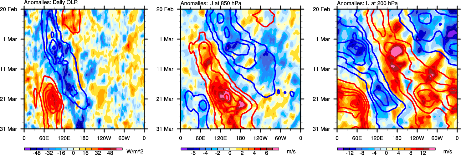 The Hovmollers show longitude-time plots for OLR, U-850, and U-200. The shading indicates the observed anomalies, while the contours are the projection of those anomalies onto the RMM EOFs.