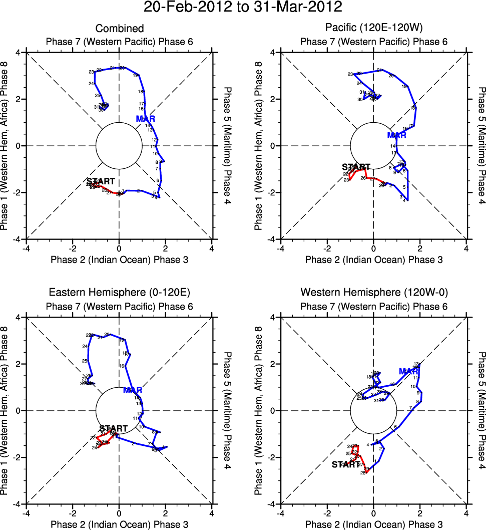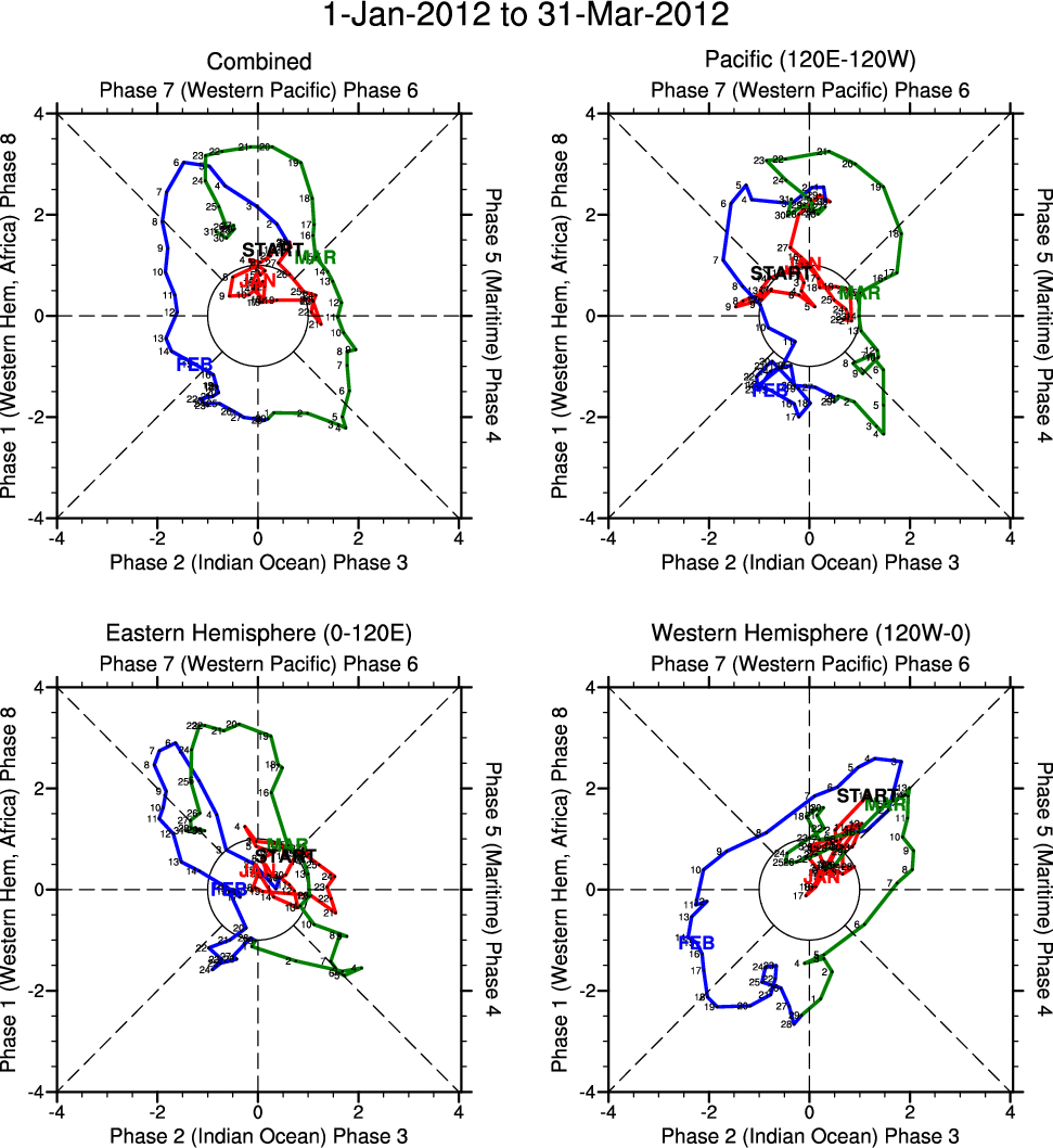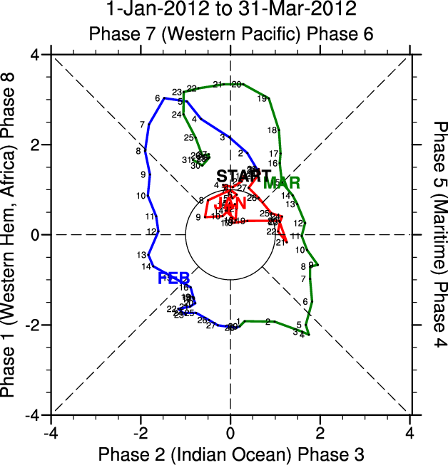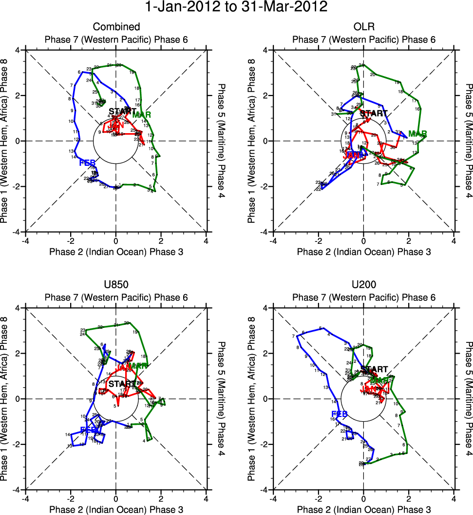 Wheeler and Hendon (2004) constructed the RMM index for monitoring the MJO. This index consists of the first two principal components (PCs) of OLR, 850-hPa zonal wind, and 200-hPa zonal wind averaged 15S-15N.