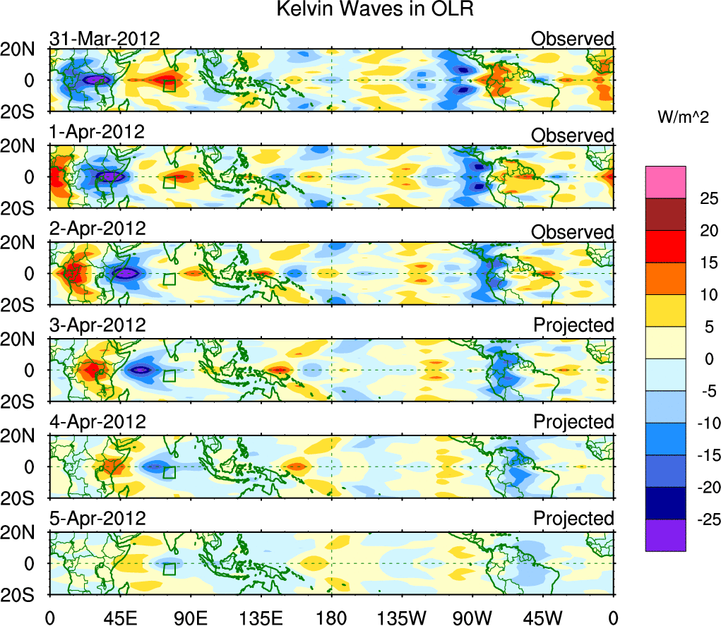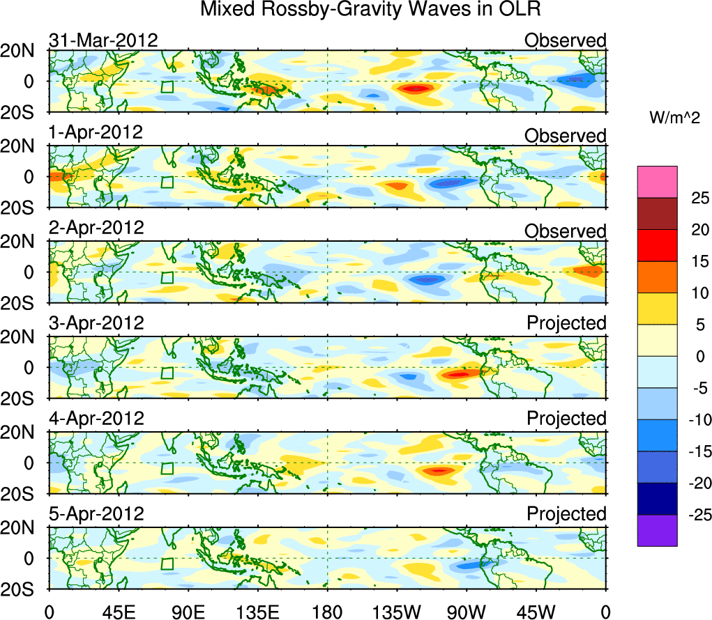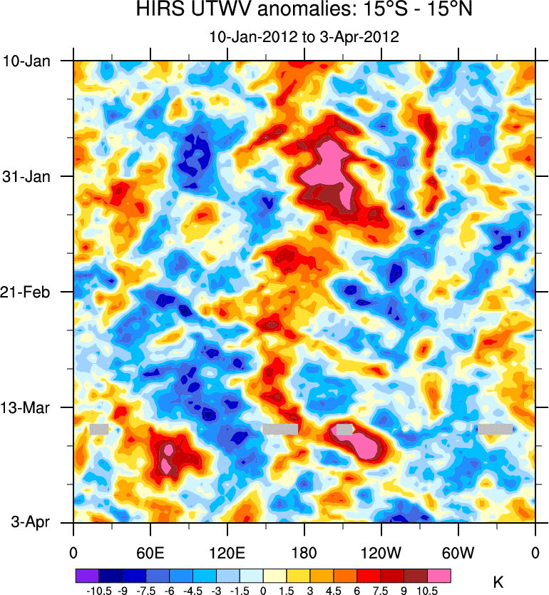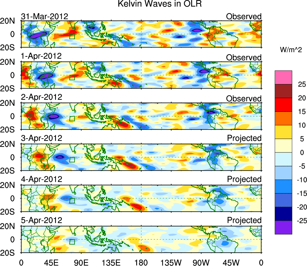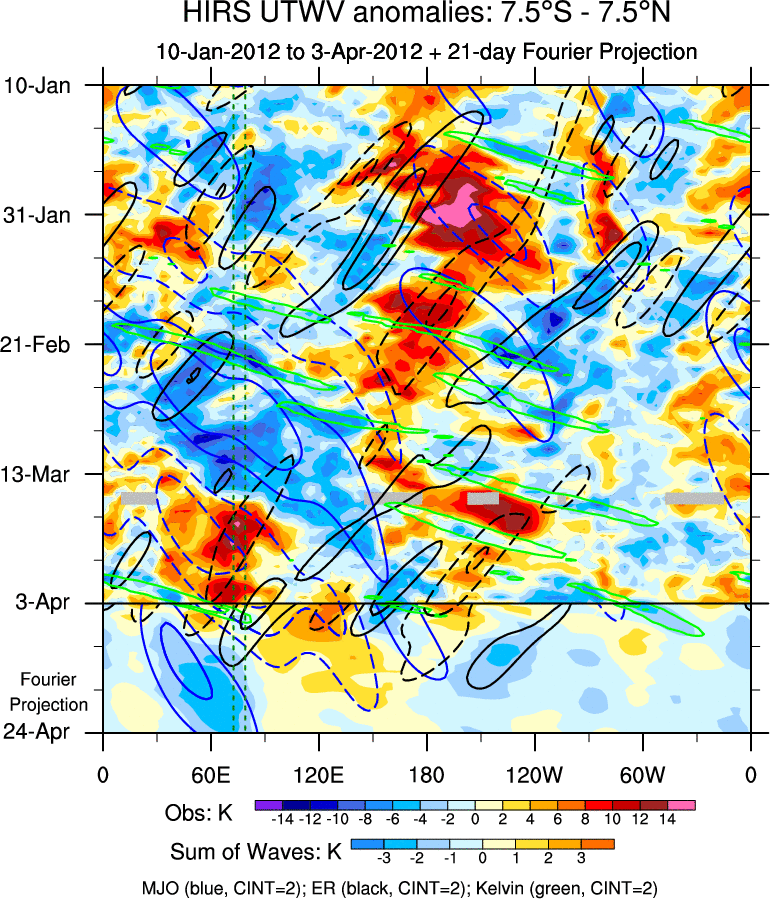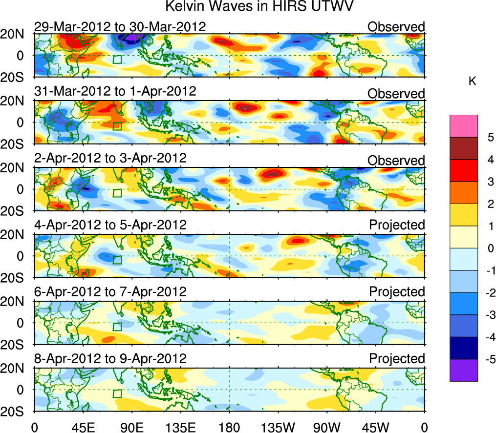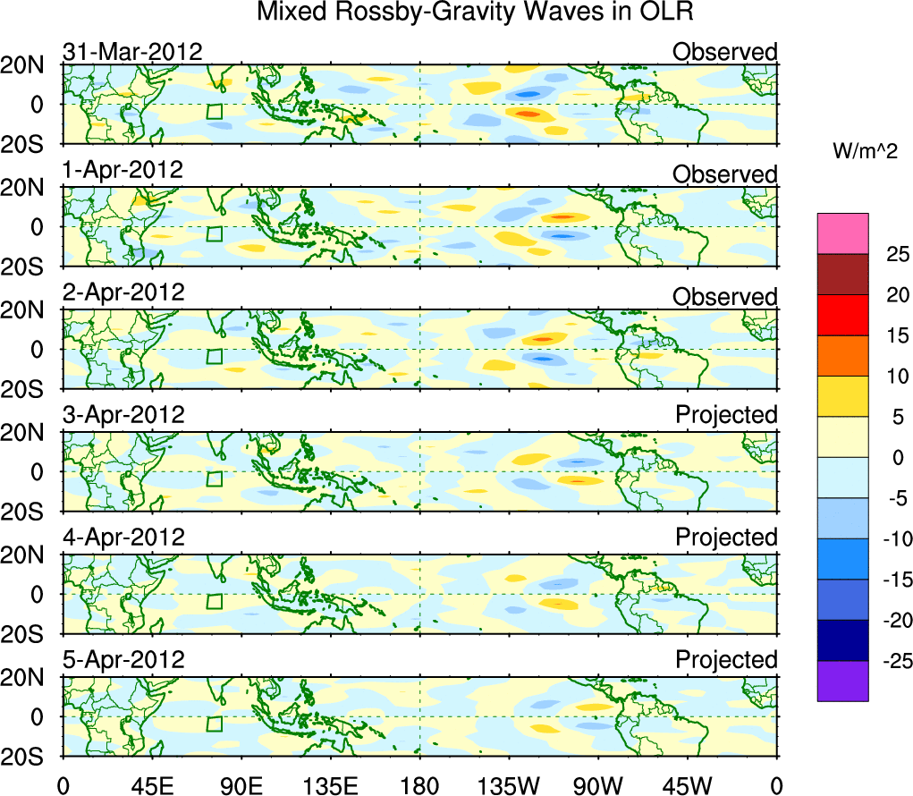 To identify tropical waves in near real-time, the OLR and UTWV data are filtered following Wheeler & Weickmann (2001 MWR). The daily anomalies are calculated using the first 3 harmonics of the seasonal cycle for 1979–2009. Missing values are then filled using linear interpolation in space and time. The most recent 365 days of anomalies are padded with 659 days of zeroes, and the result is filtered for each wave type.
