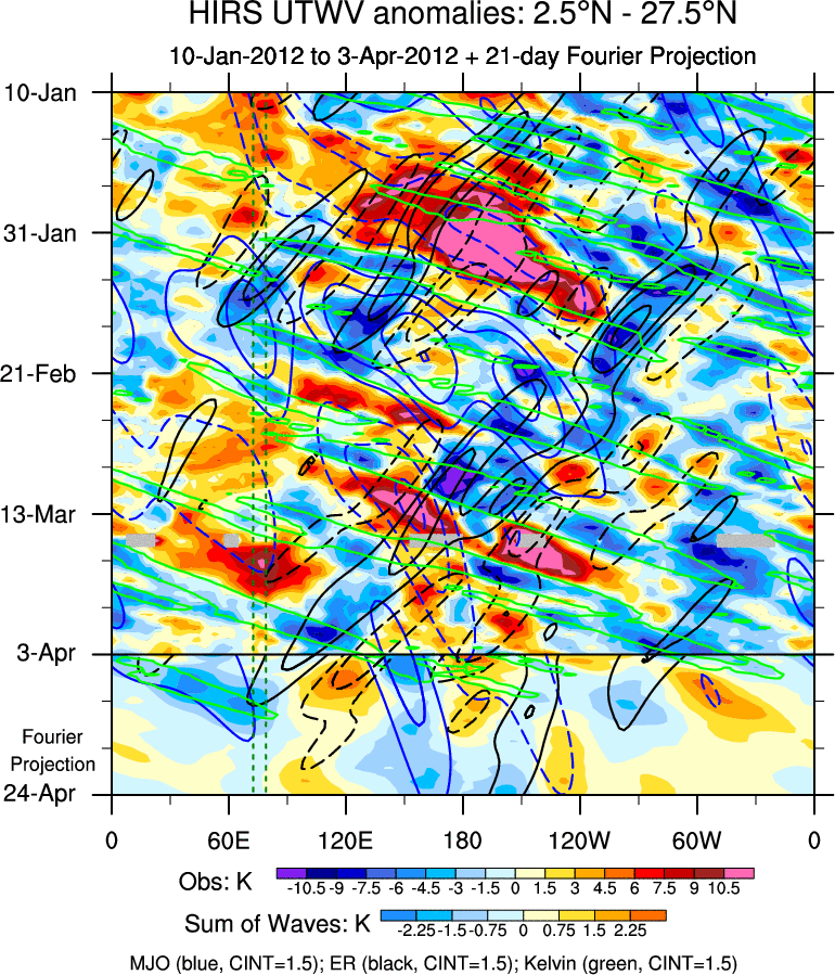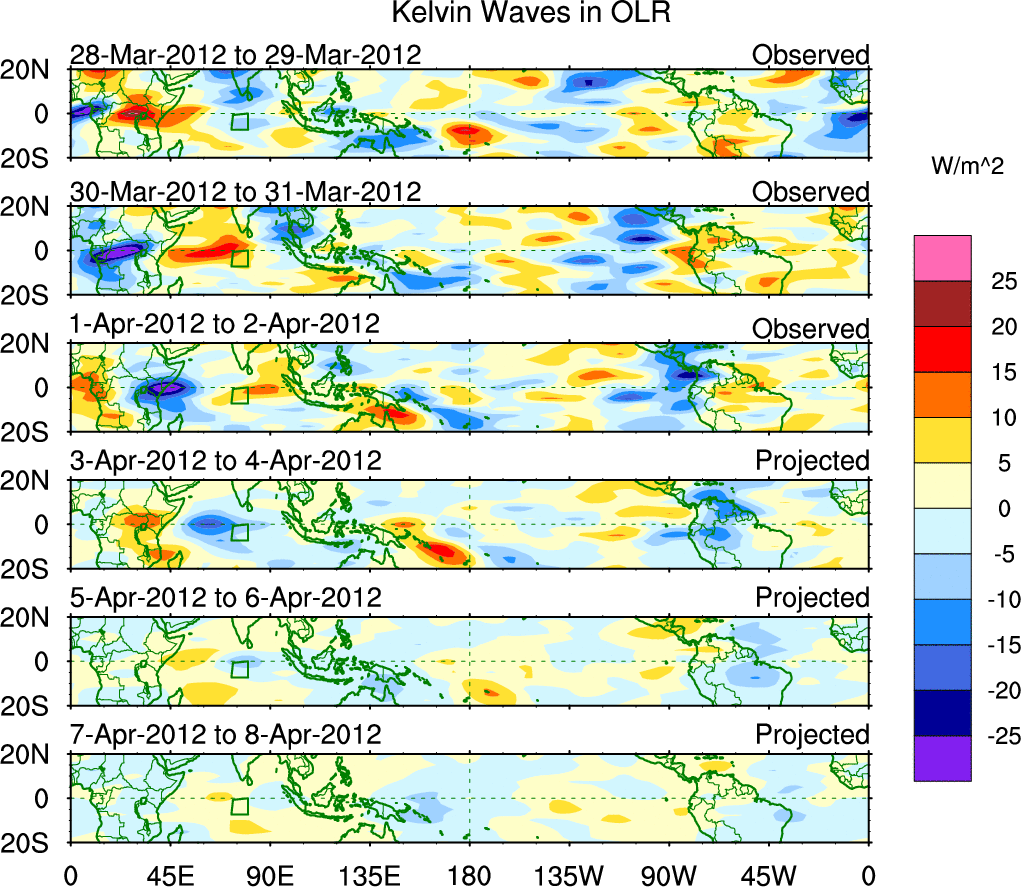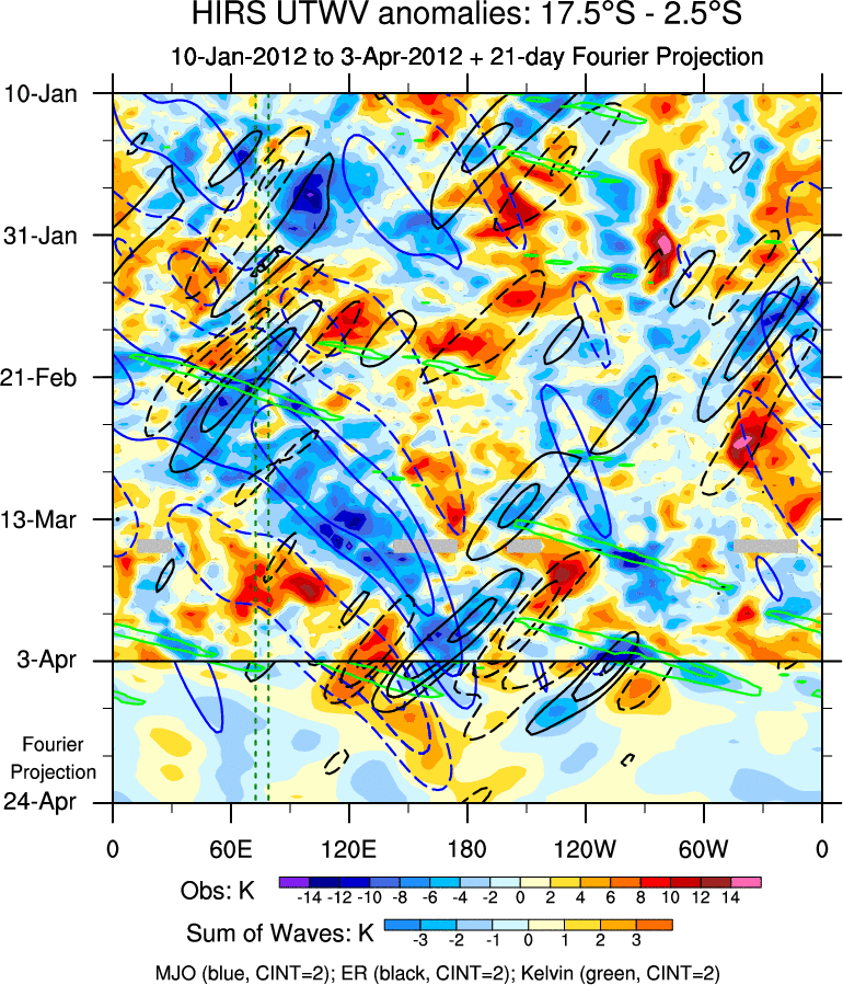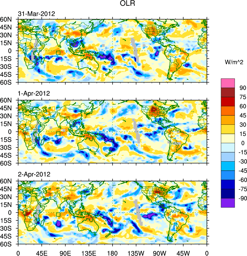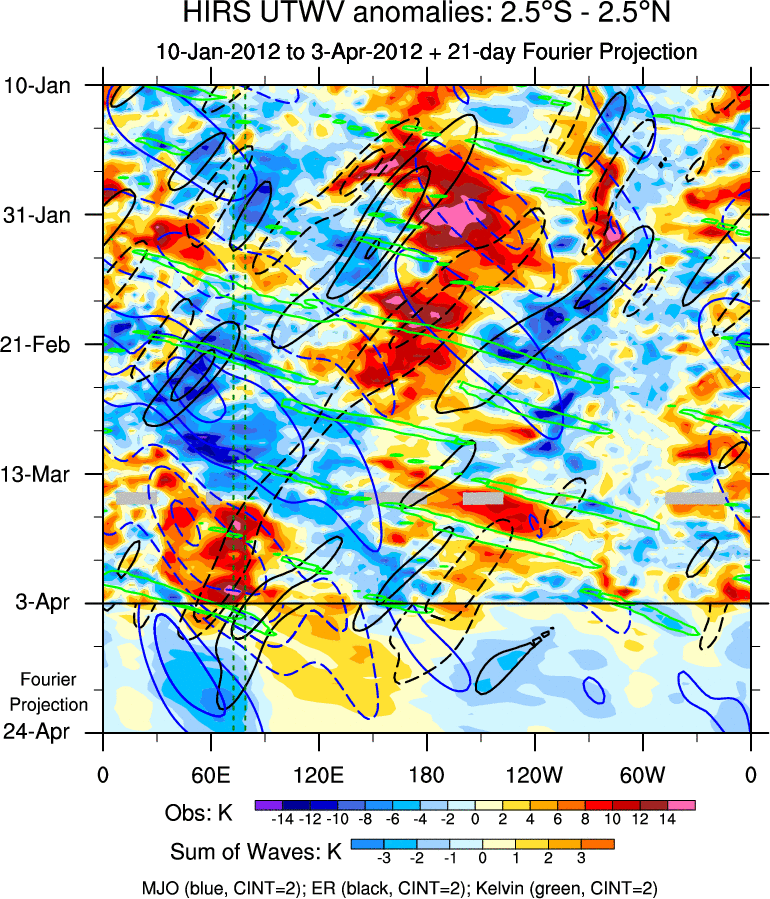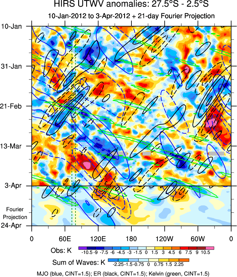 To identify tropical waves in near real-time, the OLR and UTWV data are filtered following Wheeler & Weickmann (2001 MWR). The daily anomalies are calculated using the first 3 harmonics of the seasonal cycle for 1979–2009. Missing values are then filled using linear interpolation in space and time. The most recent 365 days of anomalies are padded with 659 days of zeroes, and the result is filtered for each wave type.
