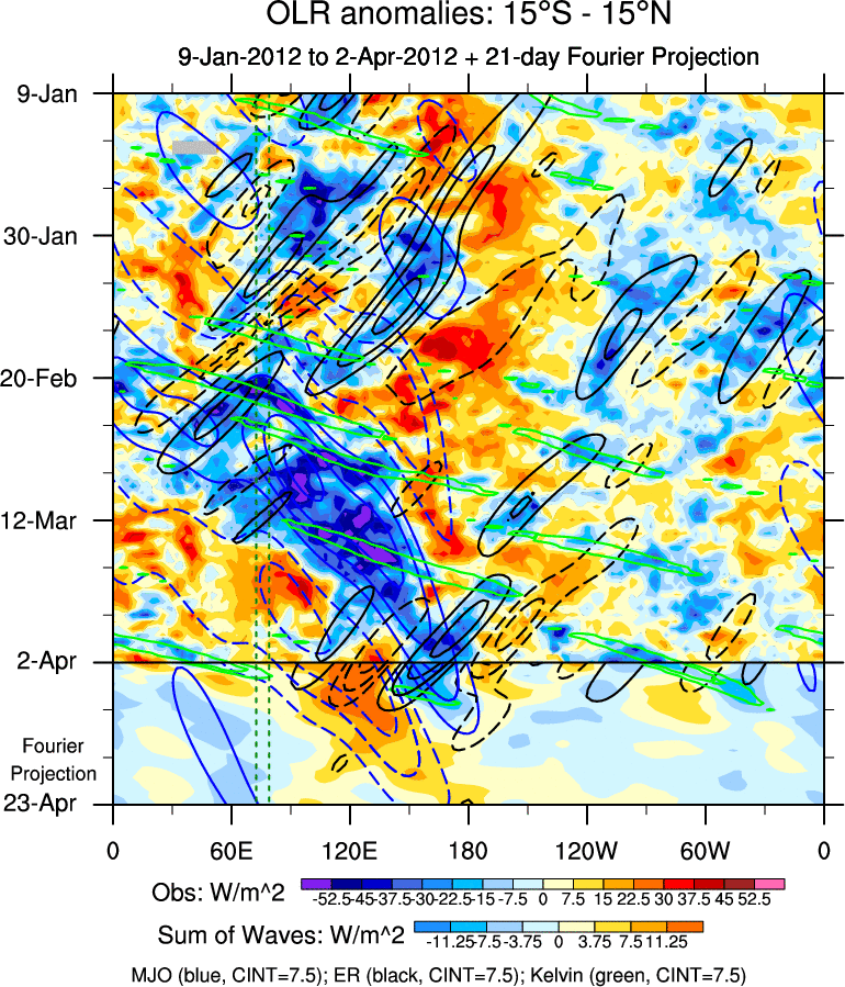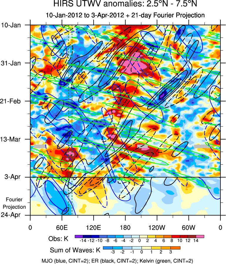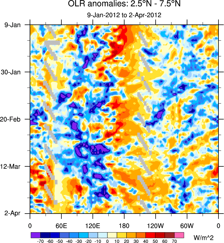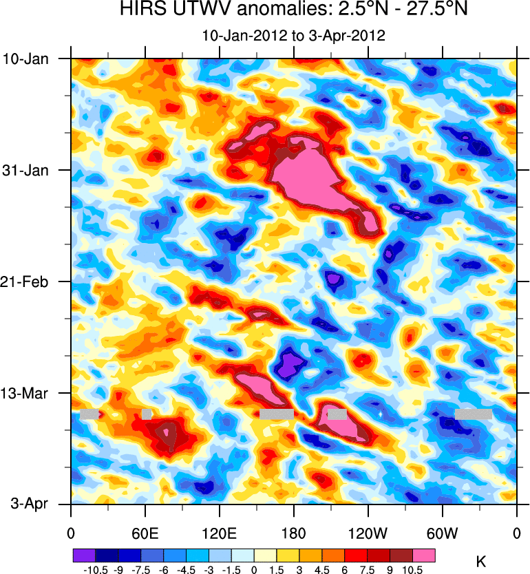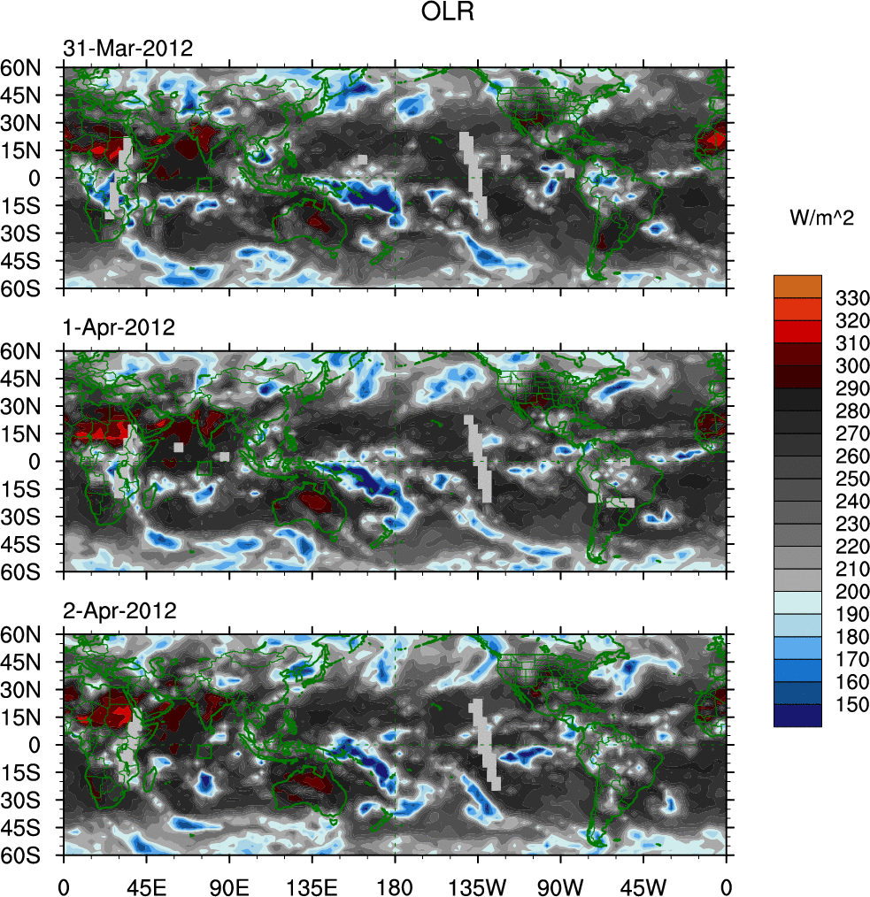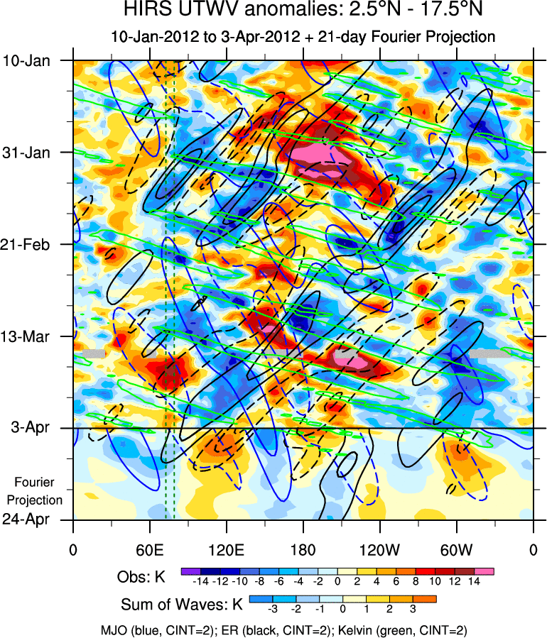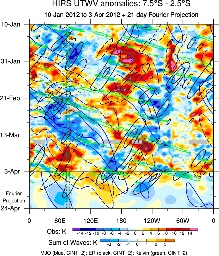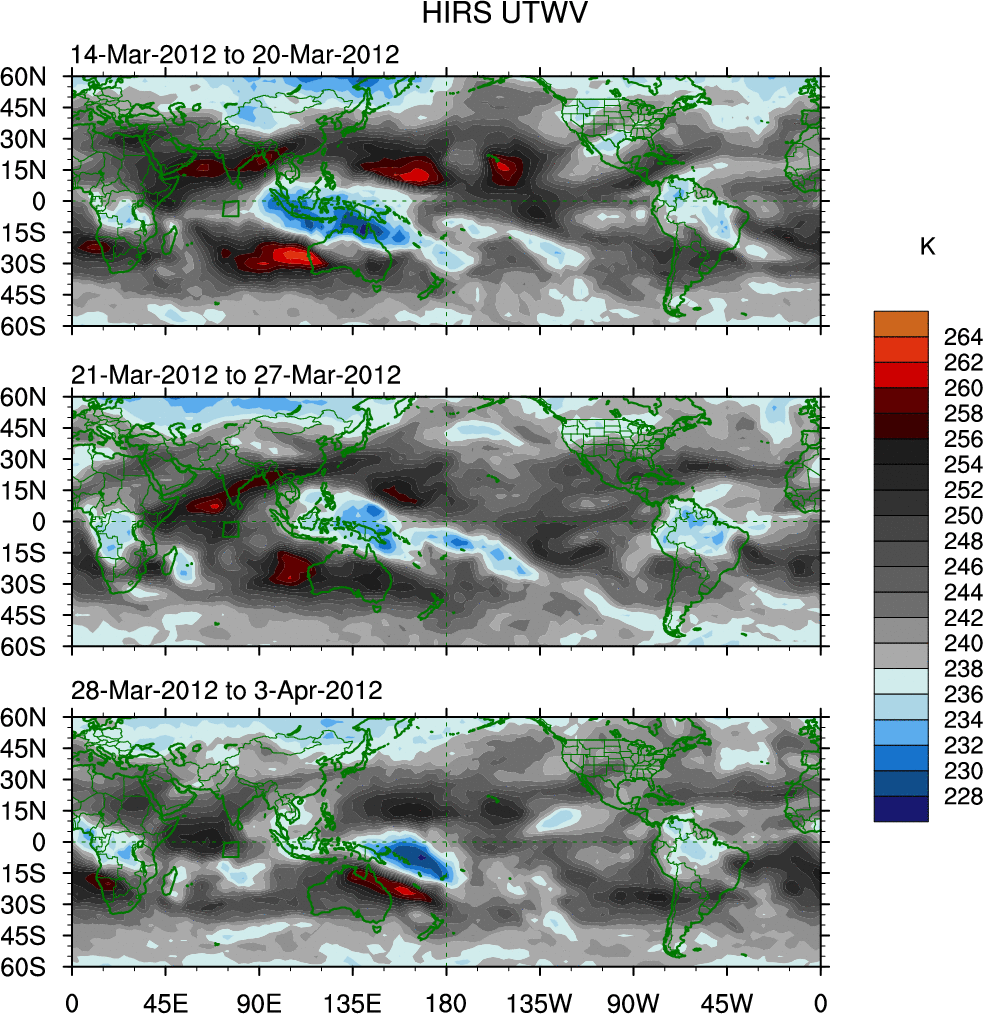 To identify tropical waves in near real-time, the OLR and UTWV data are filtered following Wheeler & Weickmann (2001 MWR). The daily anomalies are calculated using the first 3 harmonics of the seasonal cycle for 1979–2009. Missing values are then filled using linear interpolation in space and time. The most recent 365 days of anomalies are padded with 659 days of zeroes, and the result is filtered for each wave type.