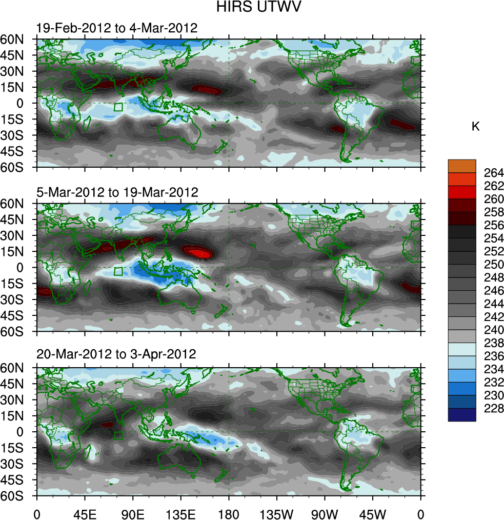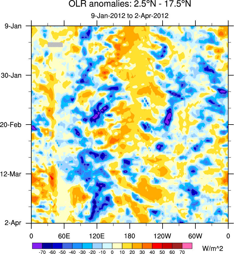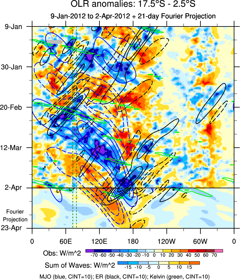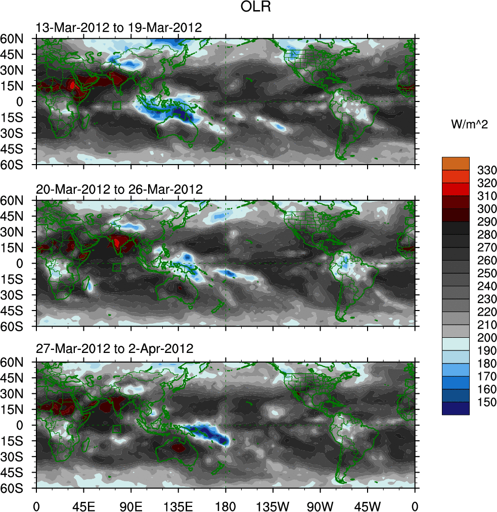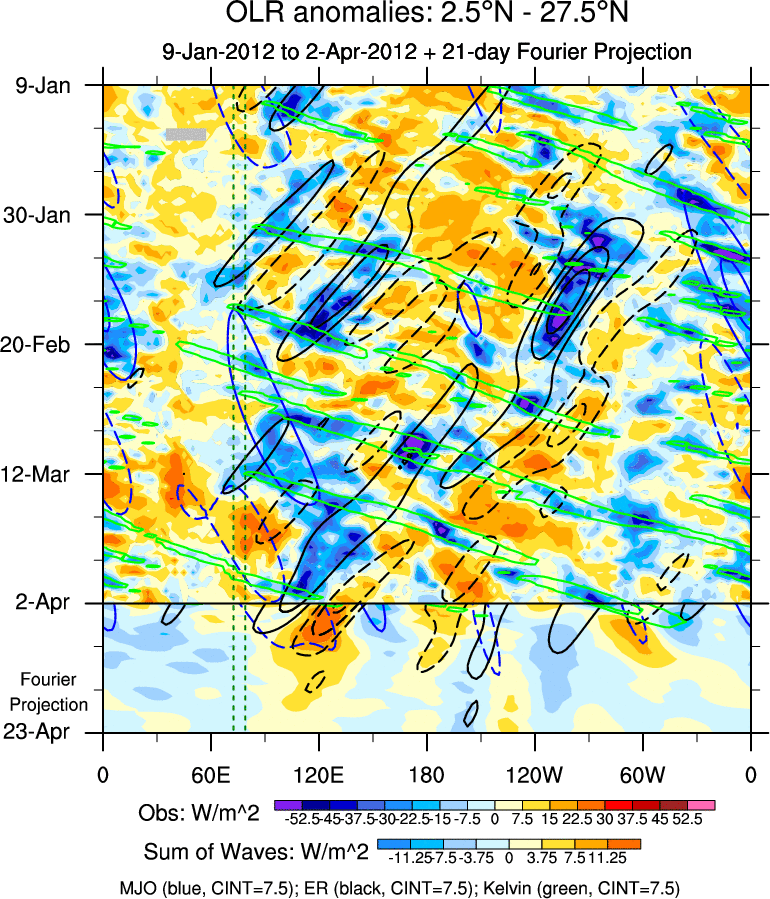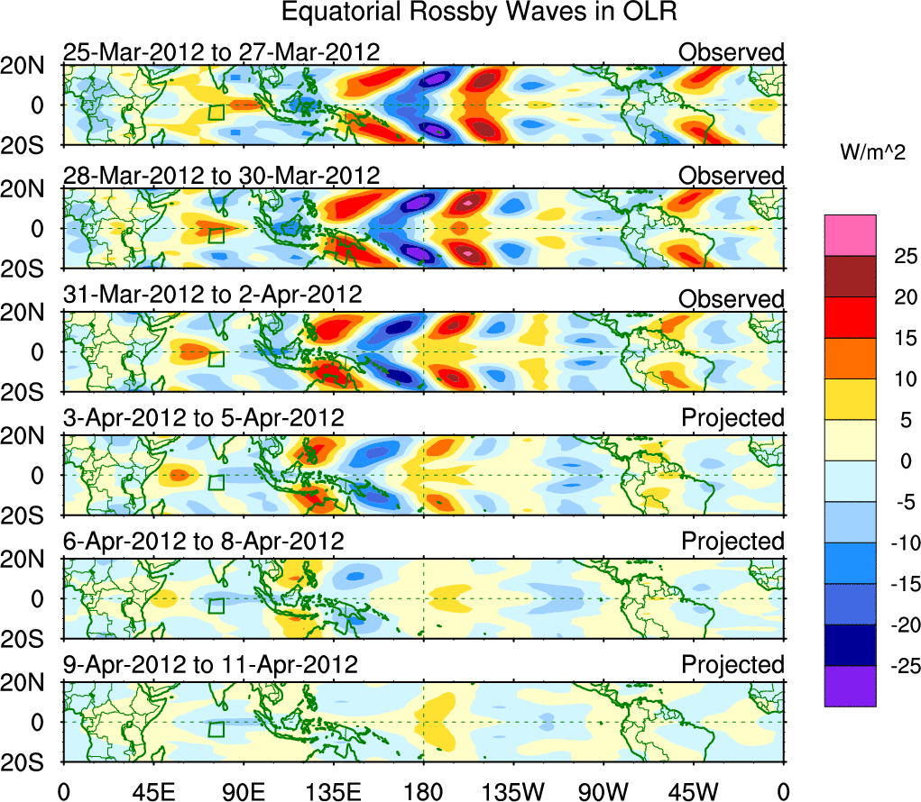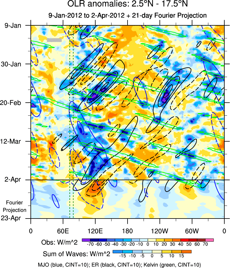 To identify tropical waves in near real-time, the OLR and UTWV data are filtered following Wheeler & Weickmann (2001 MWR). The daily anomalies are calculated using the first 3 harmonics of the seasonal cycle for 1979–2009. Missing values are then filled using linear interpolation in space and time. The most recent 365 days of anomalies are padded with 659 days of zeroes, and the result is filtered for each wave type.