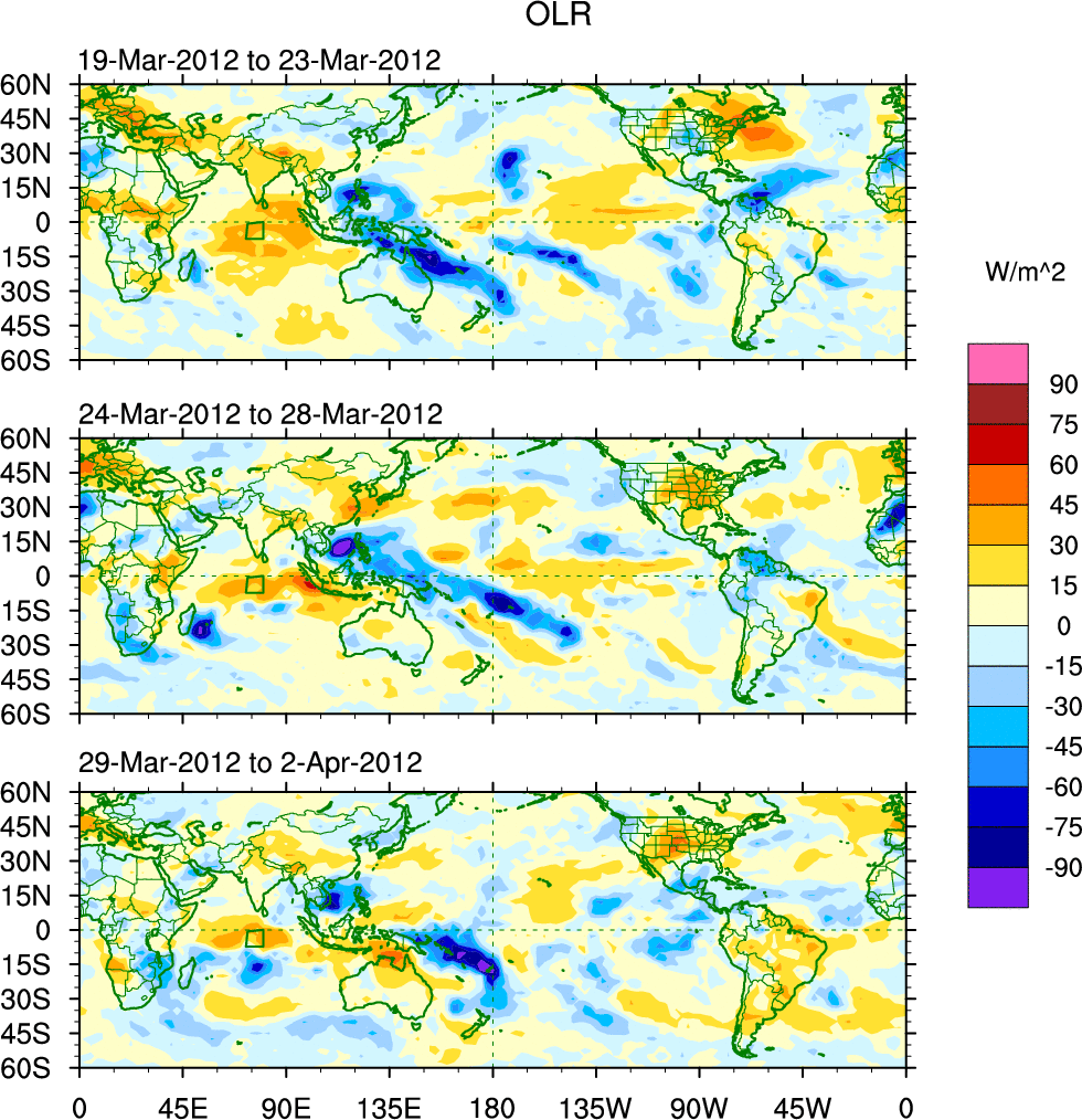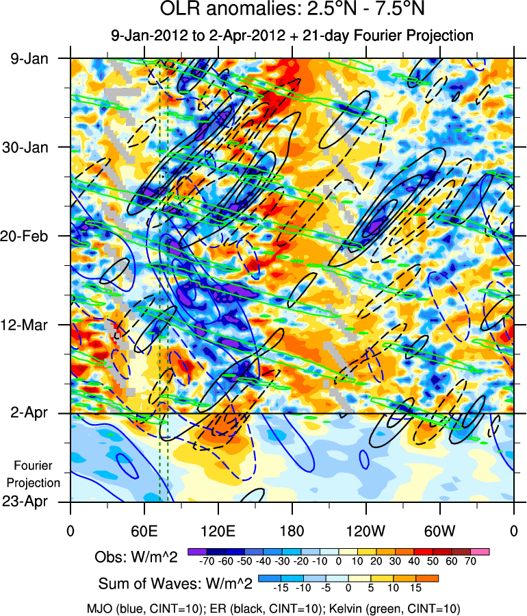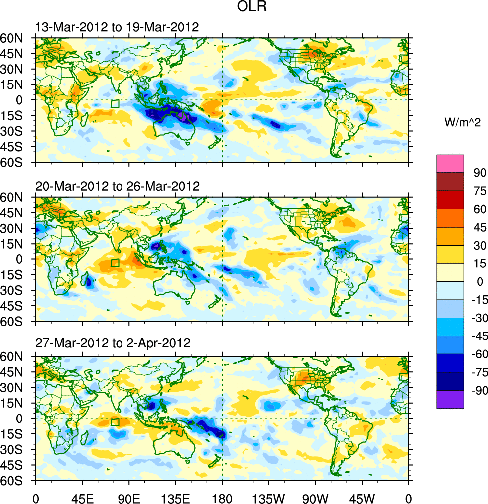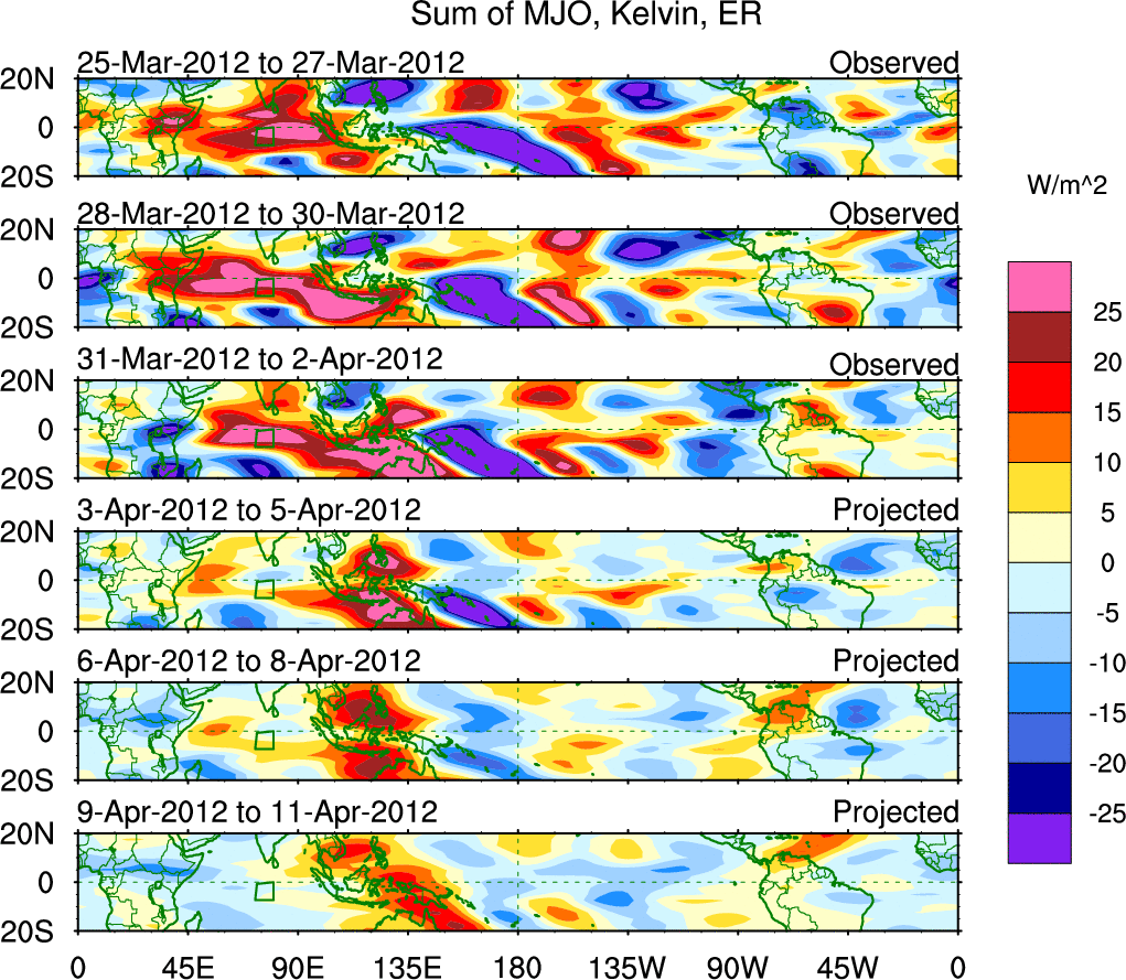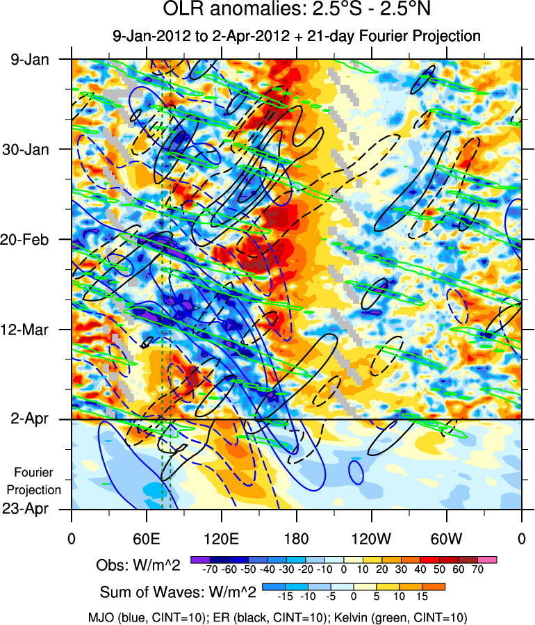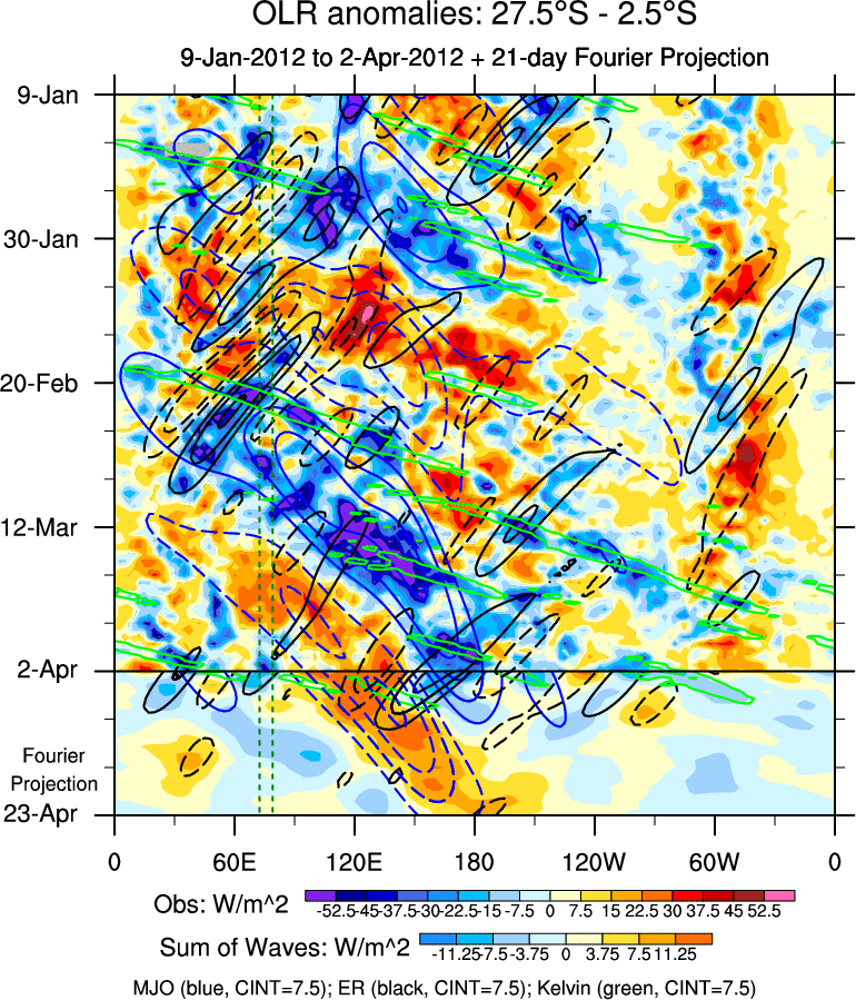 To identify tropical waves in near real-time, the OLR and UTWV data are filtered following Wheeler & Weickmann (2001 MWR). The daily anomalies are calculated using the first 3 harmonics of the seasonal cycle for 1979–2009. Missing values are then filled using linear interpolation in space and time. The most recent 365 days of anomalies are padded with 659 days of zeroes, and the result is filtered for each wave type.