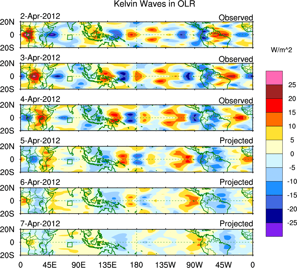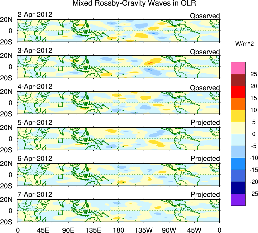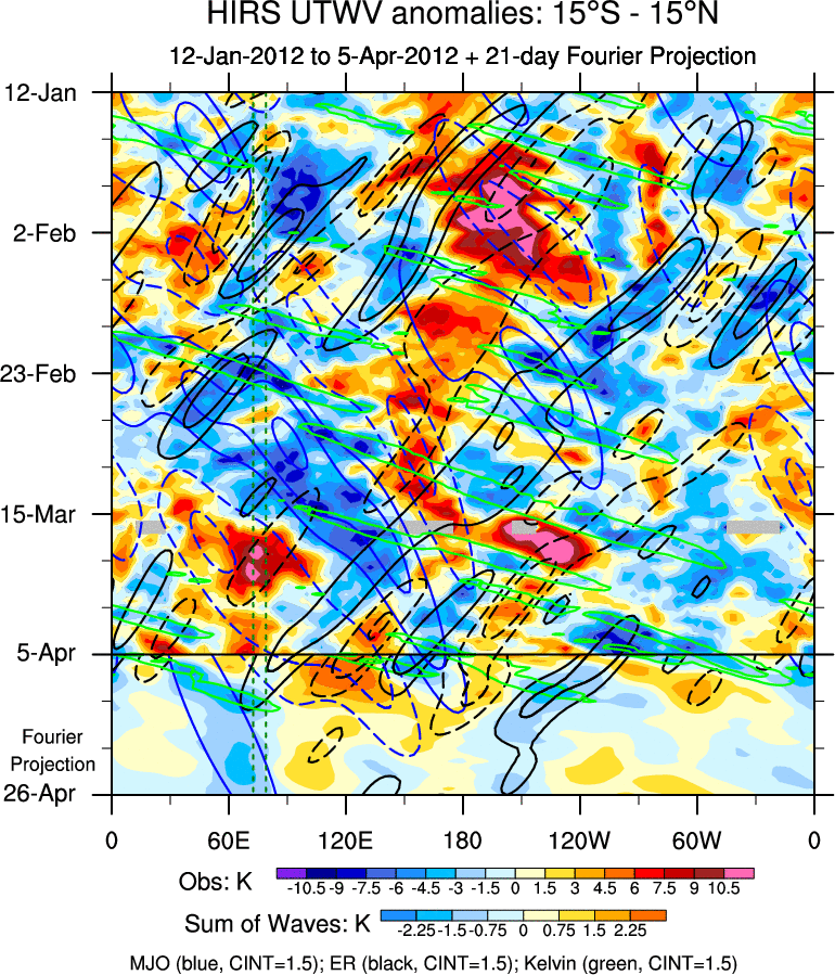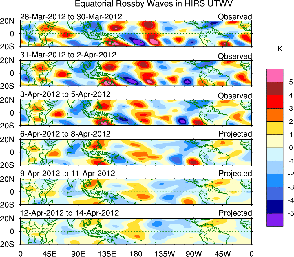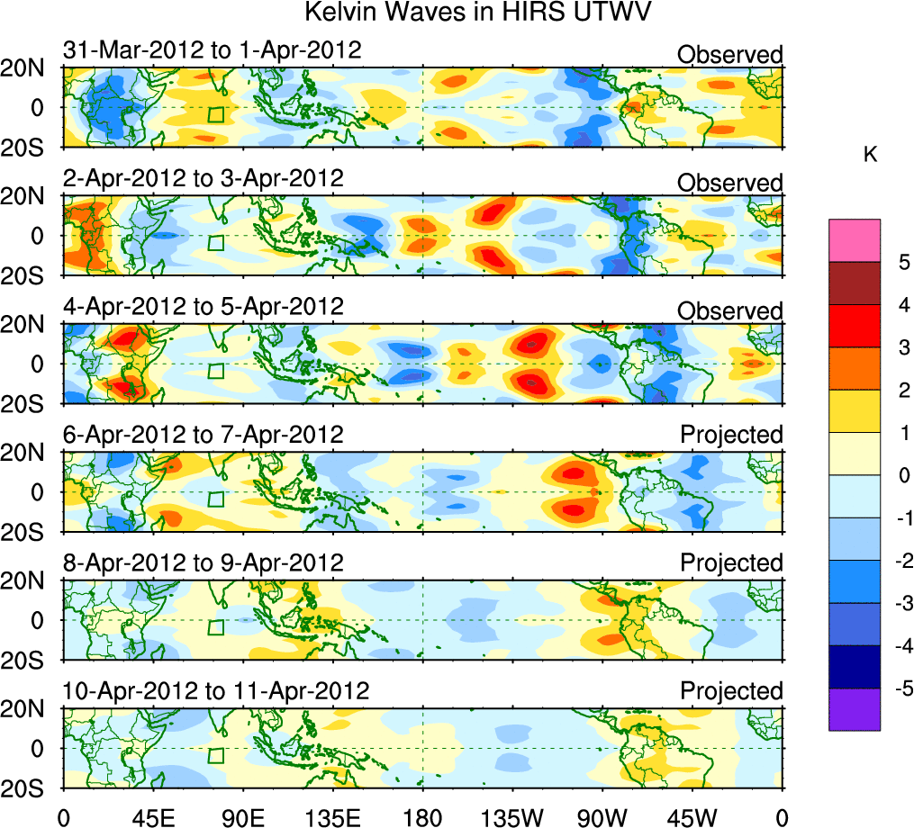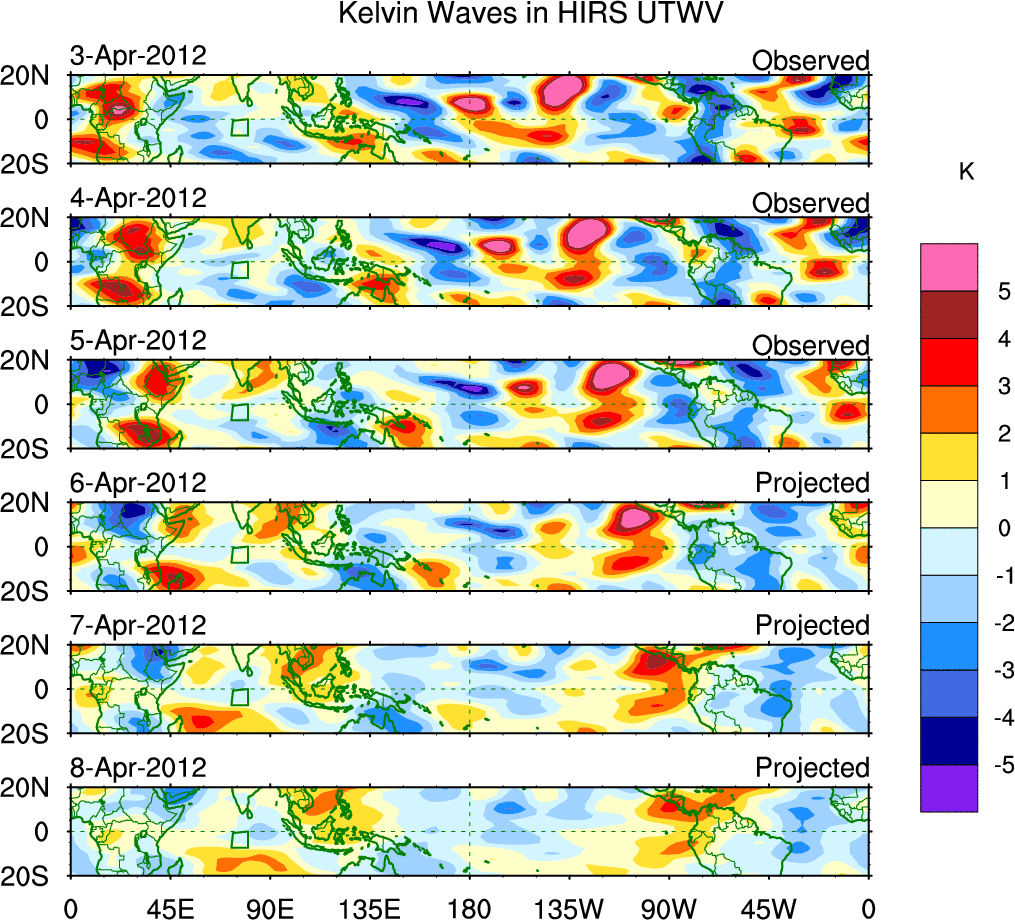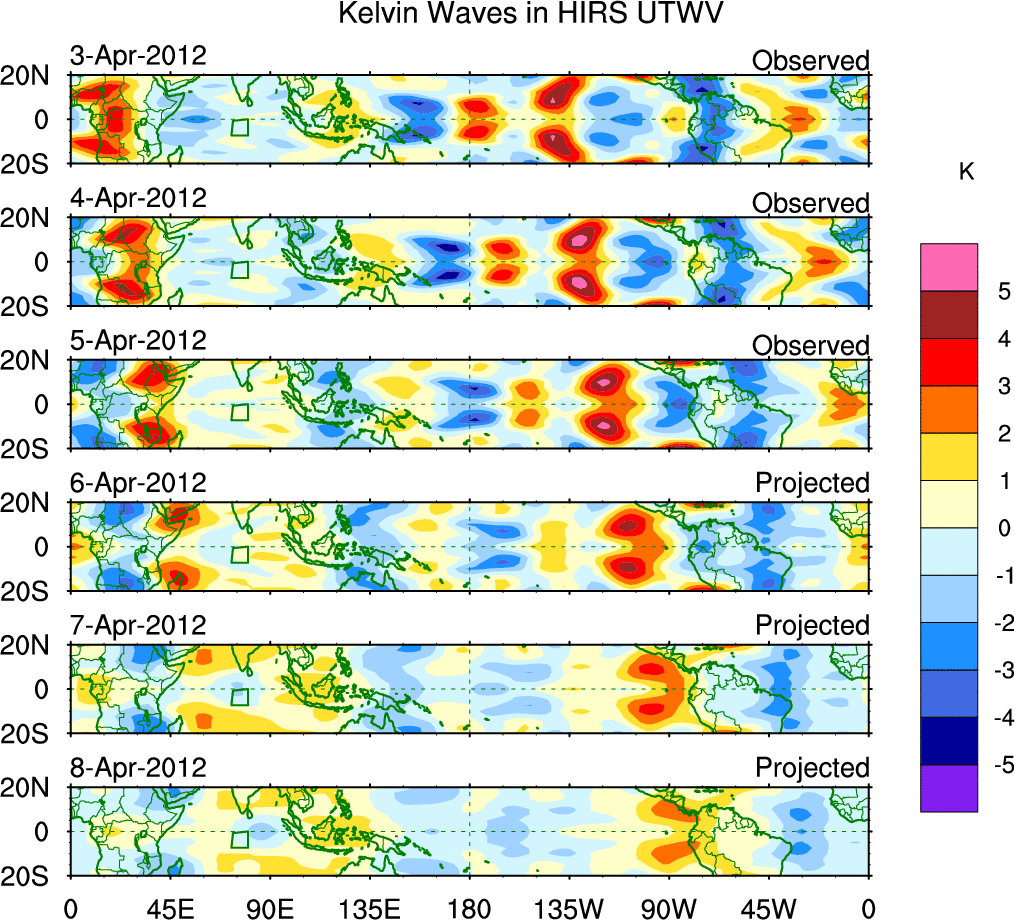 To identify tropical waves in near real-time, the OLR and UTWV data are filtered following Wheeler & Weickmann (2001 MWR). The daily anomalies are calculated using the first 3 harmonics of the seasonal cycle for 1979–2009. Missing values are then filled using linear interpolation in space and time. The most recent 365 days of anomalies are padded with 659 days of zeroes, and the result is filtered for each wave type.