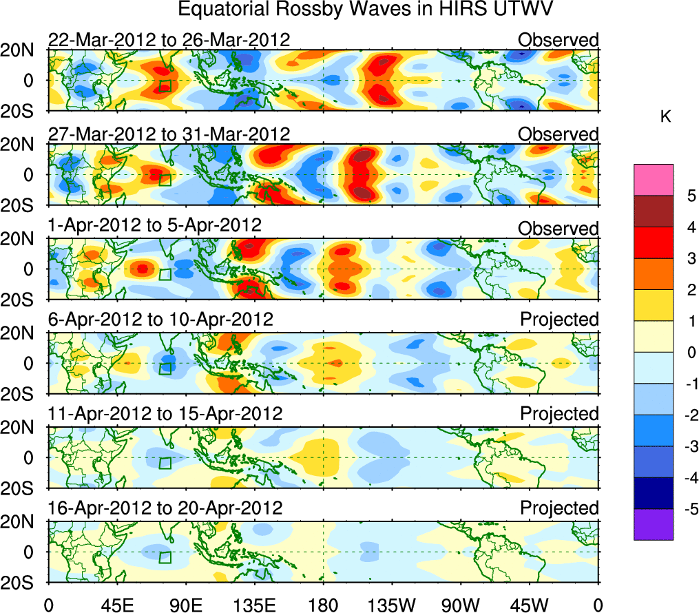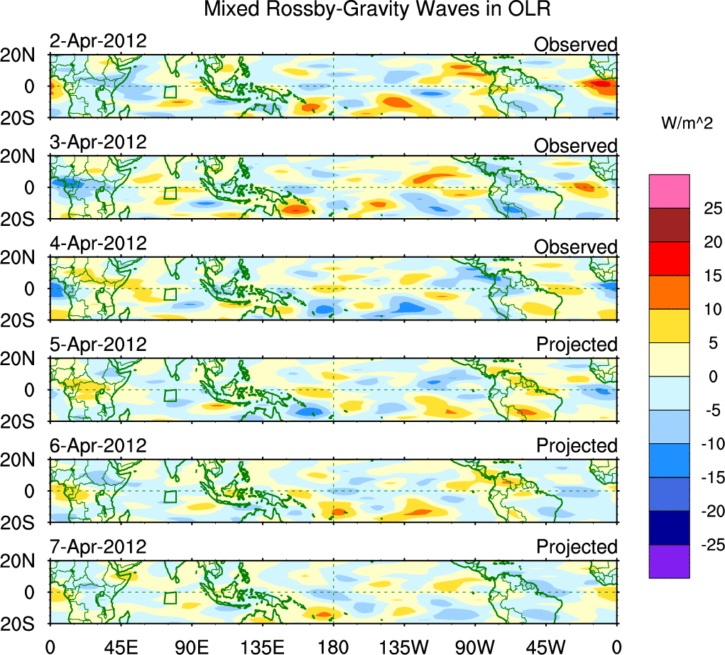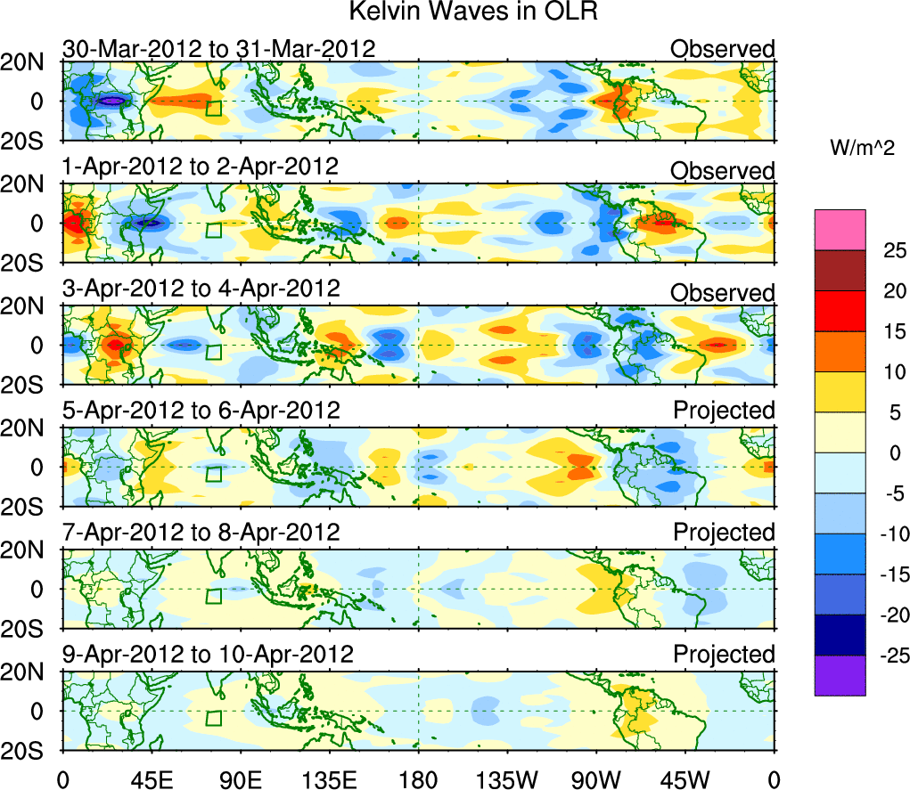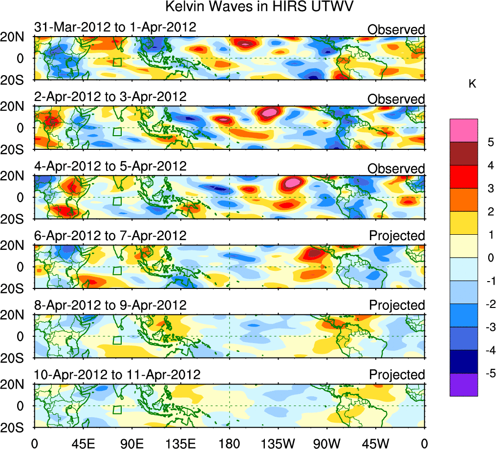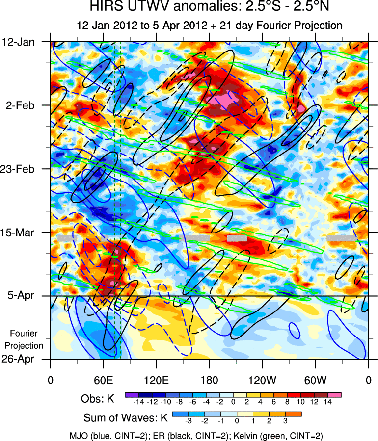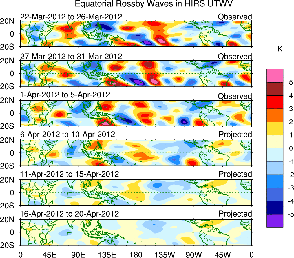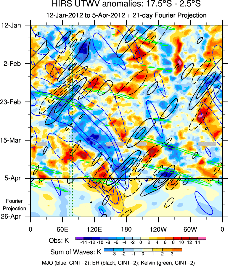 To identify tropical waves in near real-time, the OLR and UTWV data are filtered following Wheeler & Weickmann (2001 MWR). The daily anomalies are calculated using the first 3 harmonics of the seasonal cycle for 1979–2009. Missing values are then filled using linear interpolation in space and time. The most recent 365 days of anomalies are padded with 659 days of zeroes, and the result is filtered for each wave type.