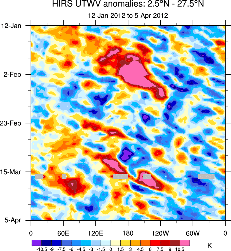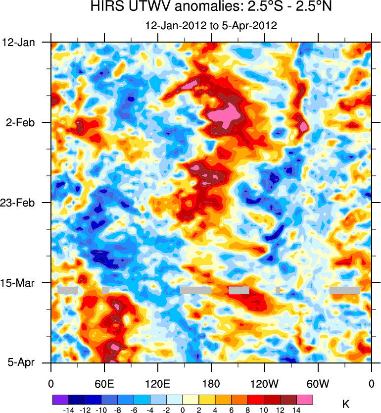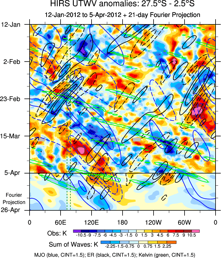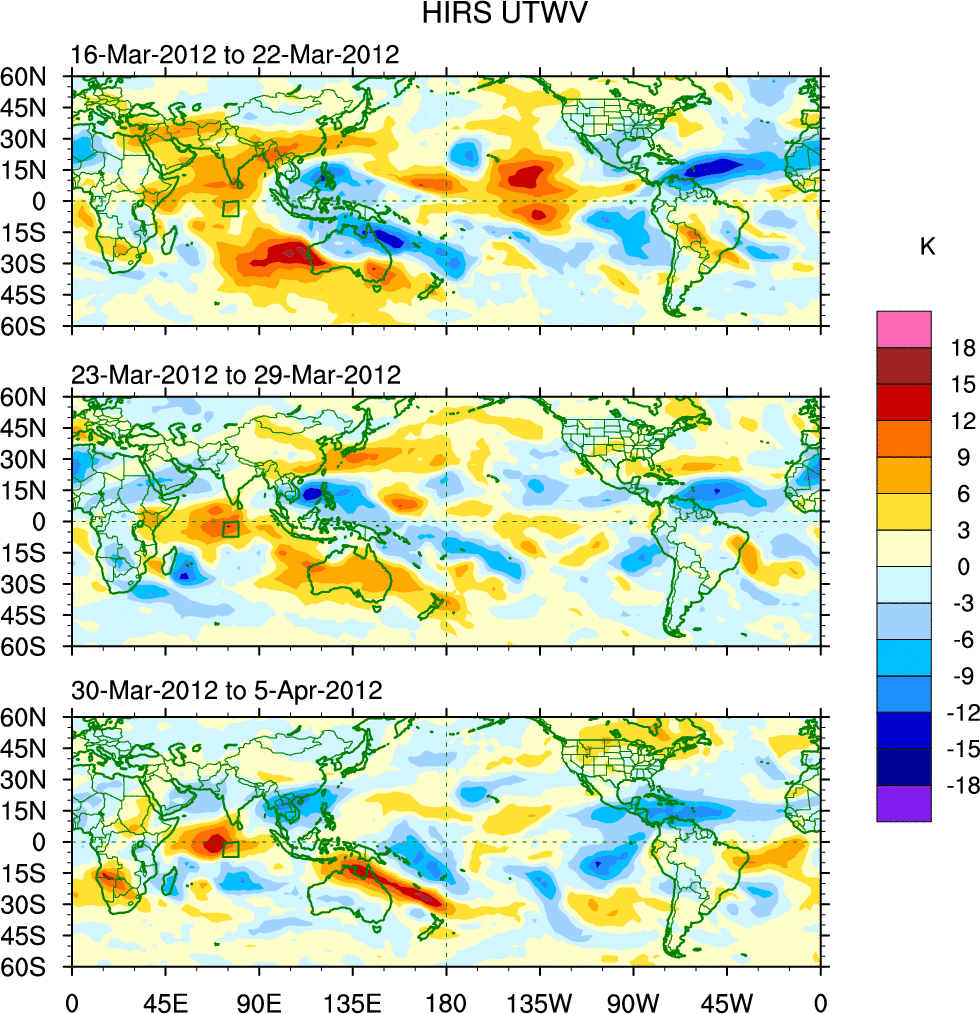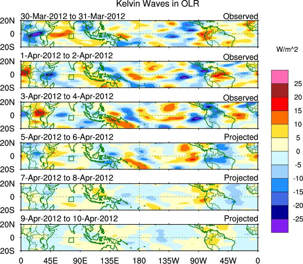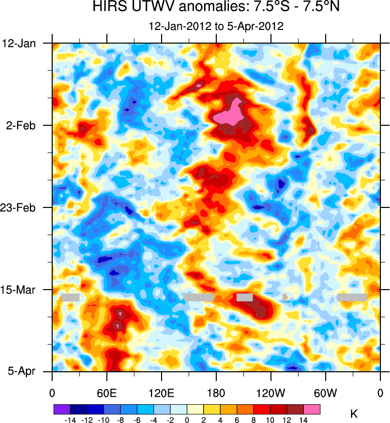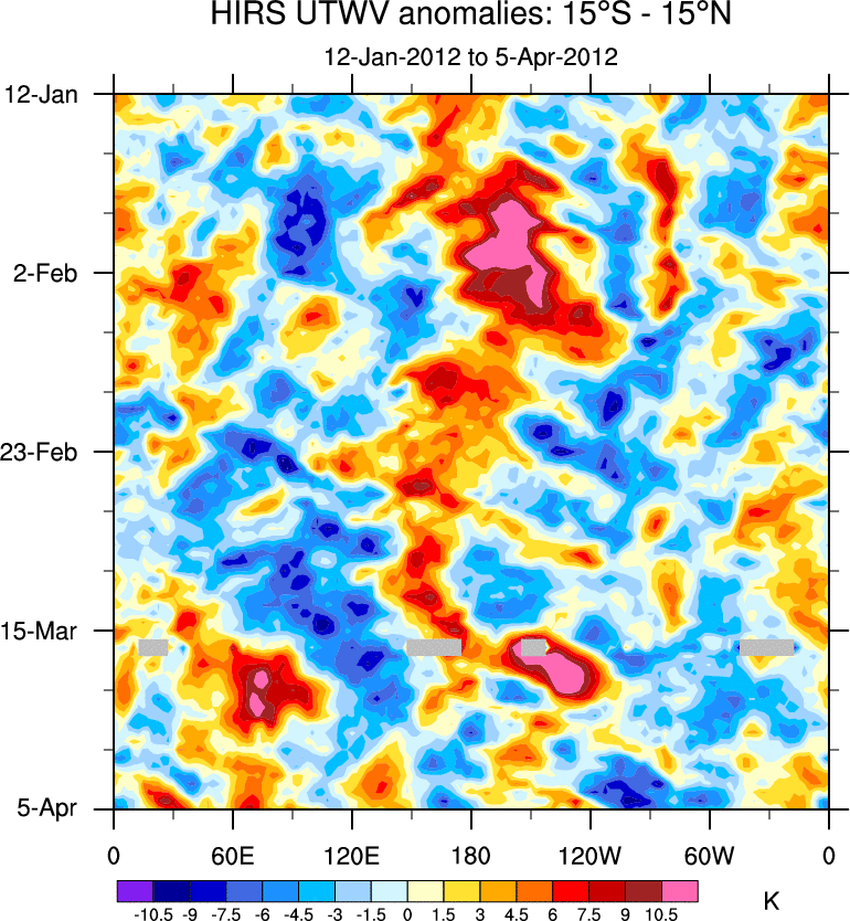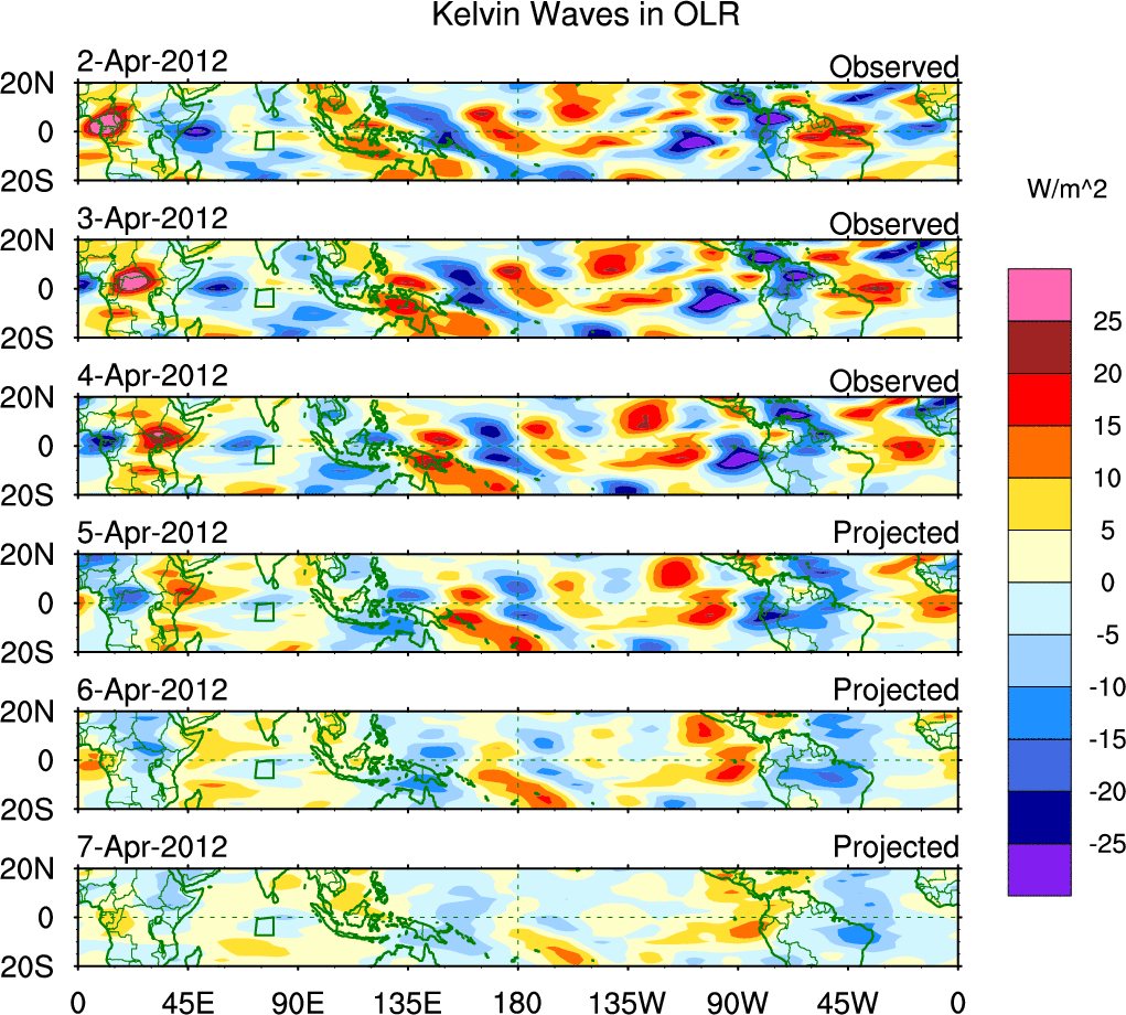 To identify tropical waves in near real-time, the OLR and UTWV data are filtered following Wheeler & Weickmann (2001 MWR). The daily anomalies are calculated using the first 3 harmonics of the seasonal cycle for 1979–2009. Missing values are then filled using linear interpolation in space and time. The most recent 365 days of anomalies are padded with 659 days of zeroes, and the result is filtered for each wave type.