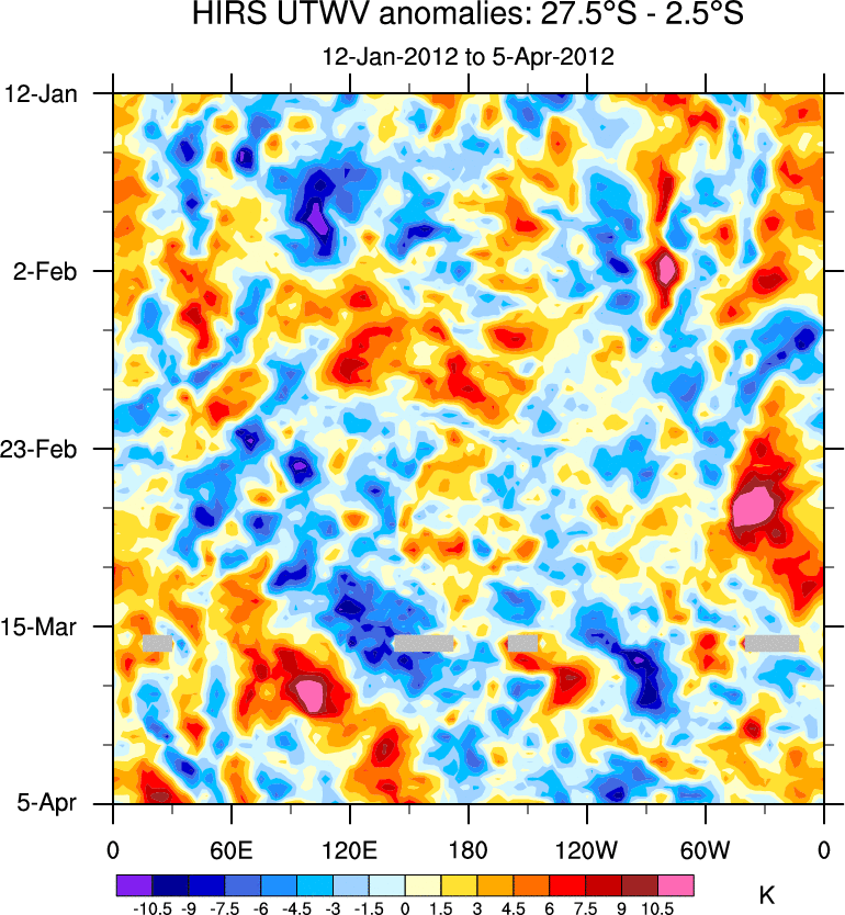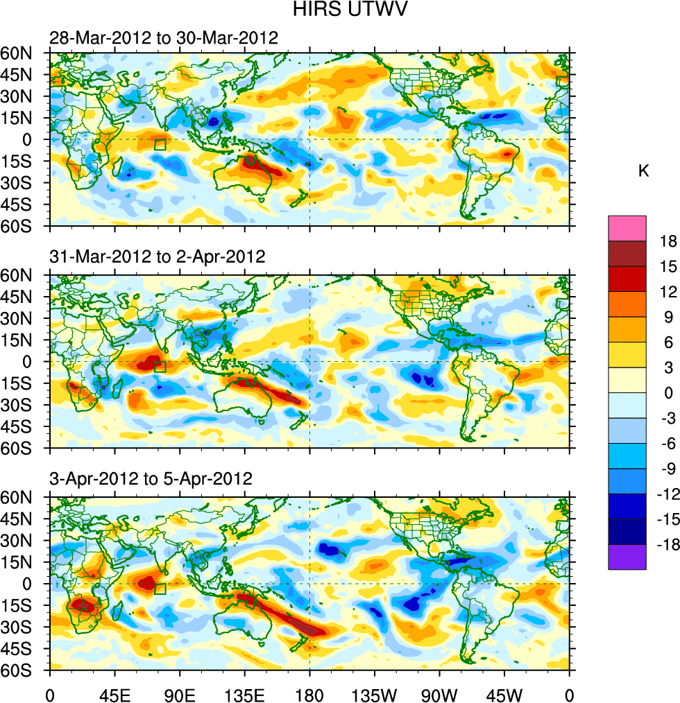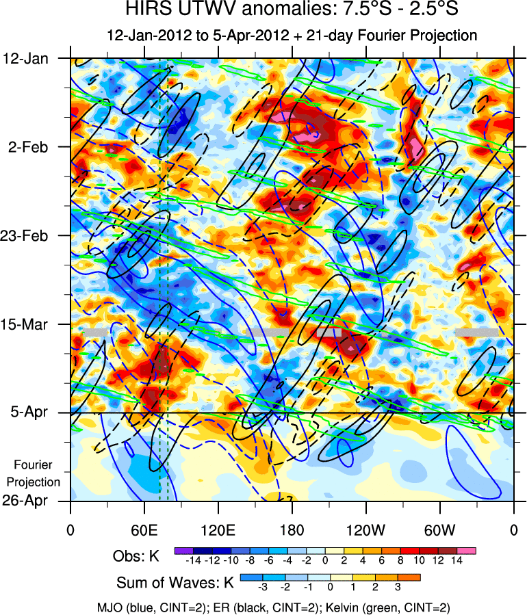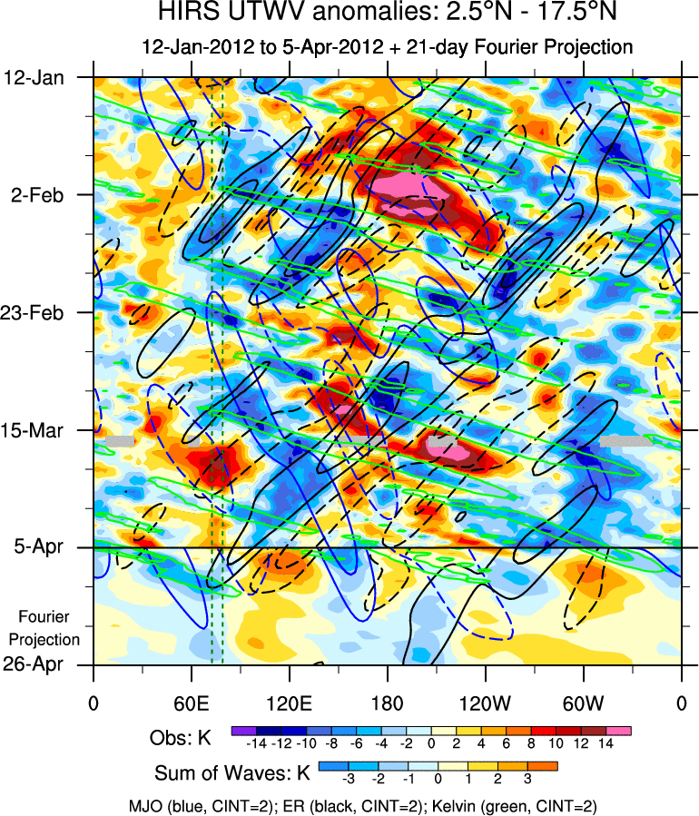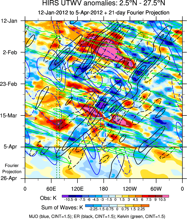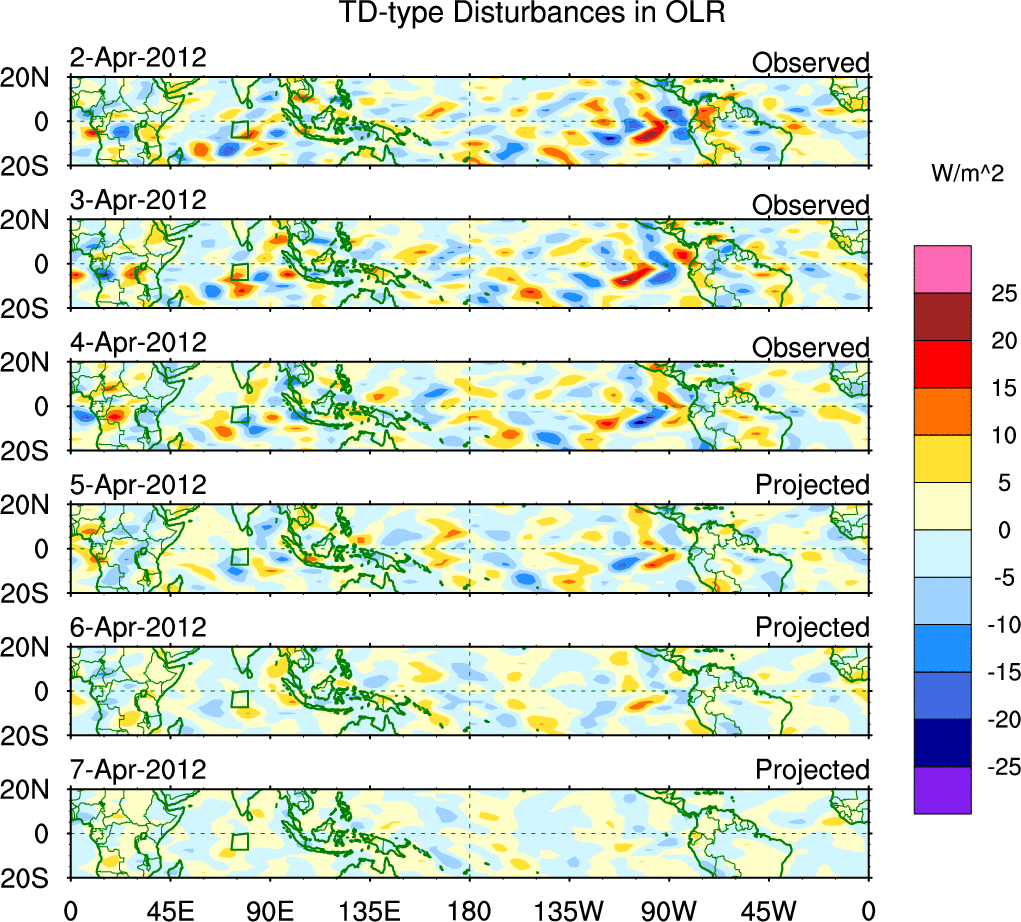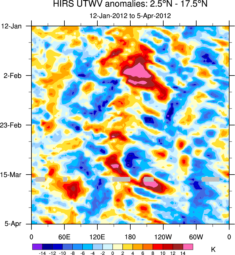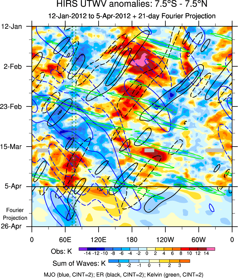 To identify tropical waves in near real-time, the OLR and UTWV data are filtered following Wheeler & Weickmann (2001 MWR). The daily anomalies are calculated using the first 3 harmonics of the seasonal cycle for 1979–2009. Missing values are then filled using linear interpolation in space and time. The most recent 365 days of anomalies are padded with 659 days of zeroes, and the result is filtered for each wave type.