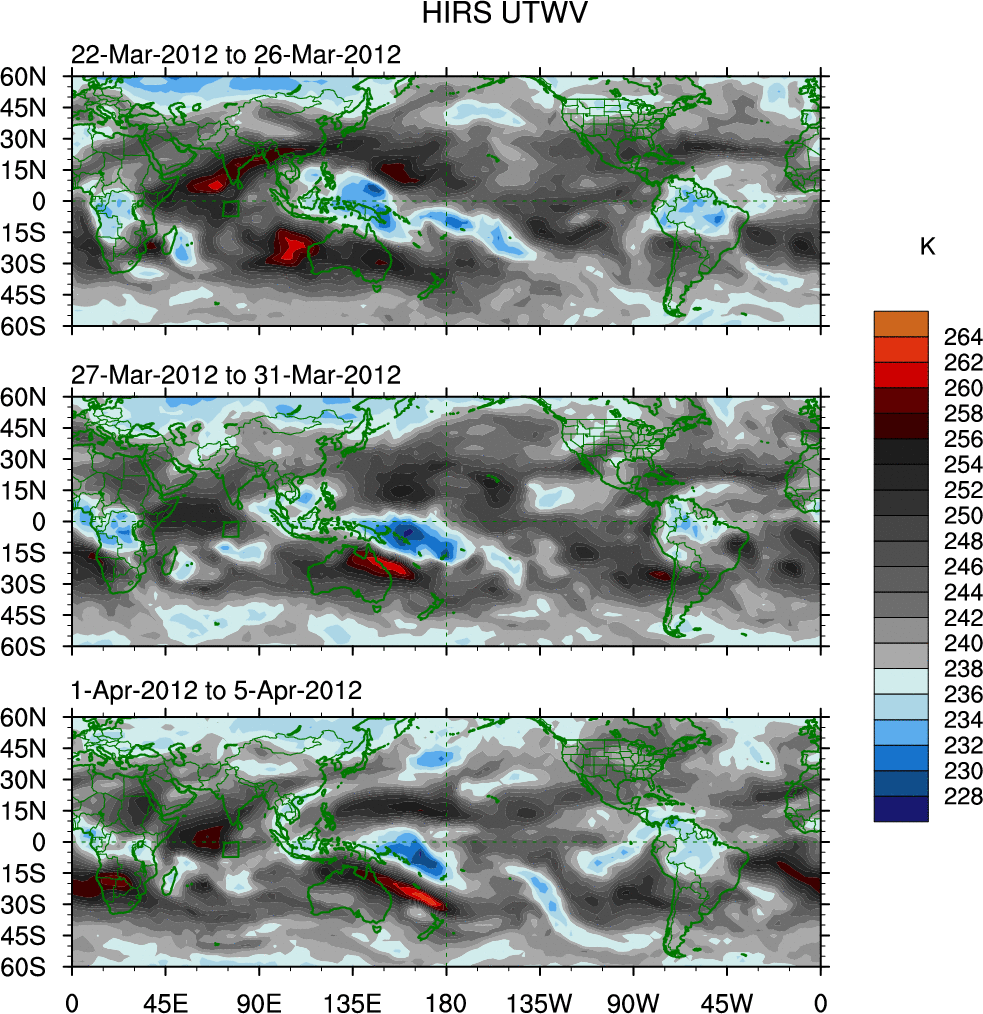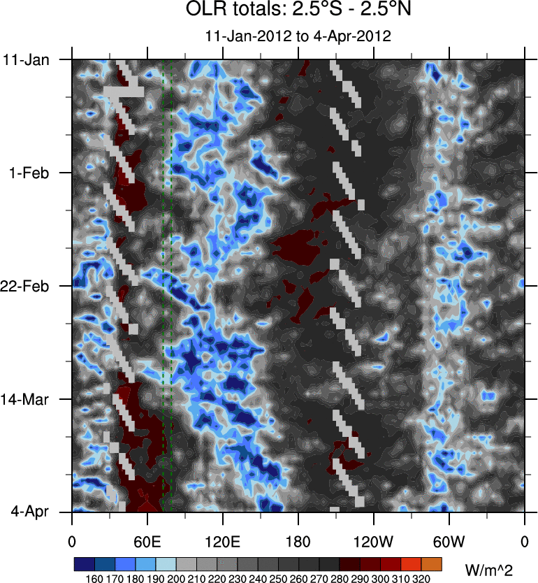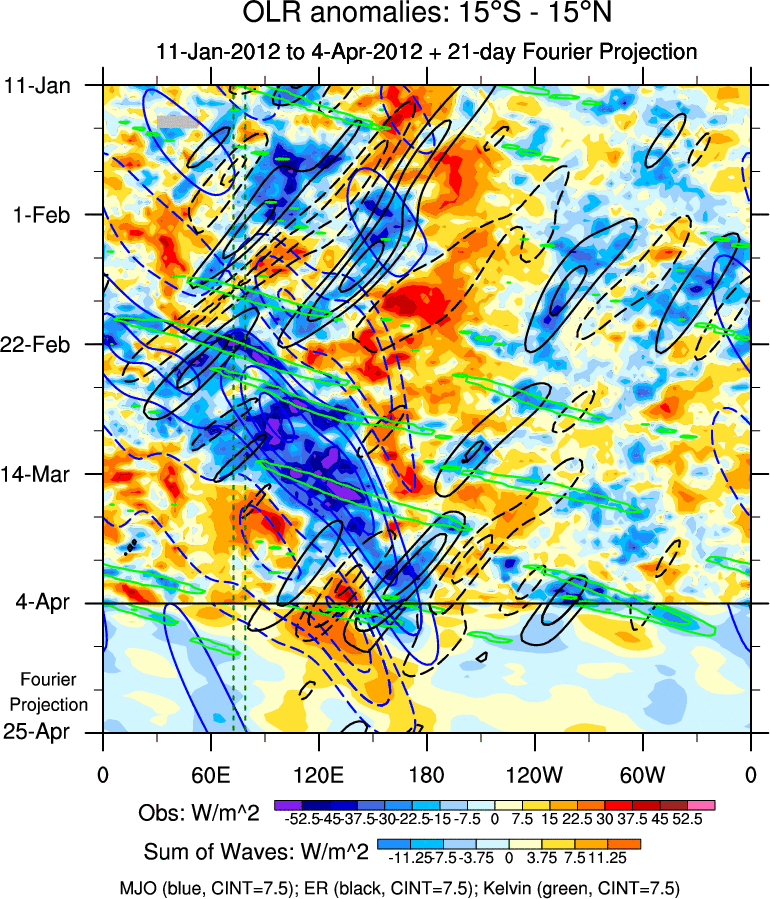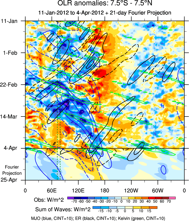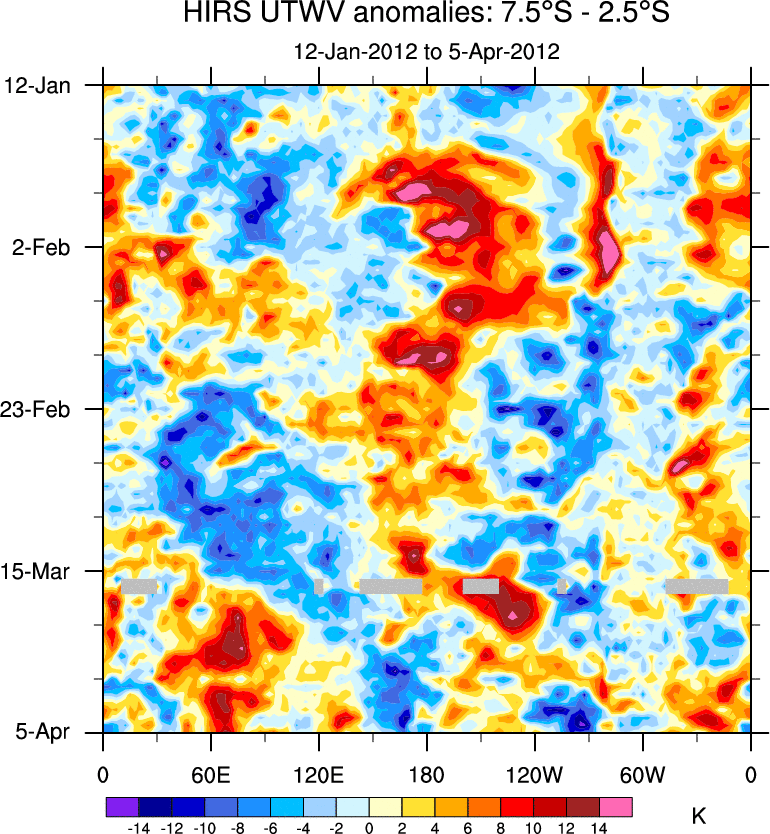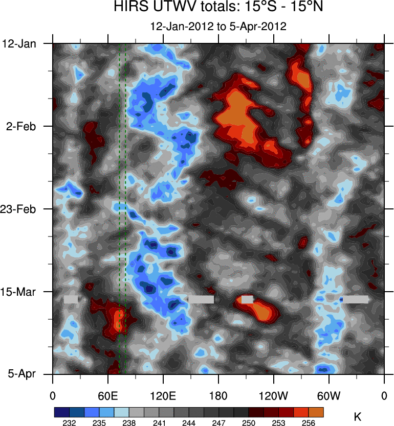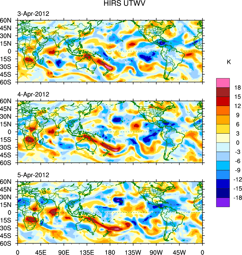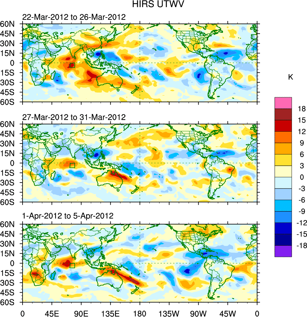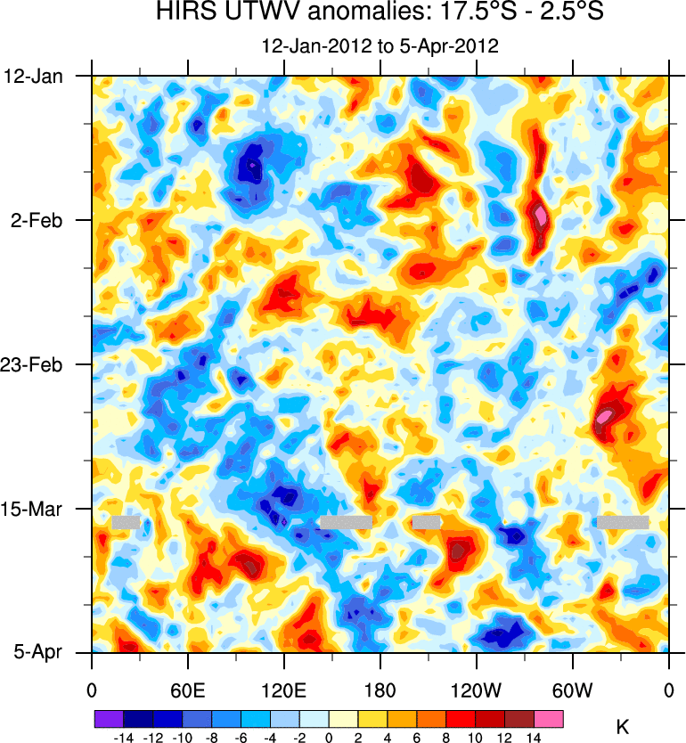 To identify tropical waves in near real-time, the OLR and UTWV data are filtered following Wheeler & Weickmann (2001 MWR). The daily anomalies are calculated using the first 3 harmonics of the seasonal cycle for 1979–2009. Missing values are then filled using linear interpolation in space and time. The most recent 365 days of anomalies are padded with 659 days of zeroes, and the result is filtered for each wave type.