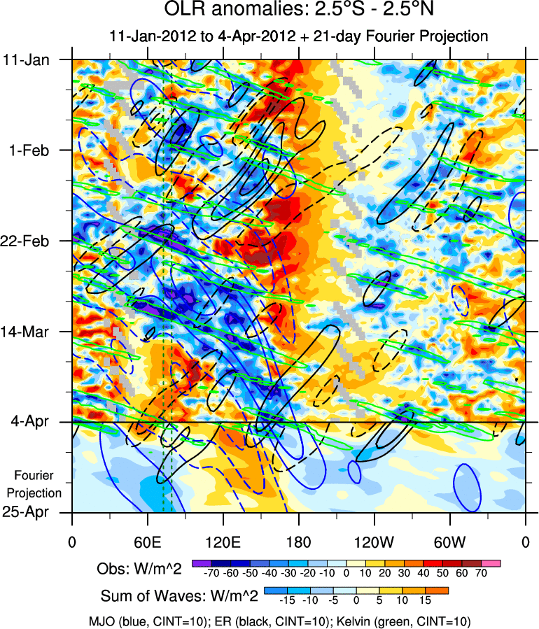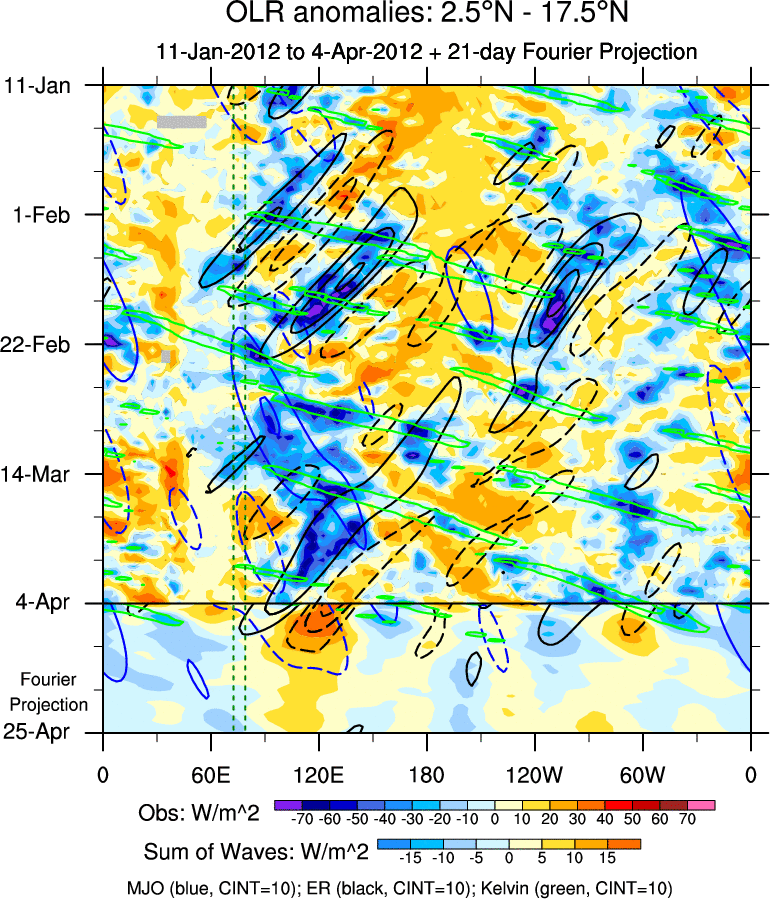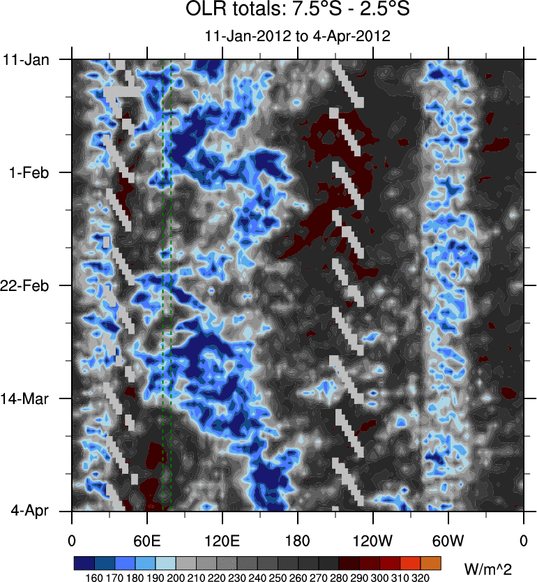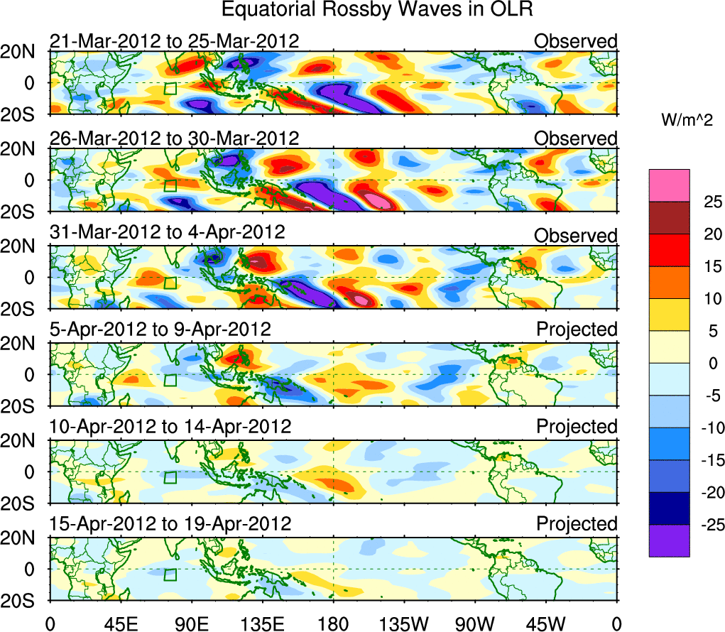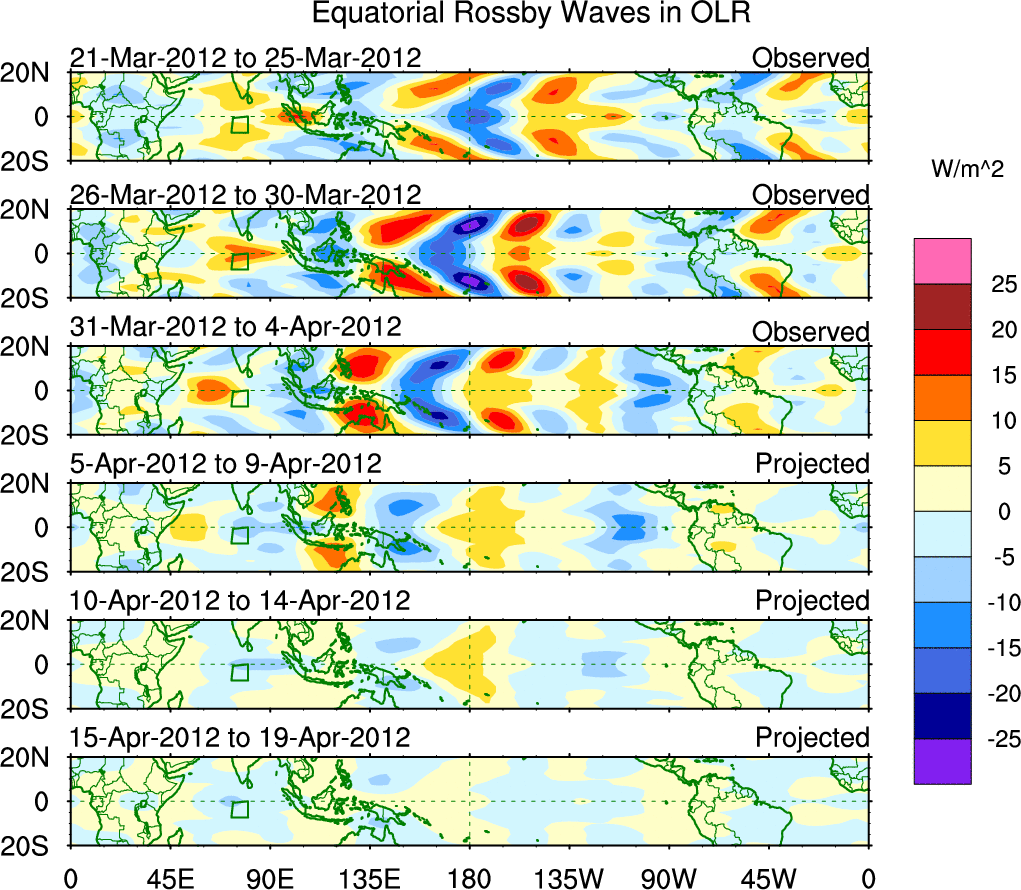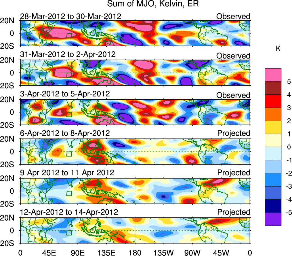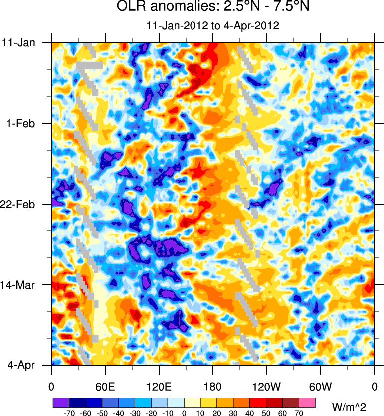 To identify tropical waves in near real-time, the OLR and UTWV data are filtered following Wheeler & Weickmann (2001 MWR). The daily anomalies are calculated using the first 3 harmonics of the seasonal cycle for 1979–2009. Missing values are then filled using linear interpolation in space and time. The most recent 365 days of anomalies are padded with 659 days of zeroes, and the result is filtered for each wave type.