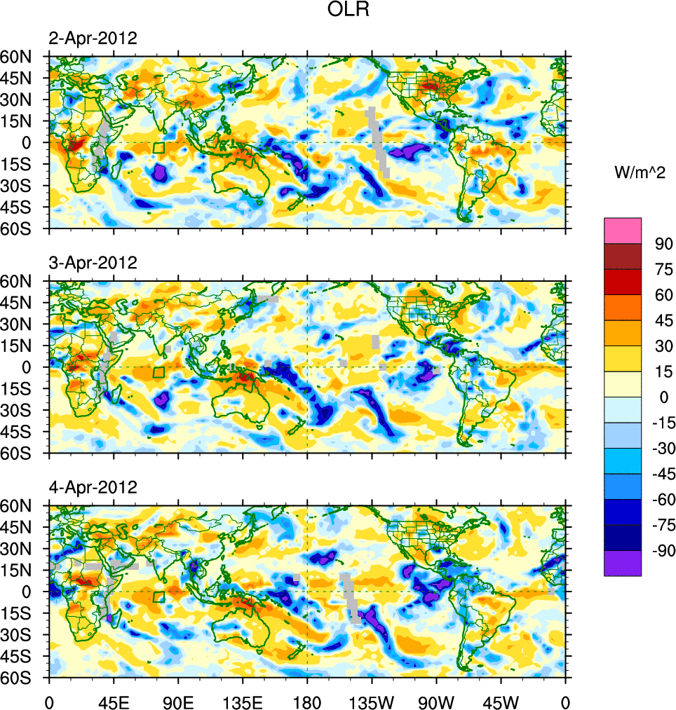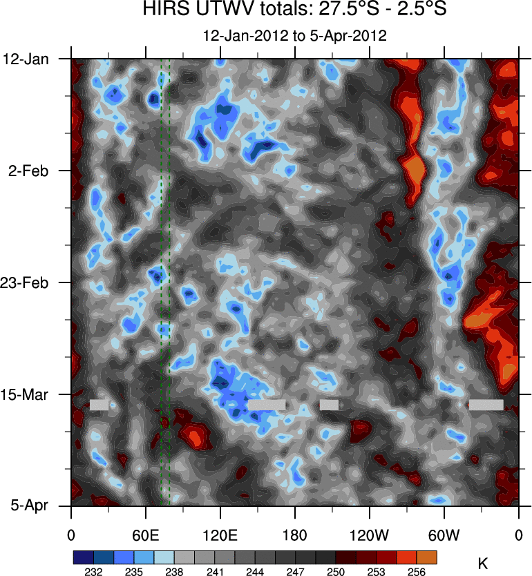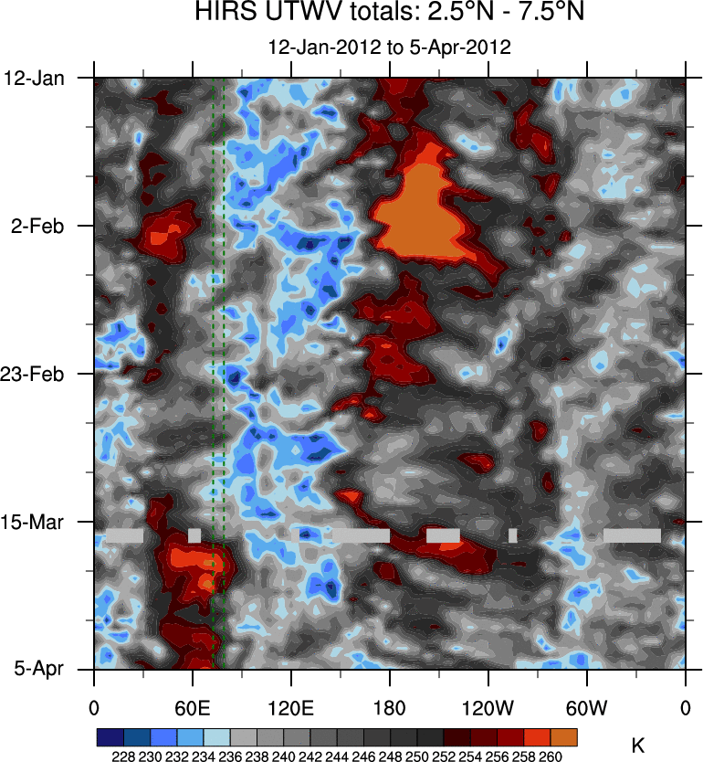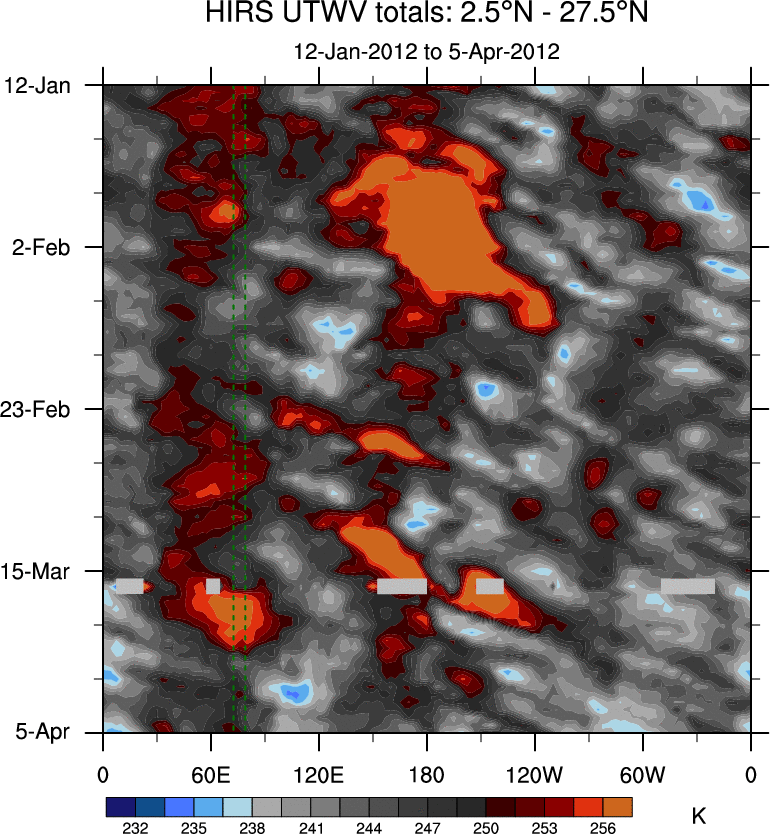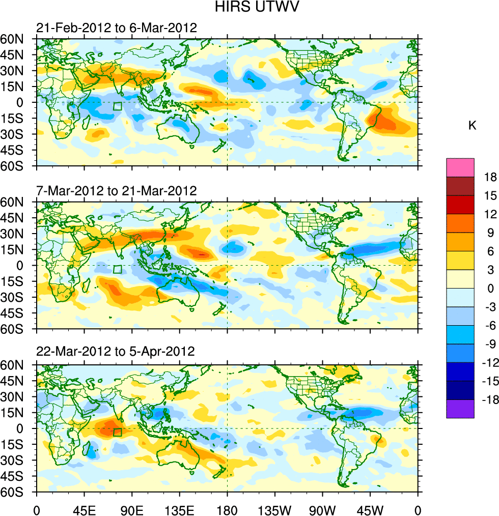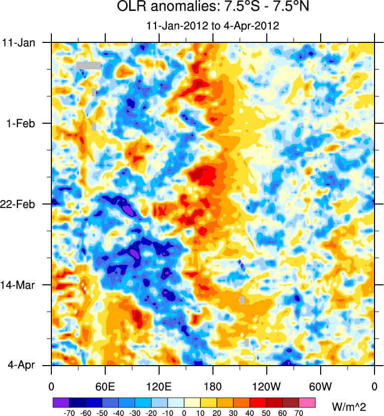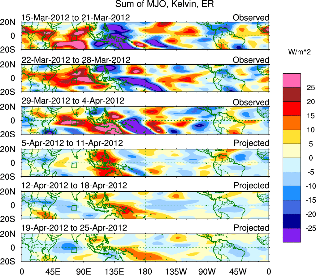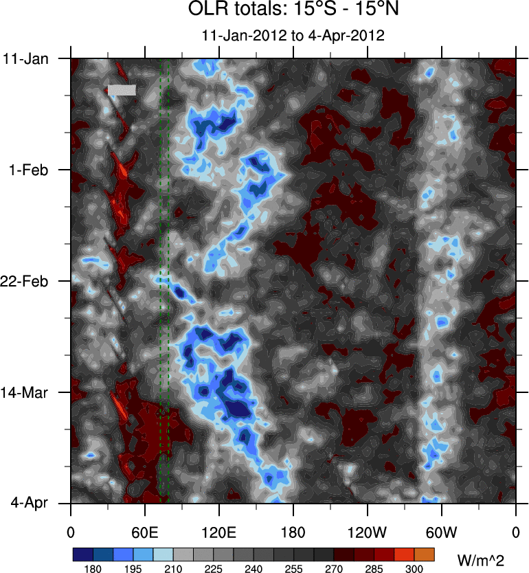 To identify tropical waves in near real-time, the OLR and UTWV data are filtered following Wheeler & Weickmann (2001 MWR). The daily anomalies are calculated using the first 3 harmonics of the seasonal cycle for 1979–2009. Missing values are then filled using linear interpolation in space and time. The most recent 365 days of anomalies are padded with 659 days of zeroes, and the result is filtered for each wave type.