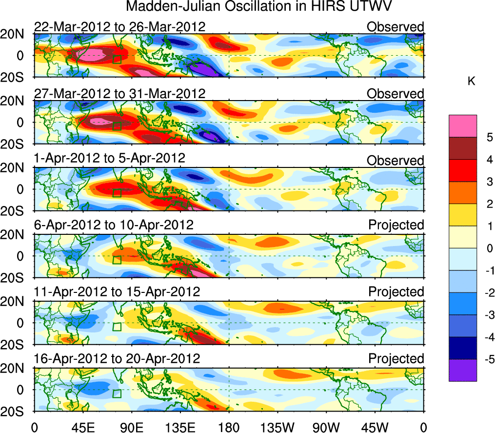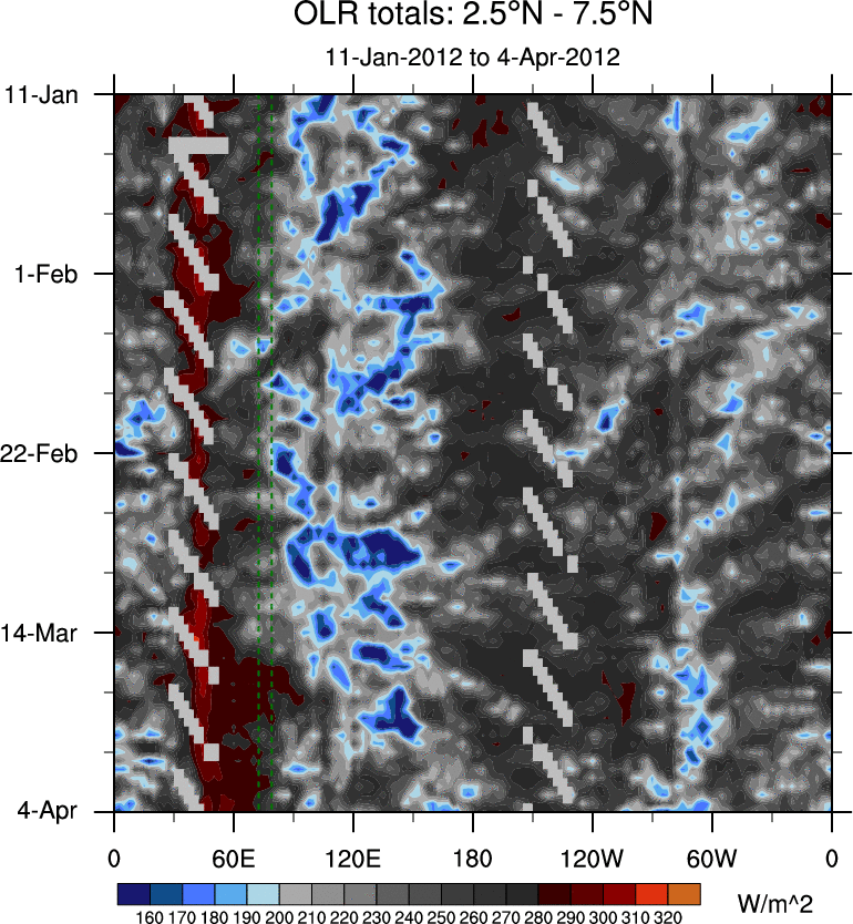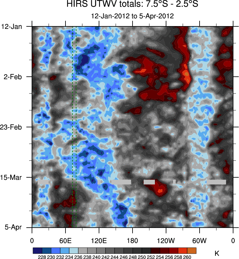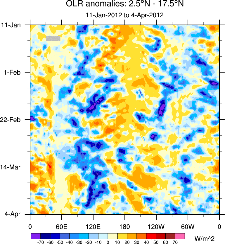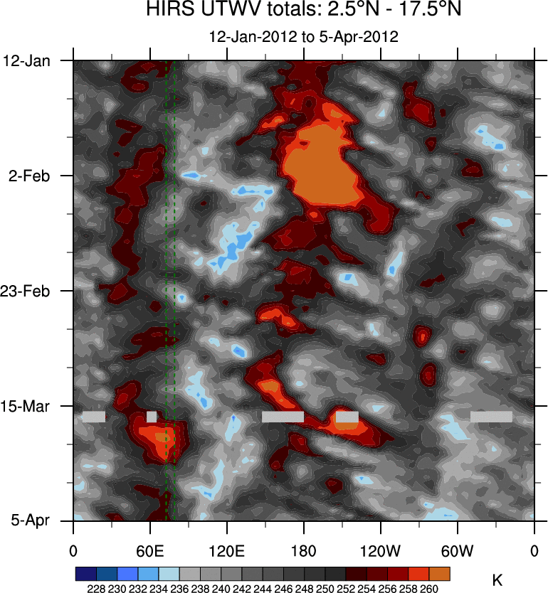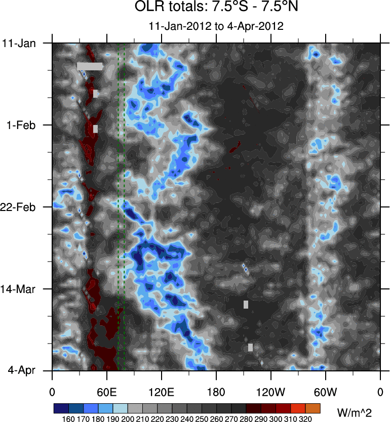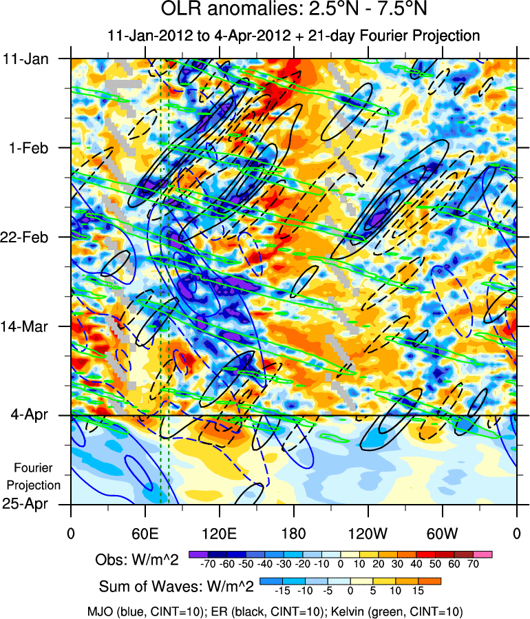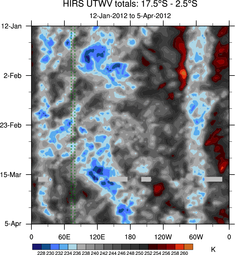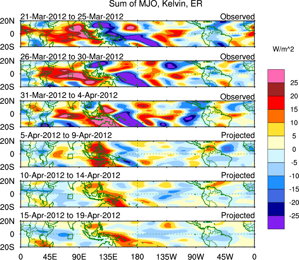 To identify tropical waves in near real-time, the OLR and UTWV data are filtered following Wheeler & Weickmann (2001 MWR). The daily anomalies are calculated using the first 3 harmonics of the seasonal cycle for 1979–2009. Missing values are then filled using linear interpolation in space and time. The most recent 365 days of anomalies are padded with 659 days of zeroes, and the result is filtered for each wave type.