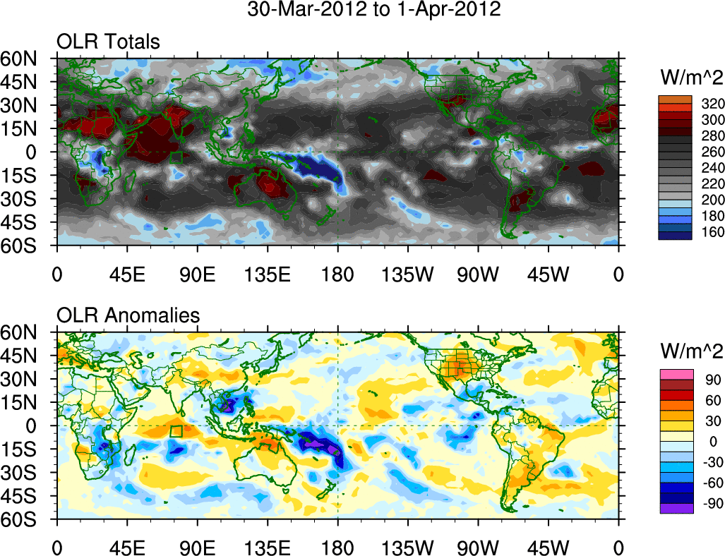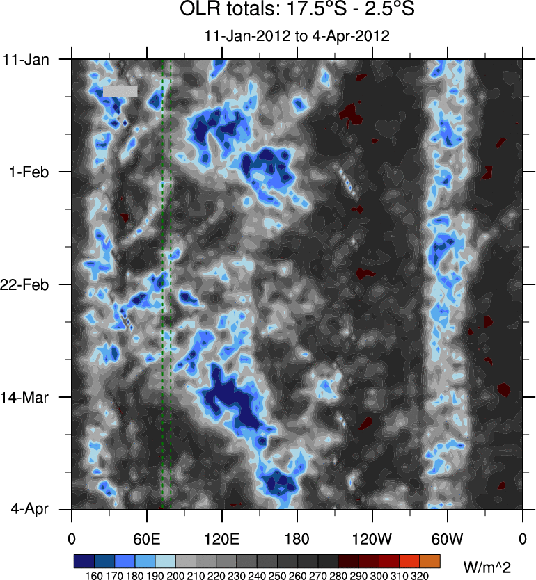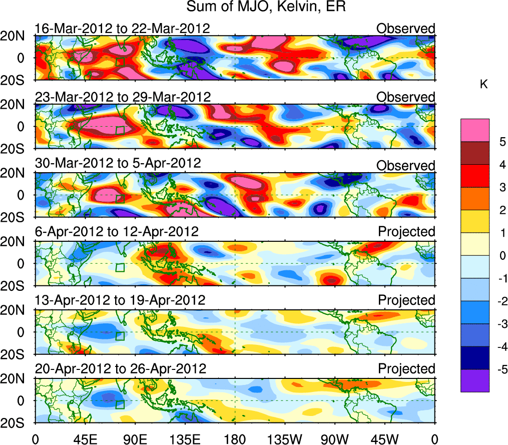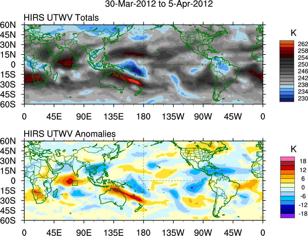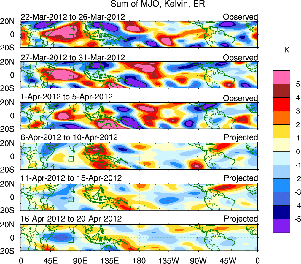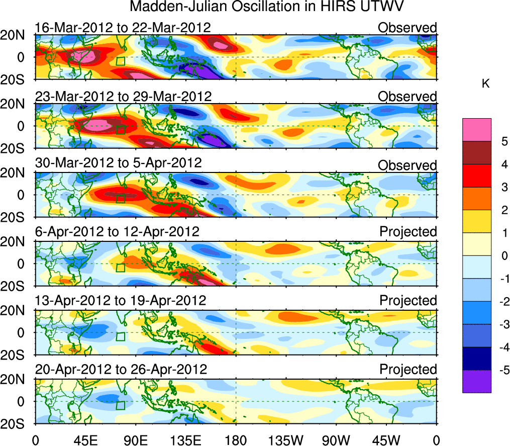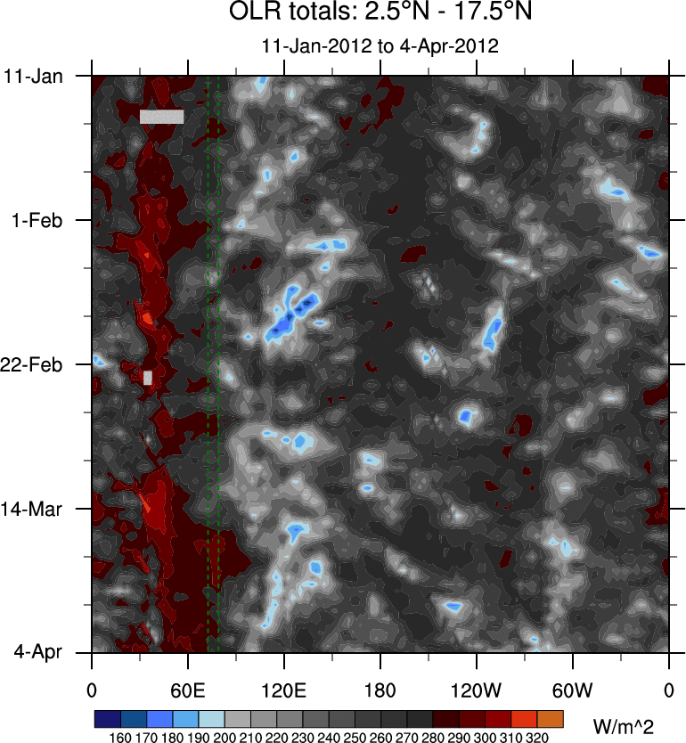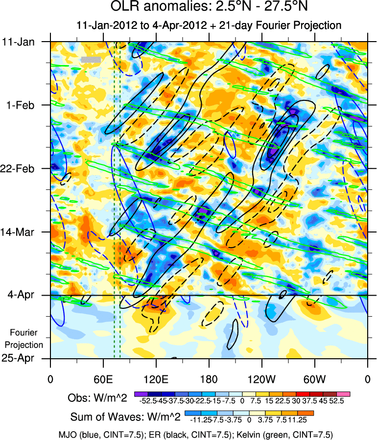 To identify tropical waves in near real-time, the OLR and UTWV data are filtered following Wheeler & Weickmann (2001 MWR). The daily anomalies are calculated using the first 3 harmonics of the seasonal cycle for 1979–2009. Missing values are then filled using linear interpolation in space and time. The most recent 365 days of anomalies are padded with 659 days of zeroes, and the result is filtered for each wave type.