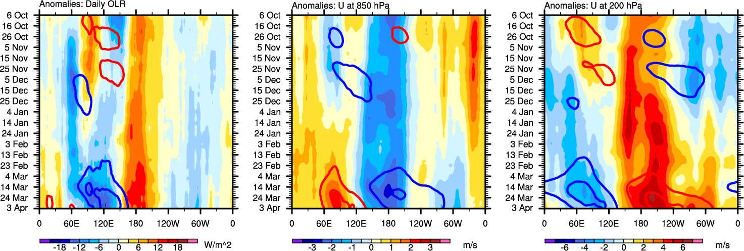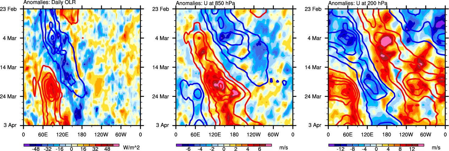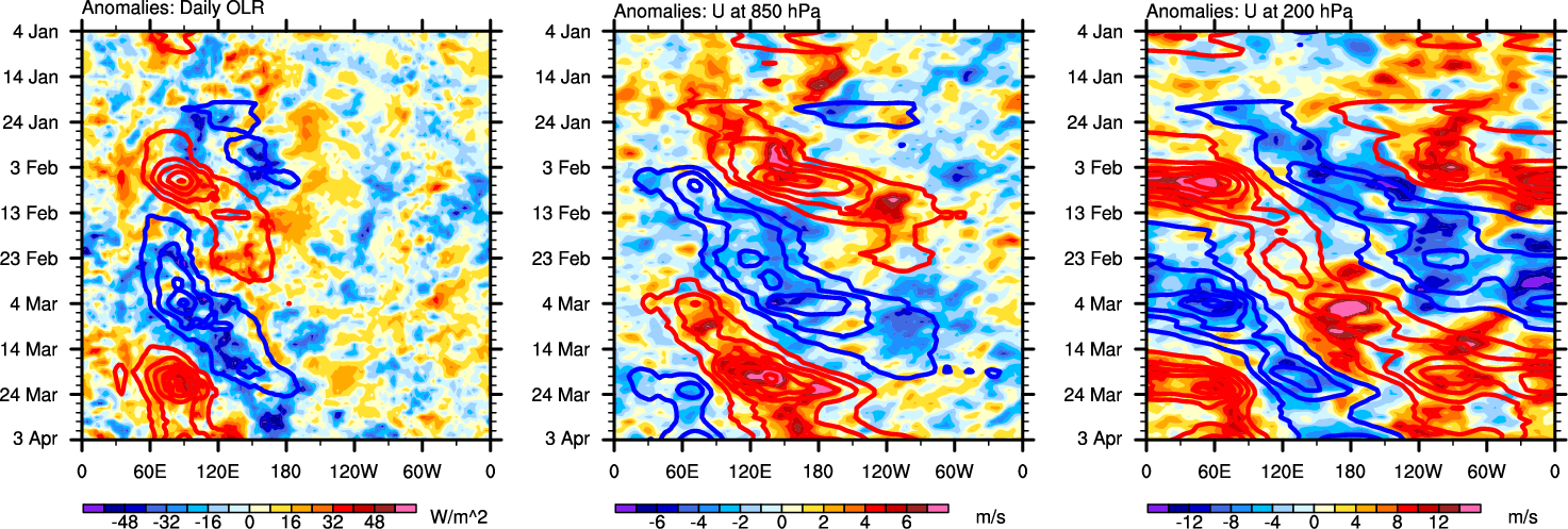 The Hovmollers show longitude-time plots for OLR, U-850, and U-200. The shading indicates the observed anomalies, while the contours are the projection of those anomalies onto the RMM EOFs.