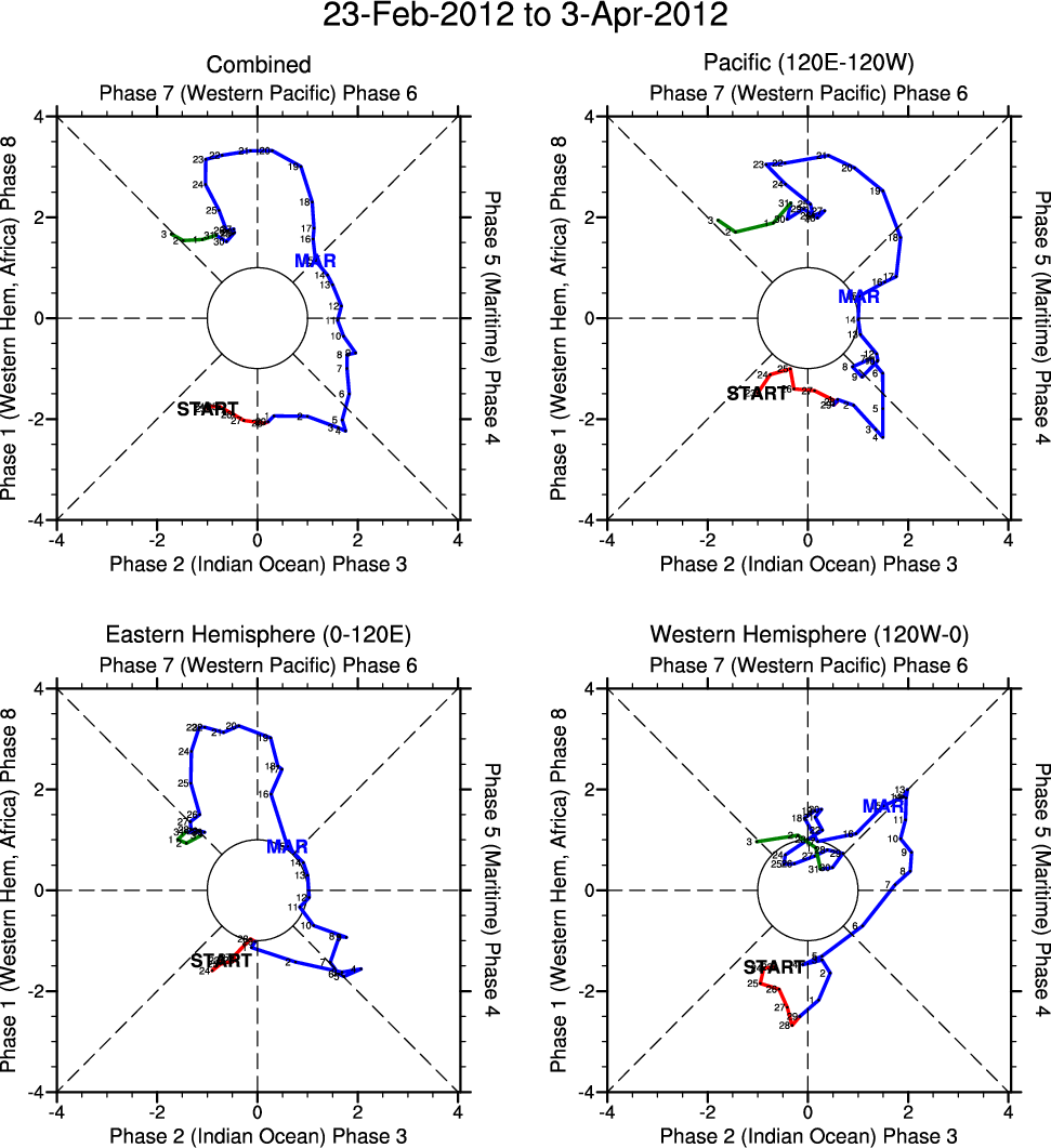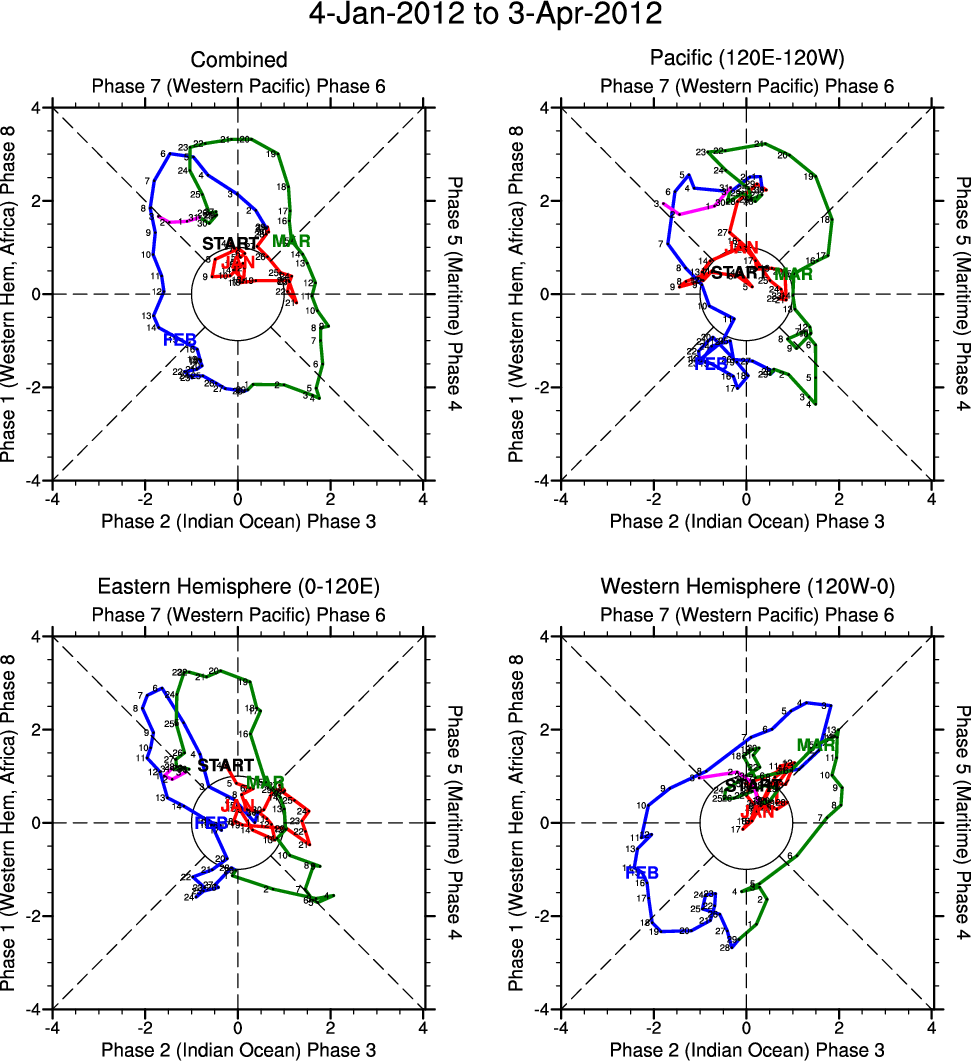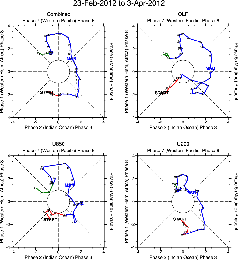 Wheeler and Hendon (2004) constructed the RMM index for monitoring the MJO. This index consists of the first two principal components (PCs) of OLR, 850-hPa zonal wind, and 200-hPa zonal wind averaged 15S-15N.