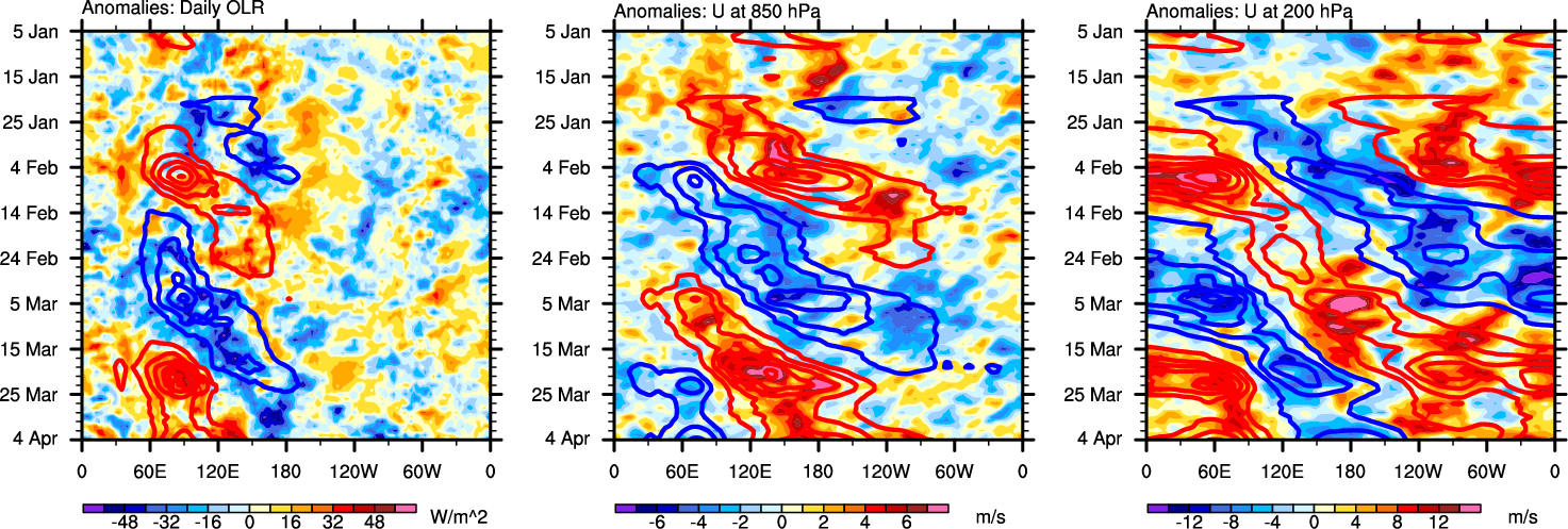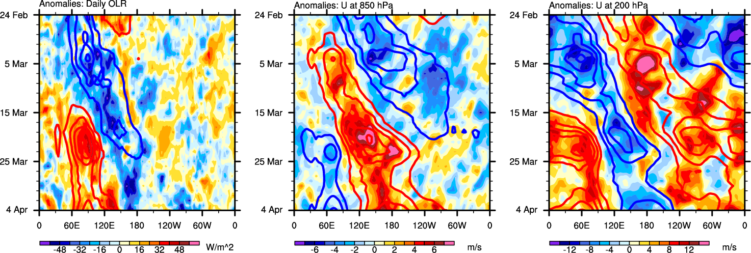 The Hovmollers show longitude-time plots for OLR, U-850, and U-200. The shading indicates the observed anomalies, while the contours are the projection of those anomalies onto the RMM EOFs.