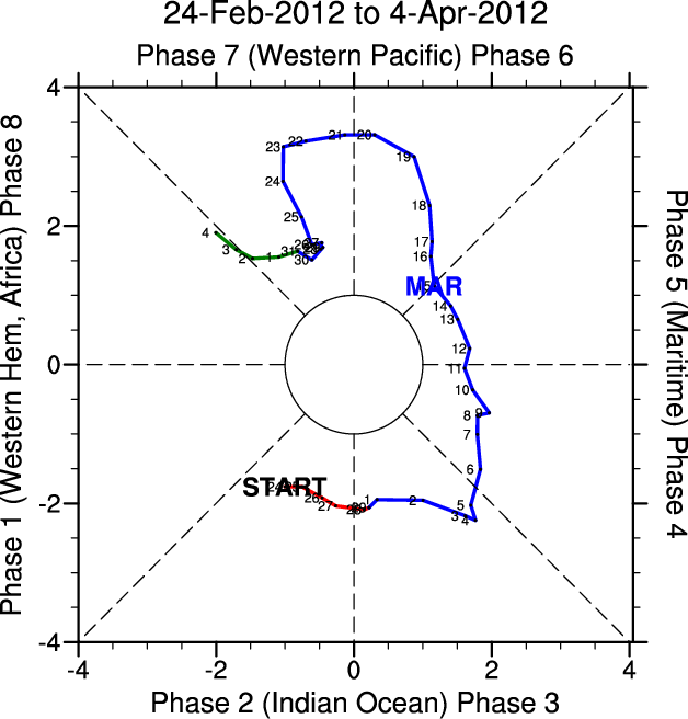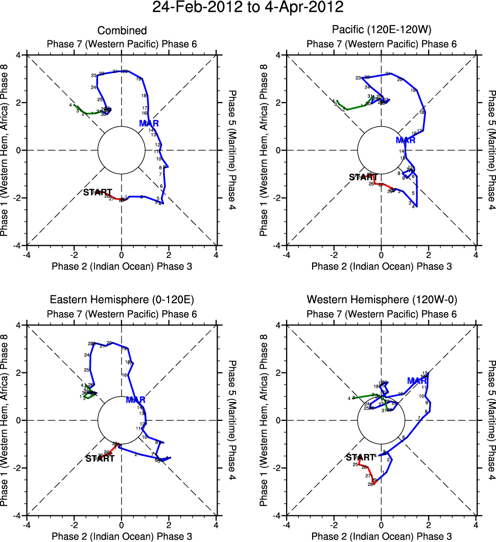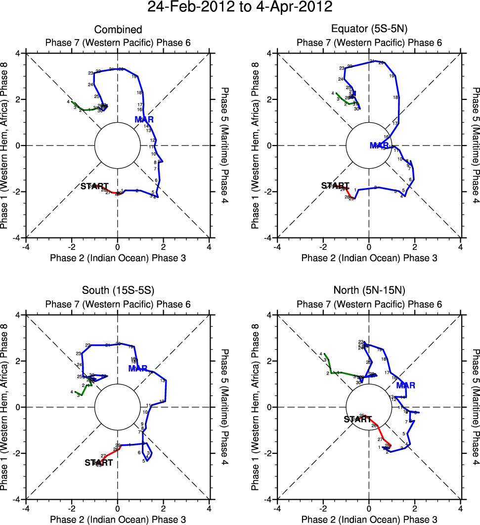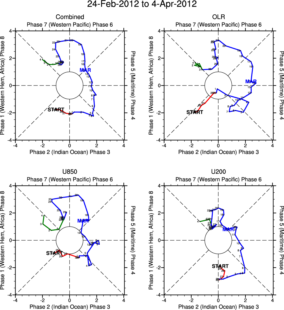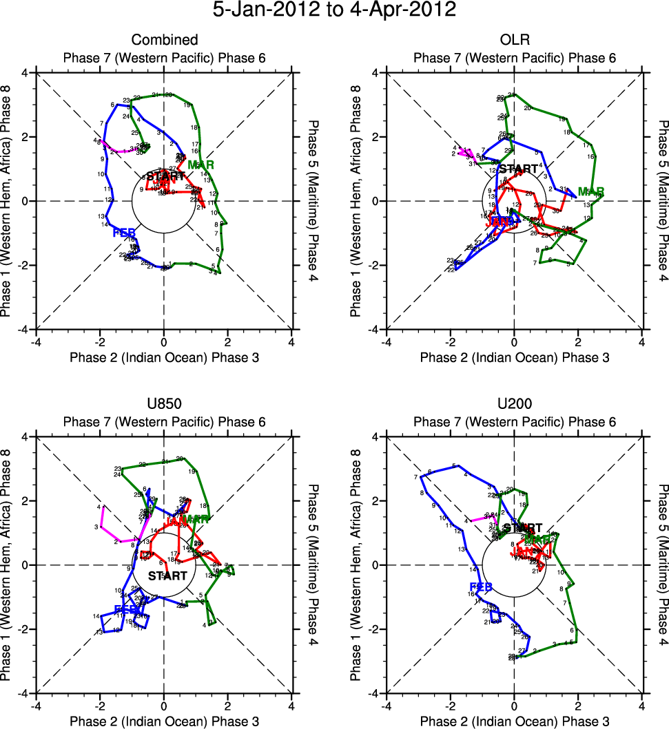 Wheeler and Hendon (2004) constructed the RMM index for monitoring the MJO. This index consists of the first two principal components (PCs) of OLR, 850-hPa zonal wind, and 200-hPa zonal wind averaged 15S-15N.