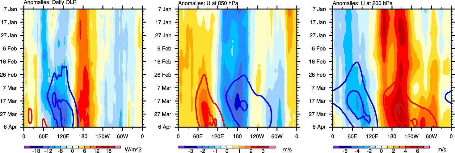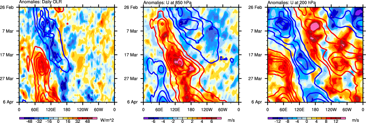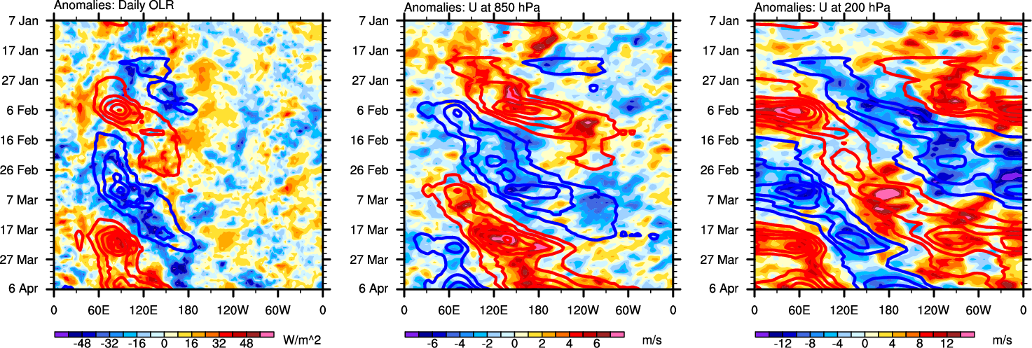 The Hovmollers show longitude-time plots for OLR, U-850, and U-200. The shading indicates the observed anomalies, while the contours are the projection of those anomalies onto the RMM EOFs.