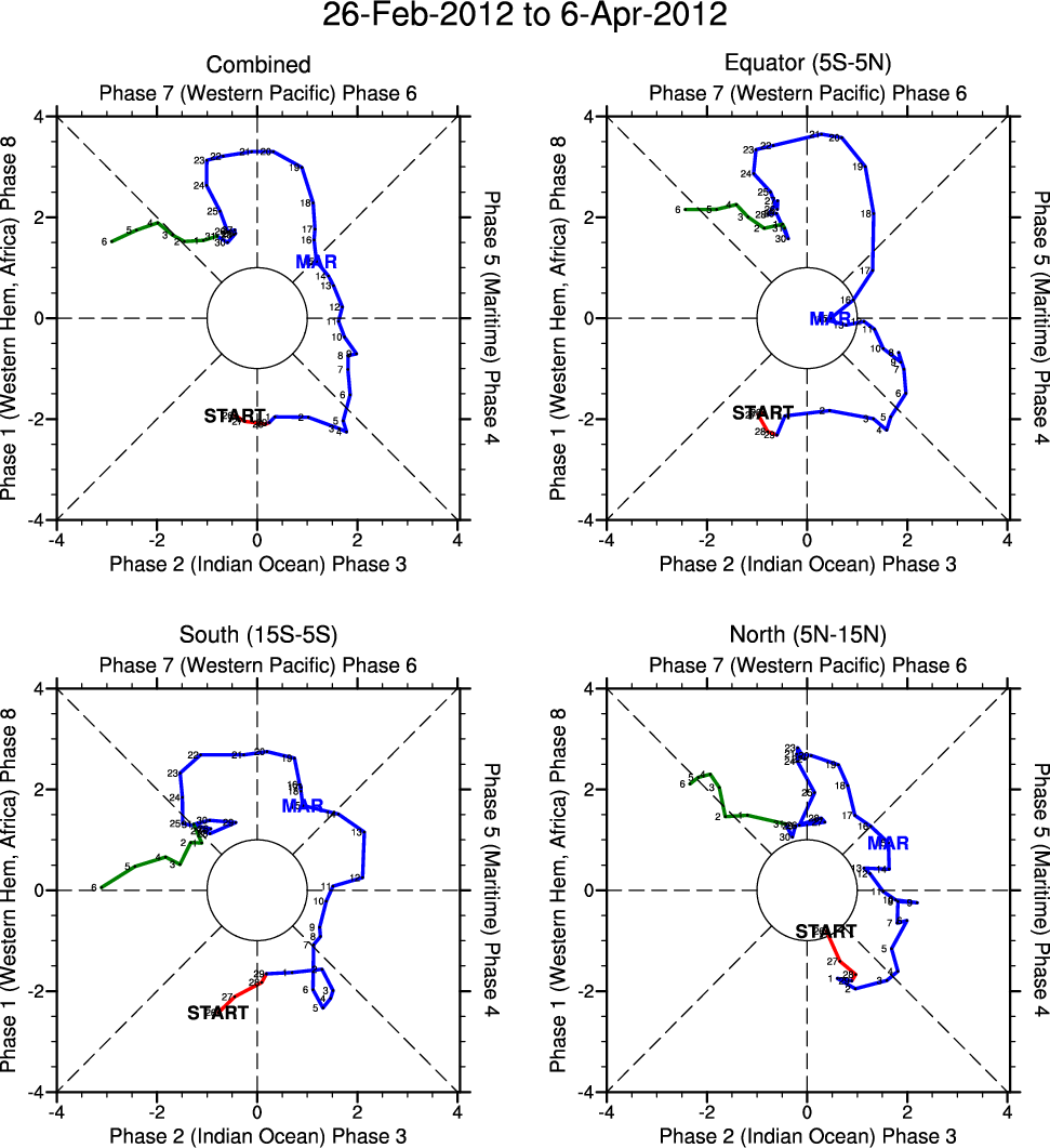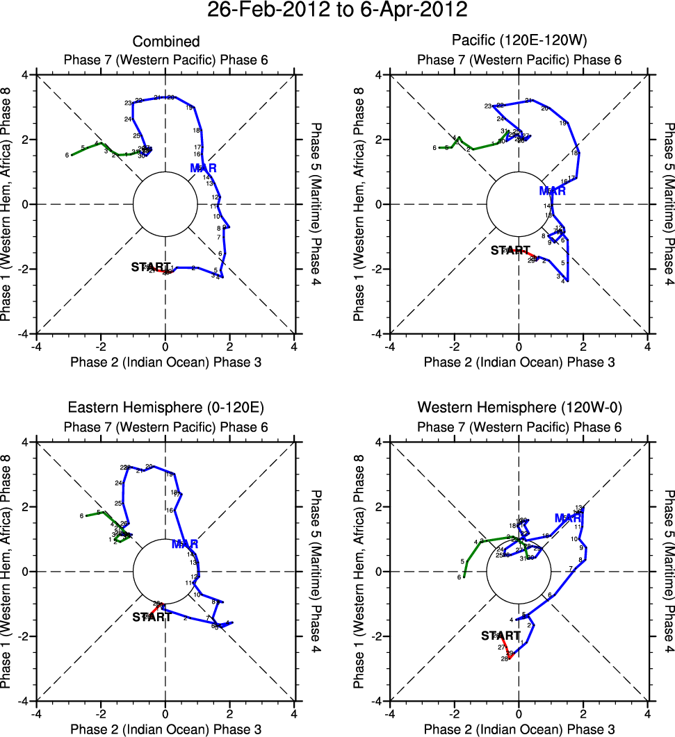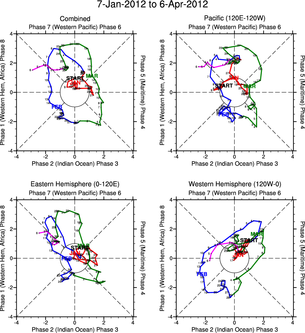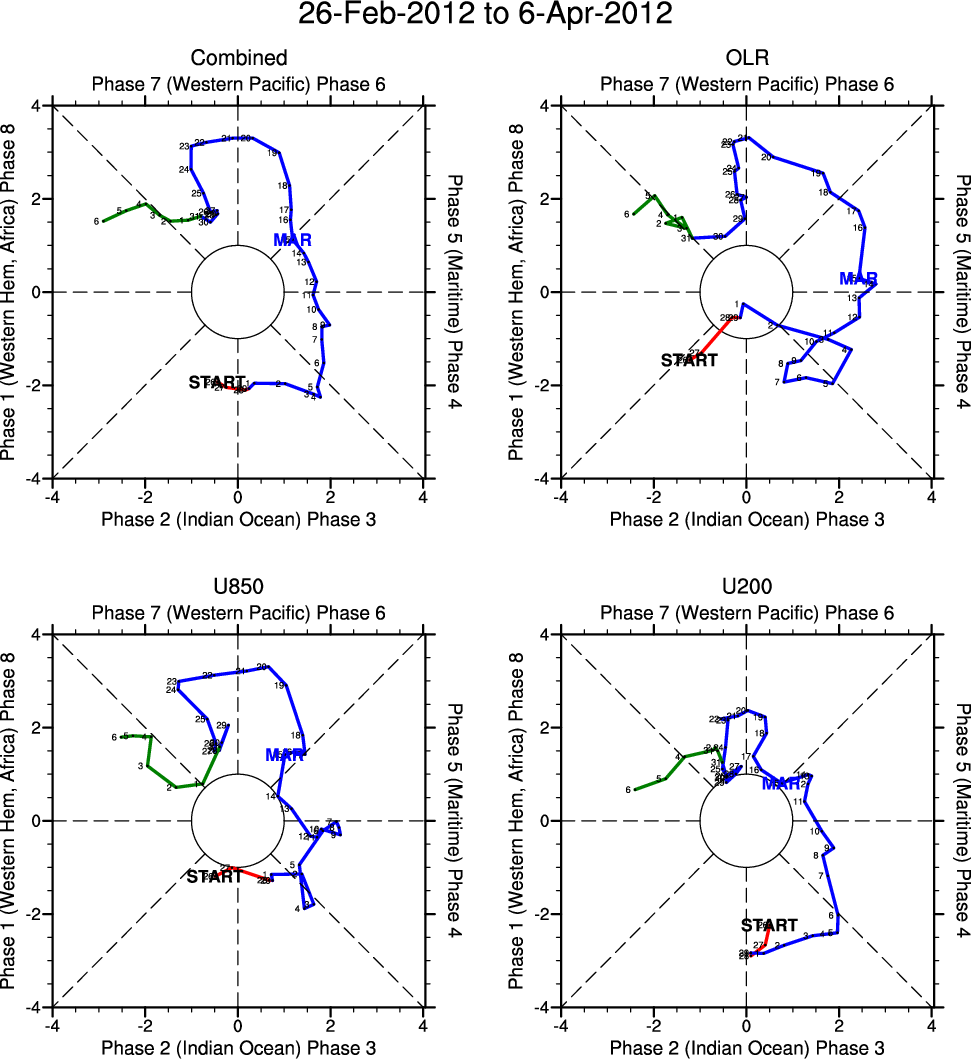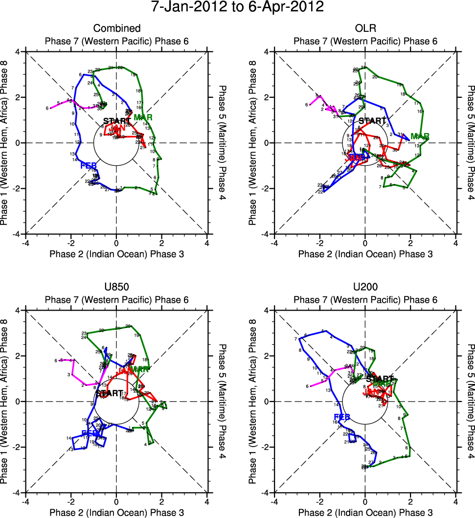 Wheeler and Hendon (2004) constructed the RMM index for monitoring the MJO. This index consists of the first two principal components (PCs) of OLR, 850-hPa zonal wind, and 200-hPa zonal wind averaged 15S-15N.