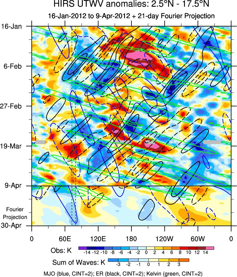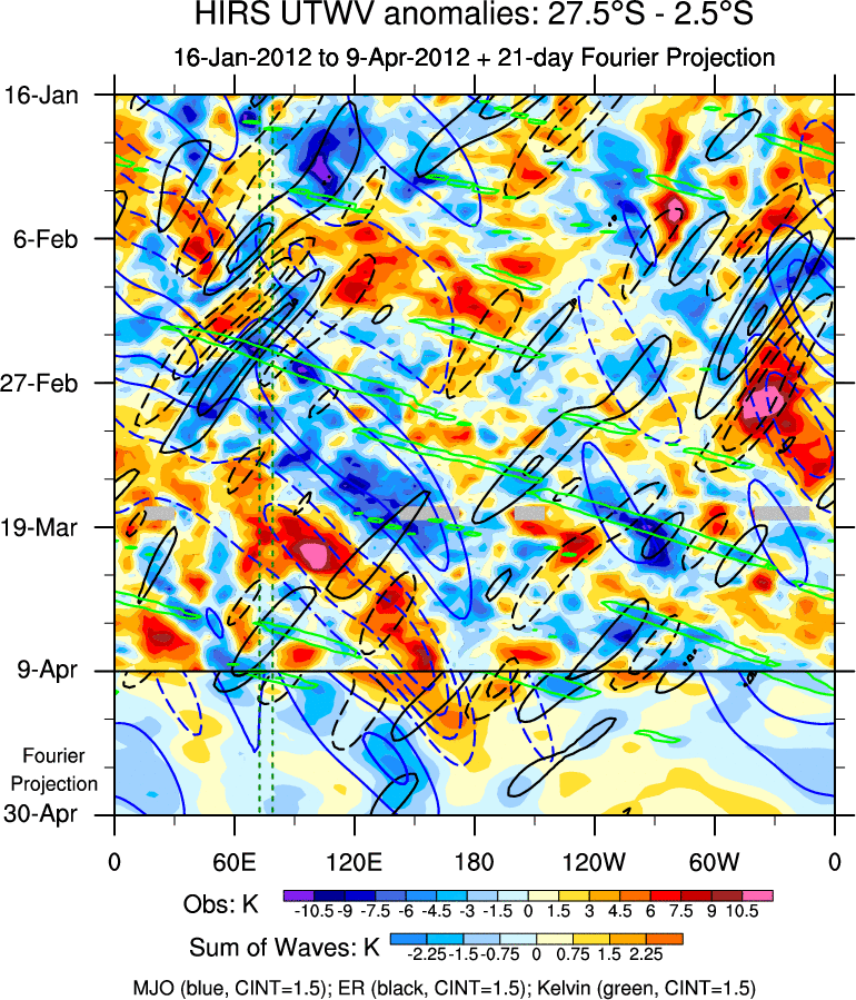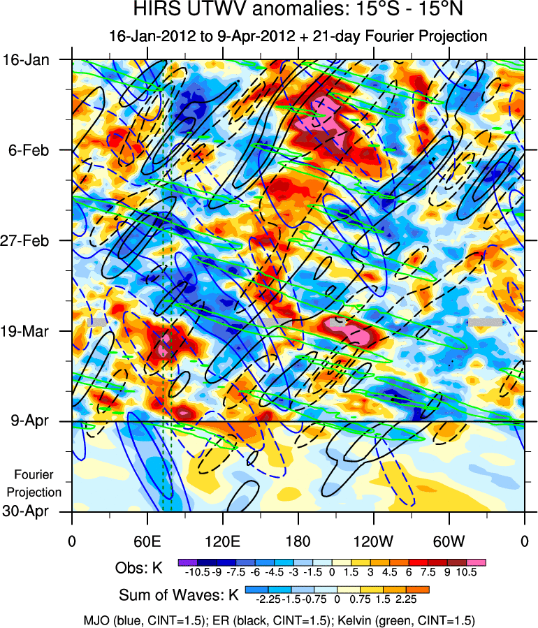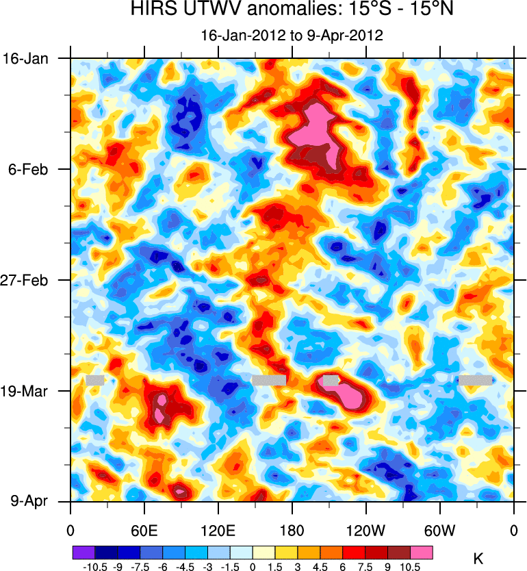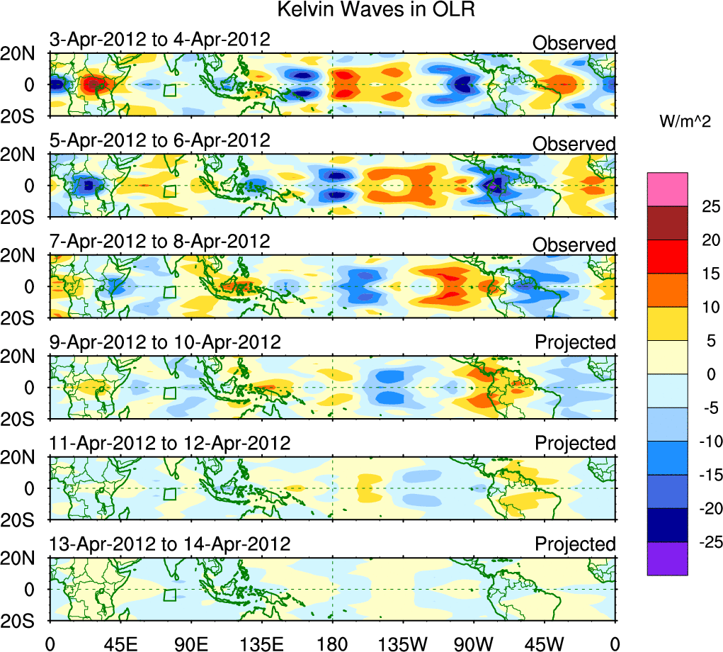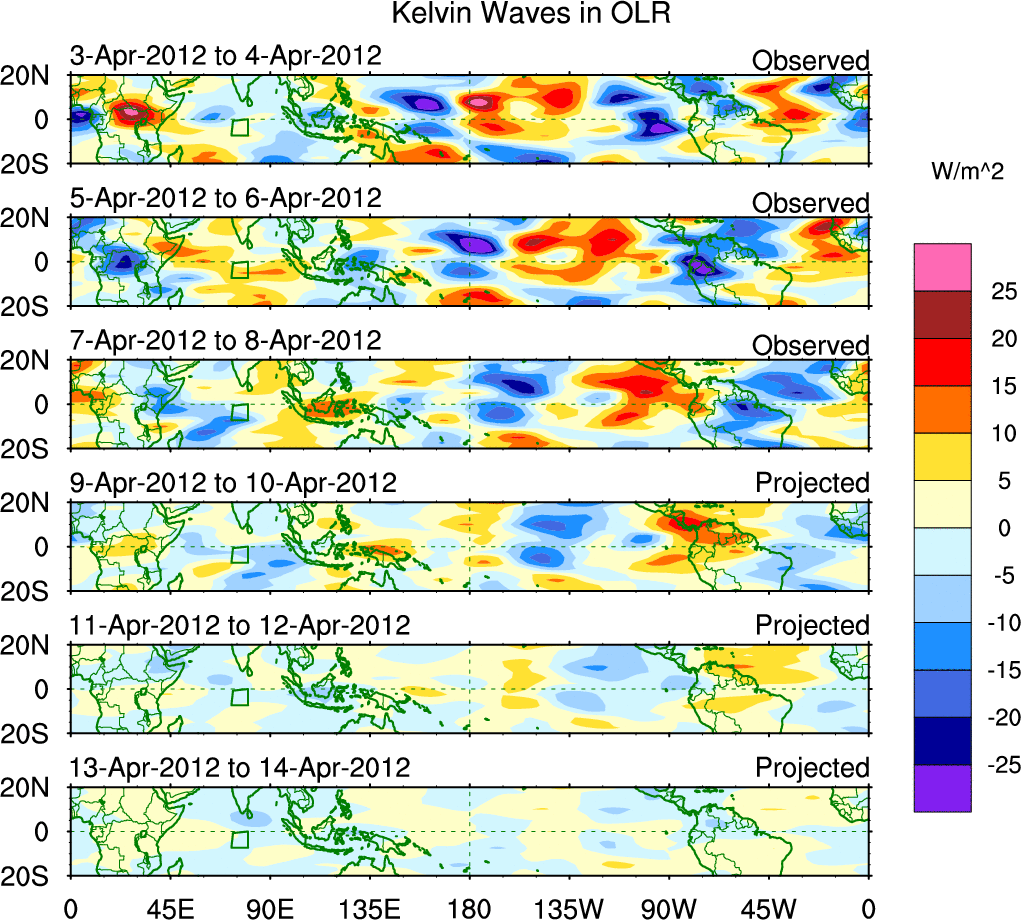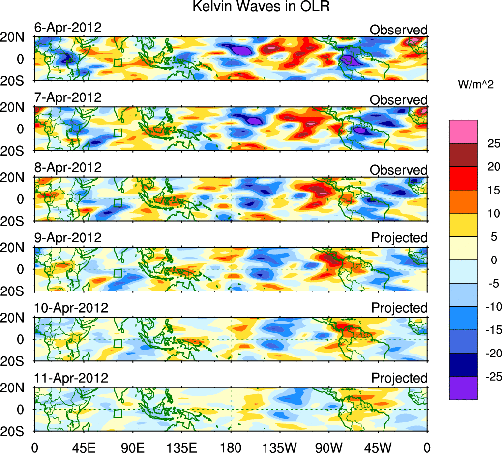 To identify tropical waves in near real-time, the OLR and UTWV data are filtered following Wheeler & Weickmann (2001 MWR). The daily anomalies are calculated using the first 3 harmonics of the seasonal cycle for 1979–2009. Missing values are then filled using linear interpolation in space and time. The most recent 365 days of anomalies are padded with 659 days of zeroes, and the result is filtered for each wave type.