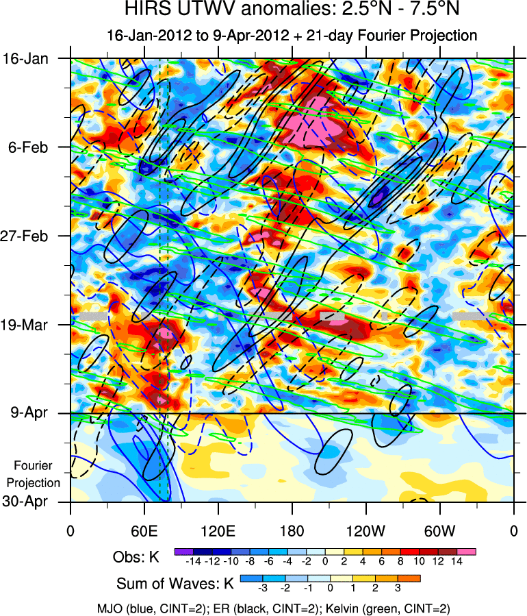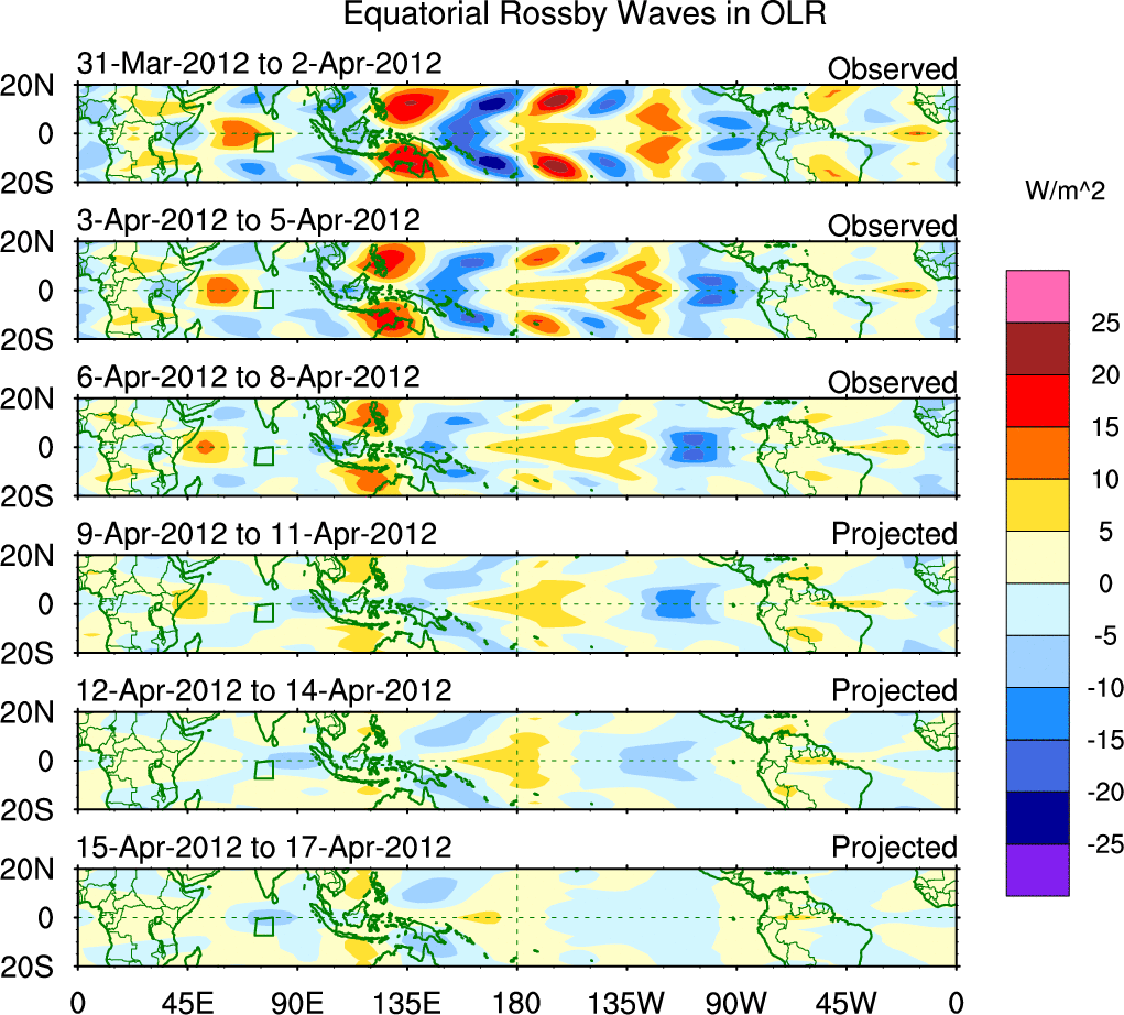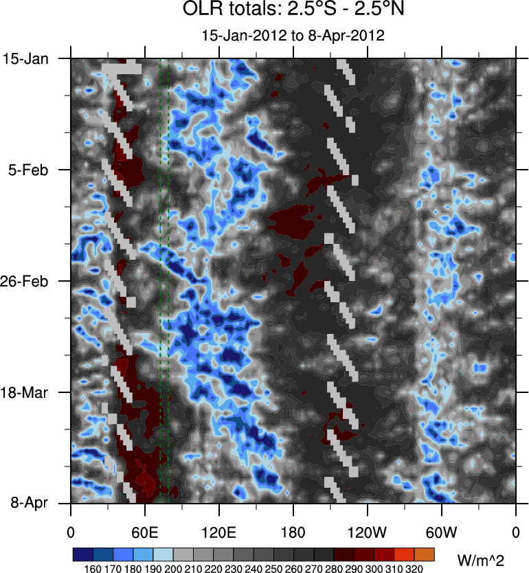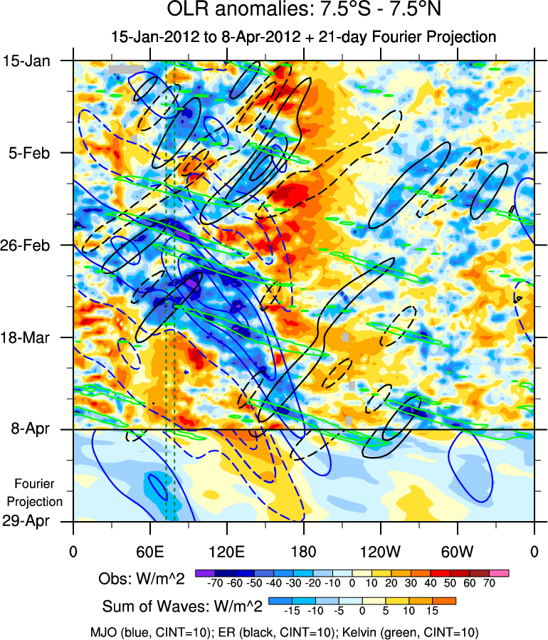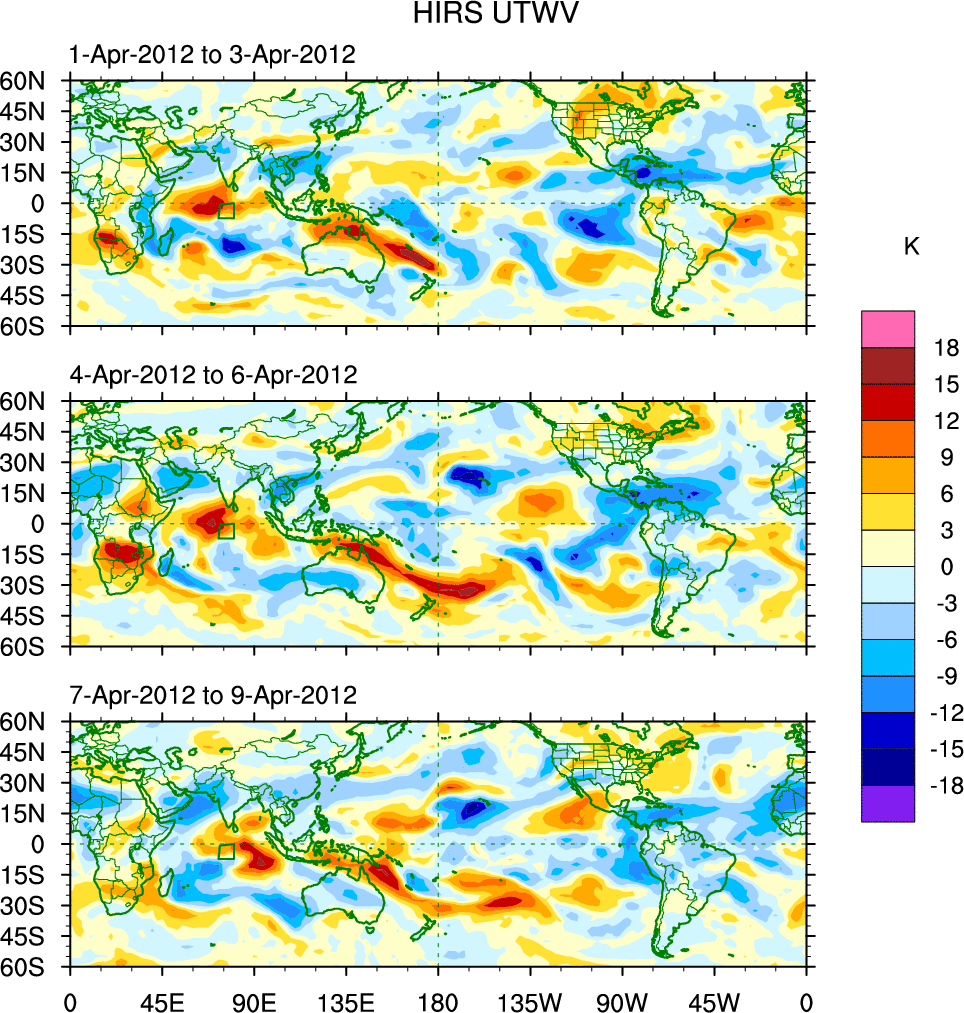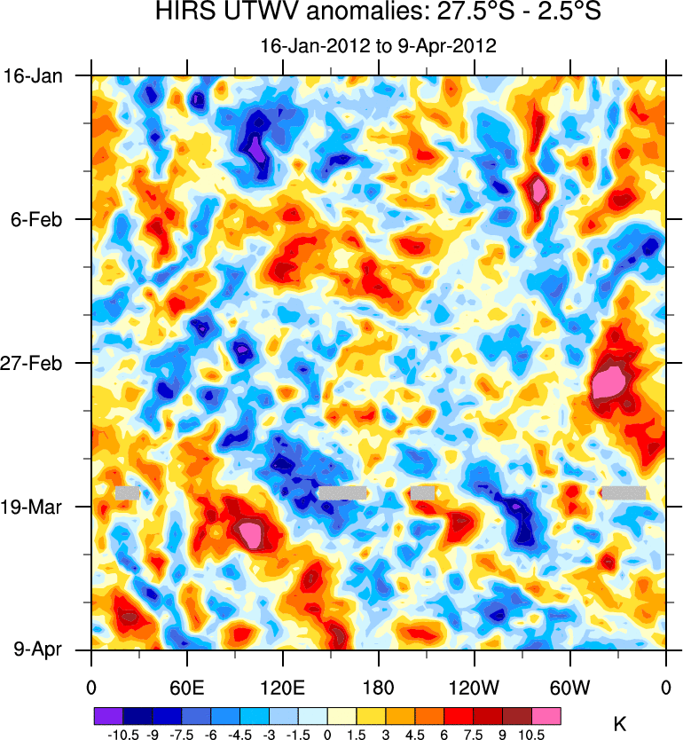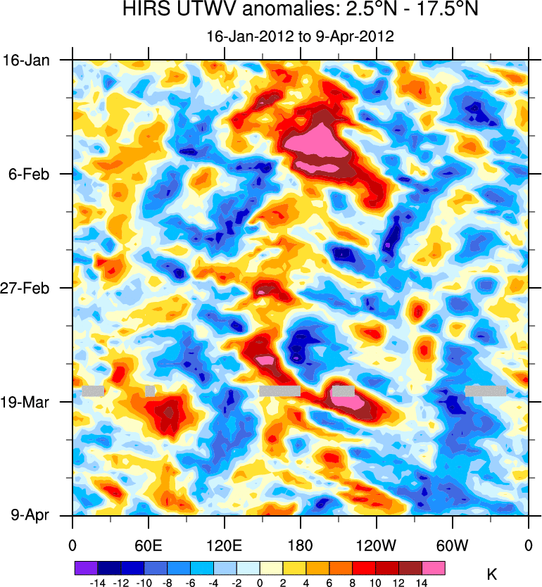 To identify tropical waves in near real-time, the OLR and UTWV data are filtered following Wheeler & Weickmann (2001 MWR). The daily anomalies are calculated using the first 3 harmonics of the seasonal cycle for 1979–2009. Missing values are then filled using linear interpolation in space and time. The most recent 365 days of anomalies are padded with 659 days of zeroes, and the result is filtered for each wave type.